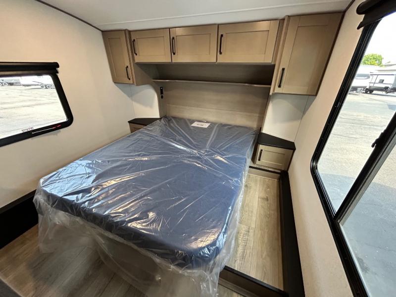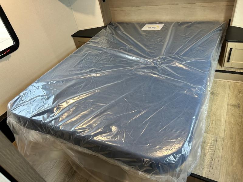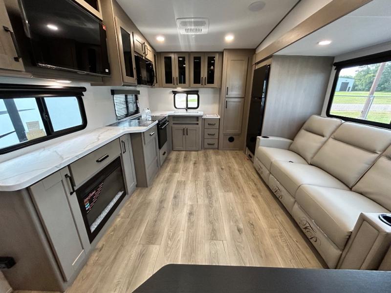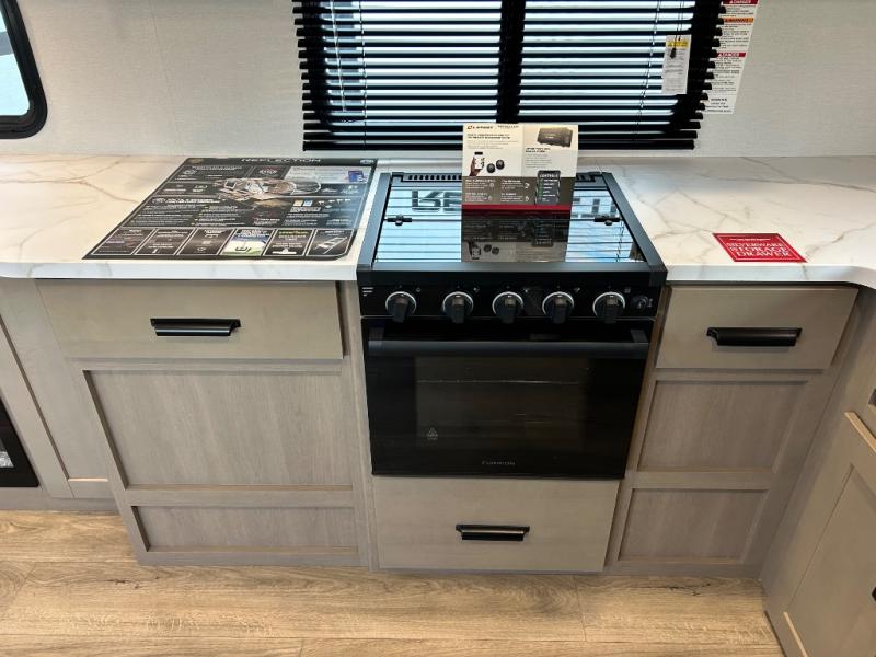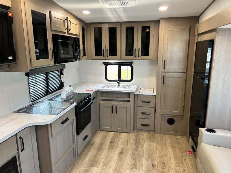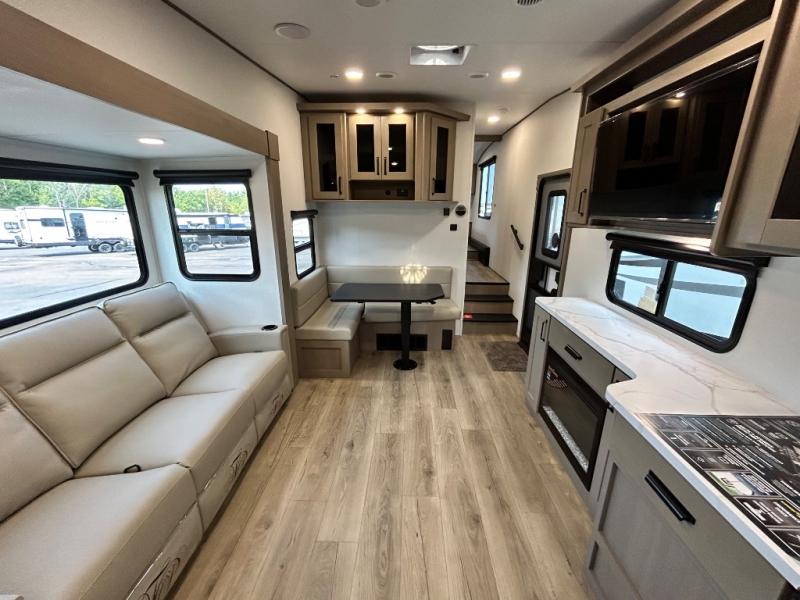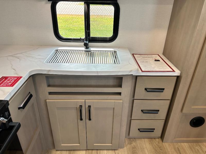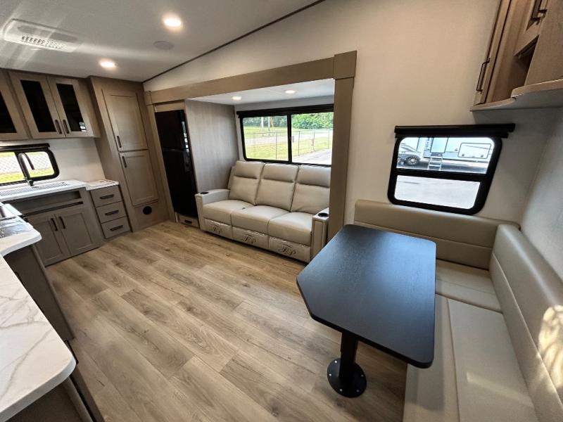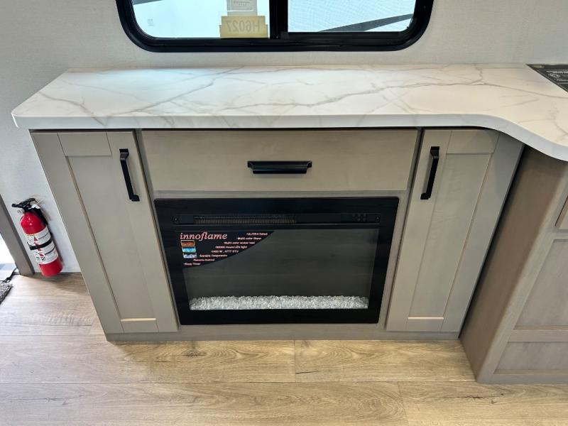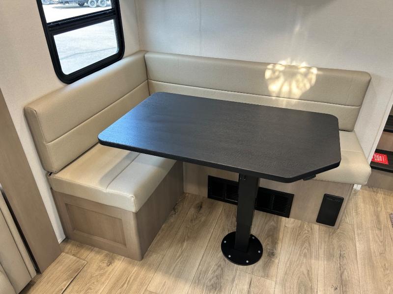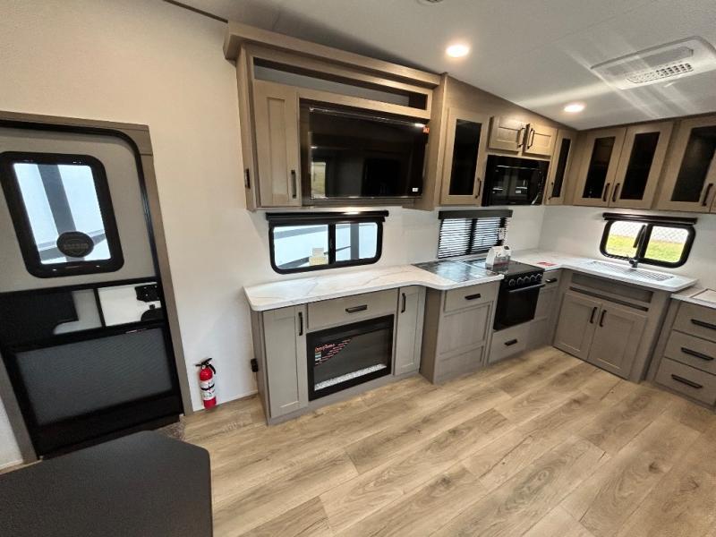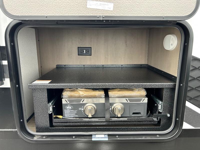 You will love this fifth wheel featuring a single slide for added interior living space and all the comforts and conveniences it provides you while you travel. The slide features a 78" theater seat plus there is a breakfast nook for more seating. Both can easily view the entertainment center with 40" TV. A rear kitchen indoors provides everything you need to create meals like home while on the road, and if you want to spend as much time outside as possible, then the outdoor griddle will certainly accommodate you for meals. Up front, a cozy private bedroom with queen bed, wardrobe, and overhead cabinets. Right next door, you will find a large walk-in shower, as well as a toilet, and a vanity with sink and linen cabinet for your towels and toiletries. You will also love the full unobstructed pass-through compartment for all of your gear, plus so much more!