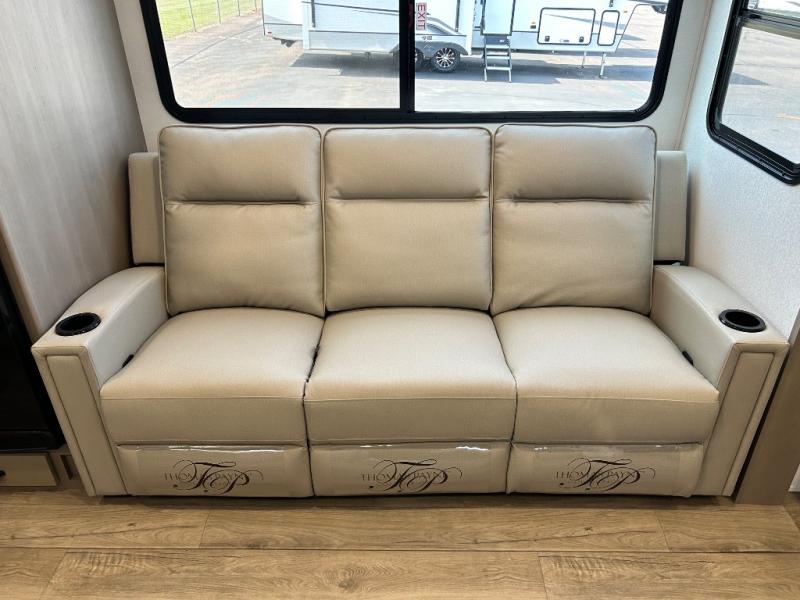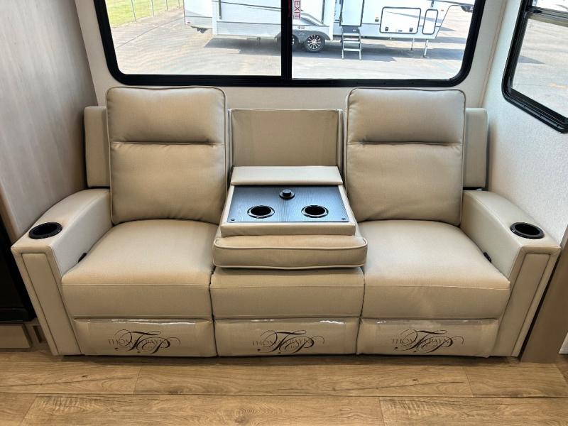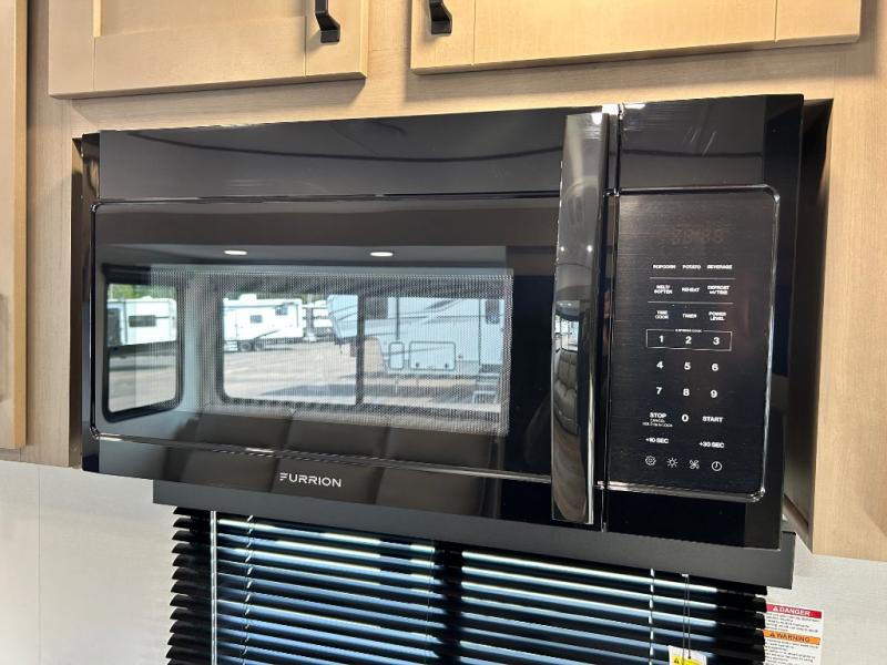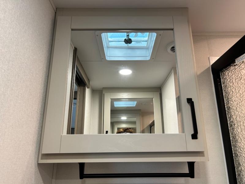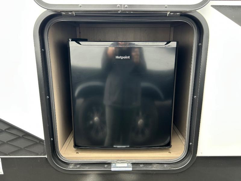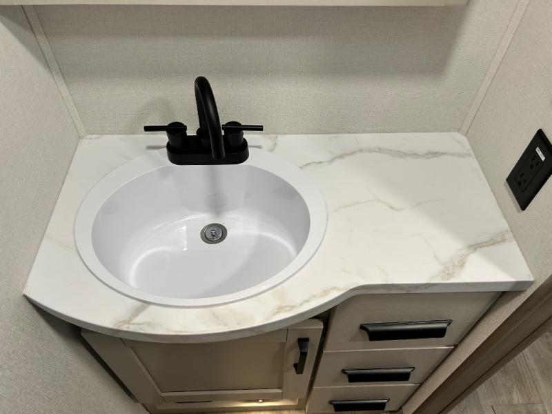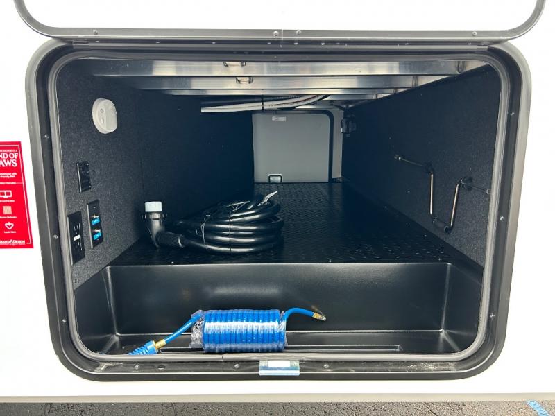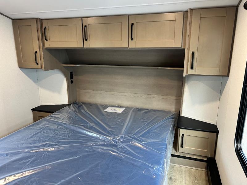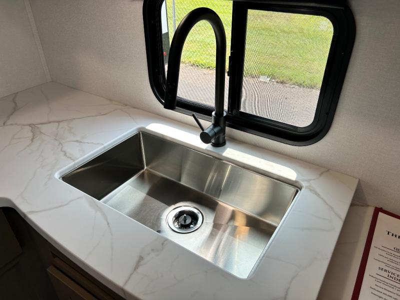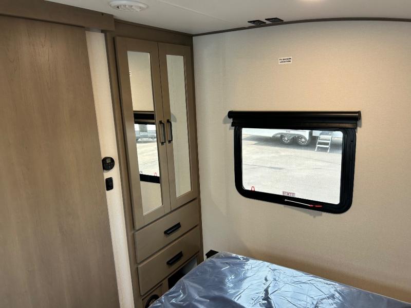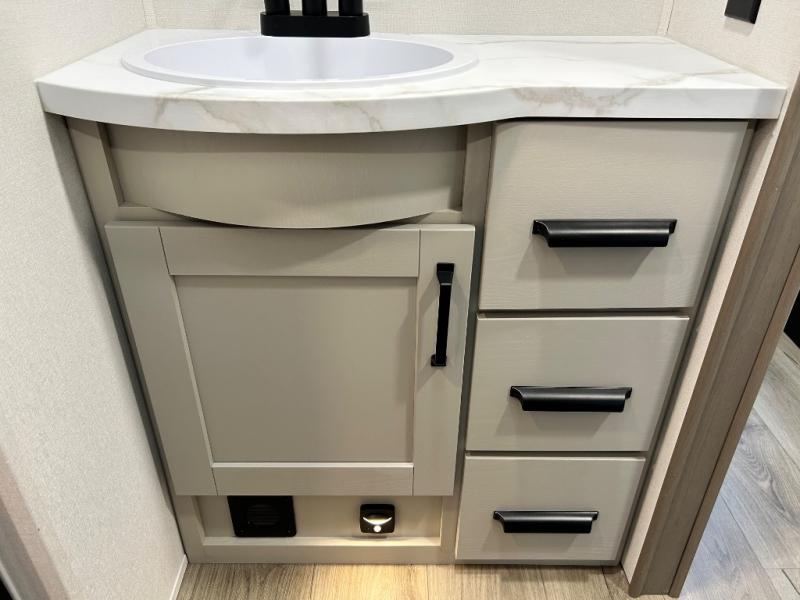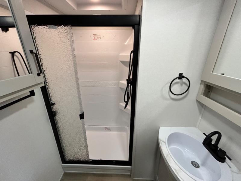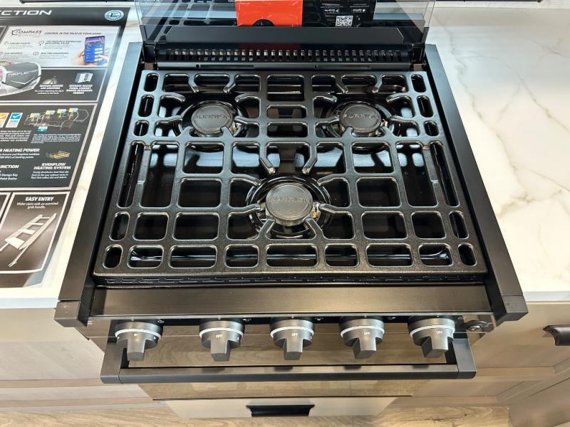 You will love this fifth wheel featuring a single slide for added interior living space and all the comforts and conveniences it provides you while you travel. The slide features a 78" theater seat plus there is a breakfast nook for more seating. Both can easily view the entertainment center with 40" TV. A rear kitchen indoors provides everything you need to create meals like home while on the road, and if you want to spend as much time outside as possible, then the outdoor griddle will certainly accommodate you for meals. Up front, a cozy private bedroom with queen bed, wardrobe, and overhead cabinets. Right next door, you will find a large walk-in shower, as well as a toilet, and a vanity with sink and linen cabinet for your towels and toiletries. You will also love the full unobstructed pass-through compartment for all of your gear, plus so much more!