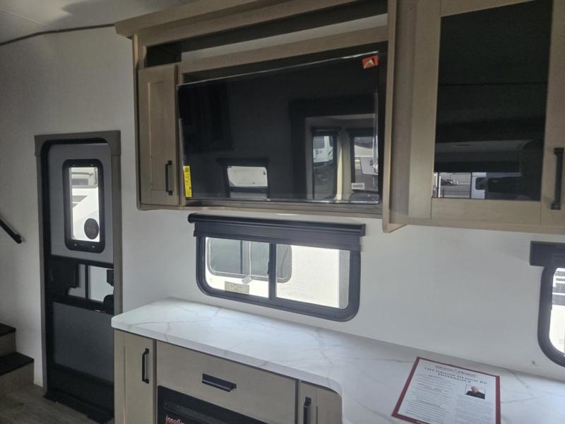 You will love this fifth wheel featuring a single slide for added interior living space and all the comforts and conveniences it provides you while you travel. The slide features a 78" theater seat plus there is a breakfast nook for more seating. Both can easily view the entertainment center with 40" TV. A rear kitchen indoors provides everything you need to create meals like home while on the road, and if you want to spend as much time outside as possible, then the outdoor griddle will certainly accommodate you for meals. Up front, a cozy private bedroom with queen bed, wardrobe, and overhead cabinets. Right next door, you will find a large walk-in shower, as well as a toilet, and a vanity with sink and linen cabinet for your towels and toiletries. You will also love the full unobstructed pass-through compartment for all of your gear, plus so much more!