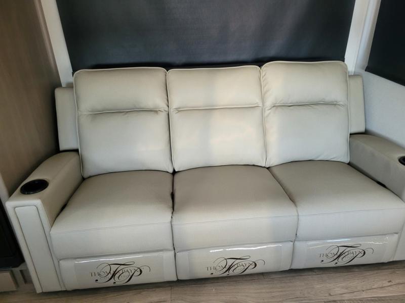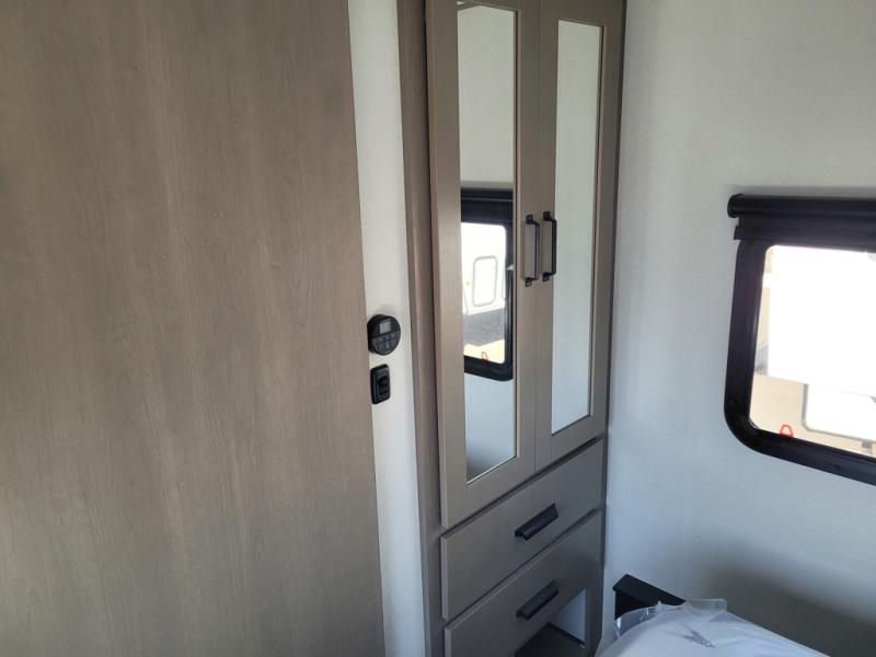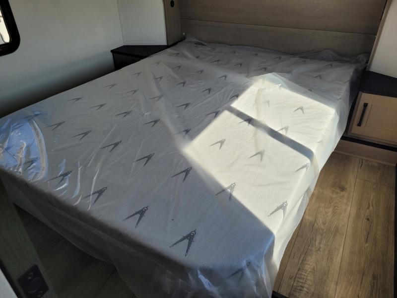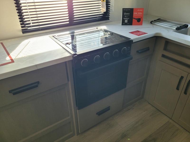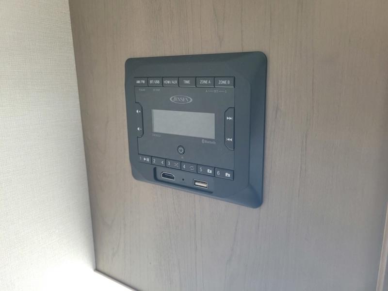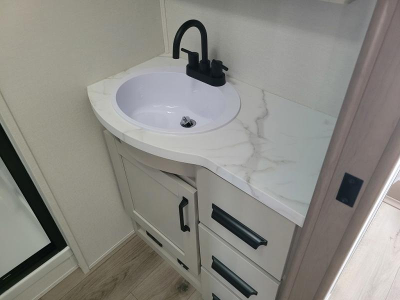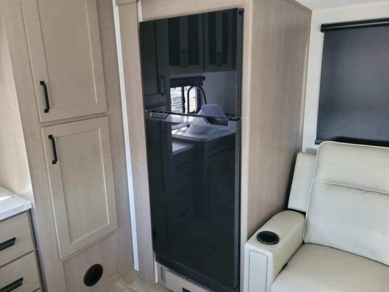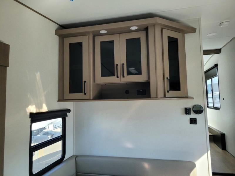 You will love this fifth wheel featuring a single slide for added interior living space and all the comforts and conveniences it provides you while you travel. The slide features a 78" theater seat plus there is a breakfast nook for more seating. Both can easily view the entertainment center with 40" TV. A rear kitchen indoors provides everything you need to create meals like home while on the road, and if you want to spend as much time outside as possible, then the outdoor griddle will certainly accommodate you for meals. Up front, a cozy private bedroom with queen bed, wardrobe, and overhead cabinets. Right next door, you will find a large walk-in shower, as well as a toilet, and a vanity with sink and linen cabinet for your towels and toiletries. You will also love the full unobstructed pass-through compartment for all of your gear, plus so much more!