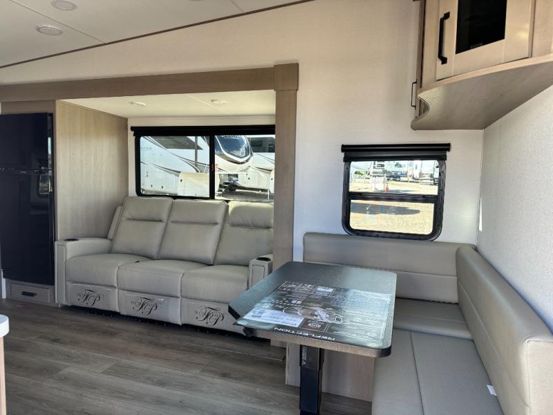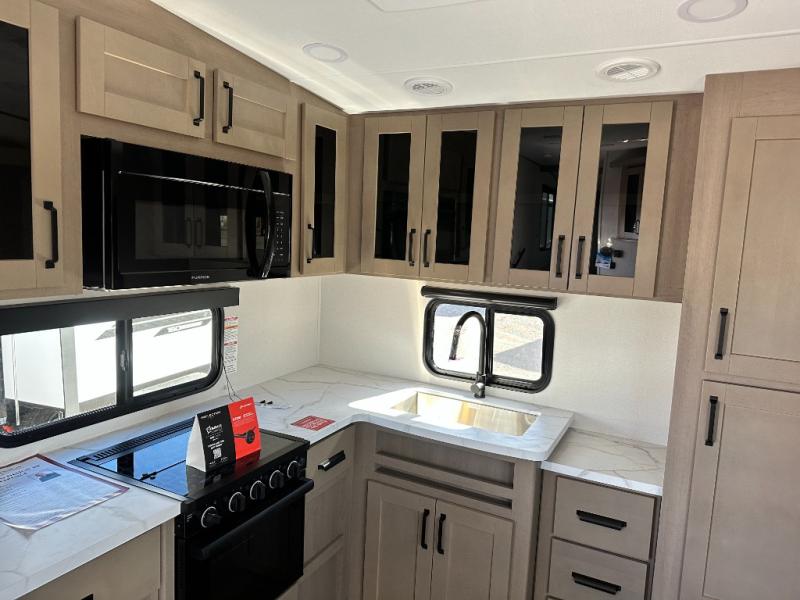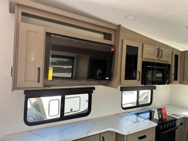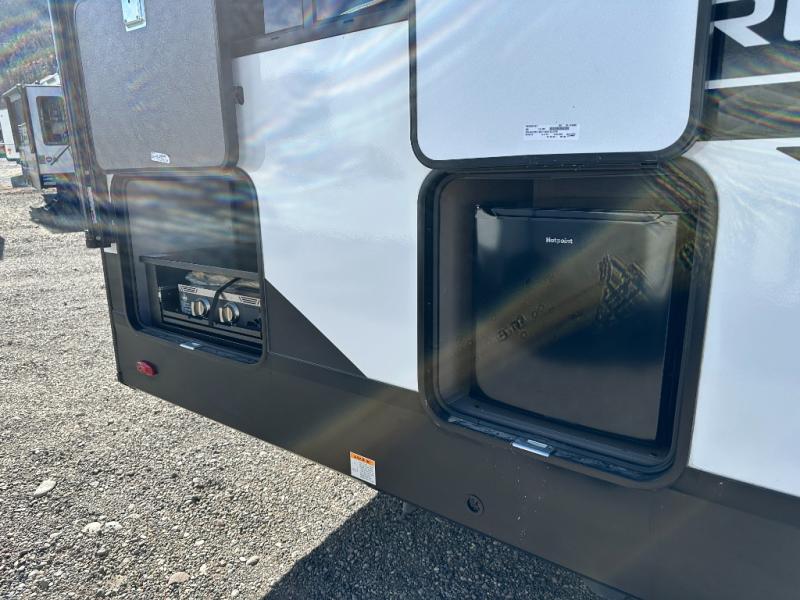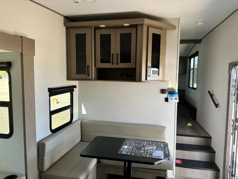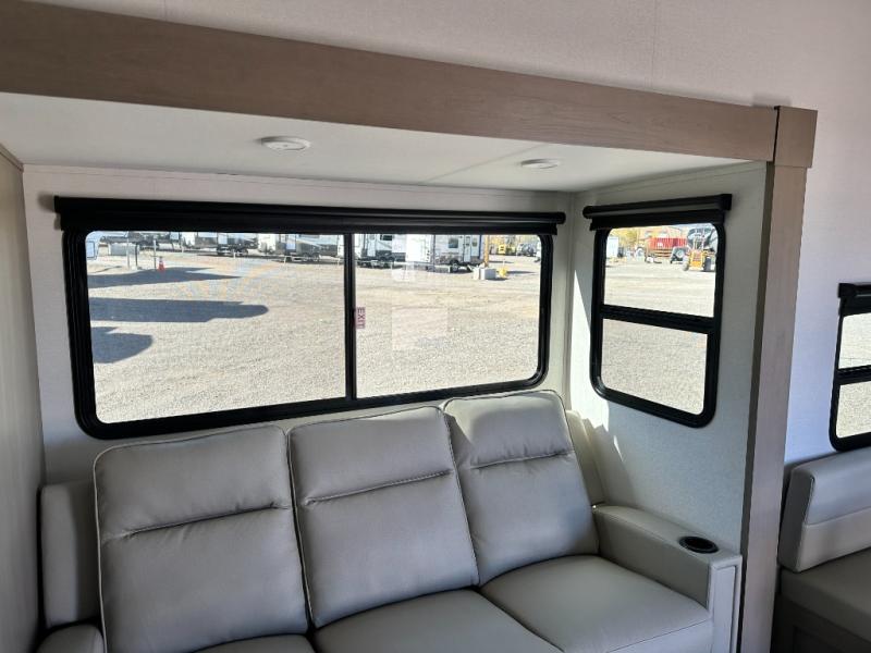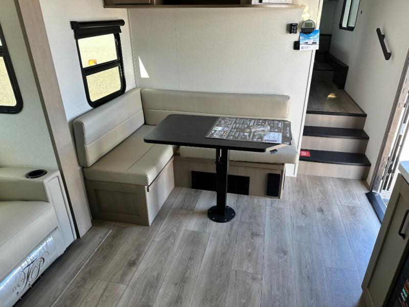 You will love this fifth wheel featuring a single slide for added interior living space and all the comforts and conveniences it provides you while you travel. The slide features a 78" theater seat plus there is a breakfast nook for more seating. Both can easily view the entertainment center with 40" TV. A rear kitchen indoors provides everything you need to create meals like home while on the road, and if you want to spend as much time outside as possible, then the outdoor griddle will certainly accommodate you for meals. Up front, a cozy private bedroom with queen bed, wardrobe, and overhead cabinets. Right next door, you will find a large walk-in shower, as well as a toilet, and a vanity with sink and linen cabinet for your towels and toiletries. You will also love the full unobstructed pass-through compartment for all of your gear, plus so much more!