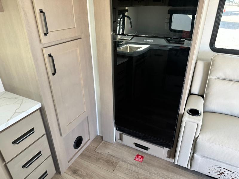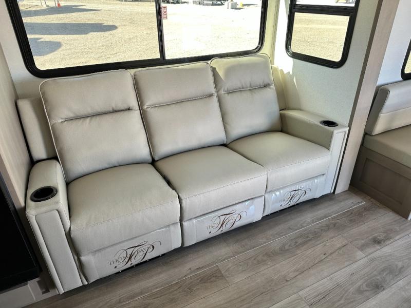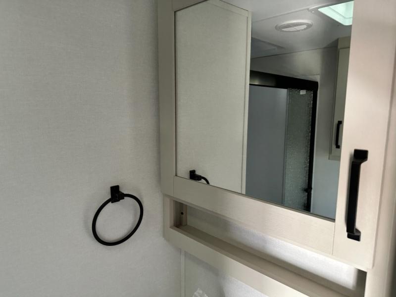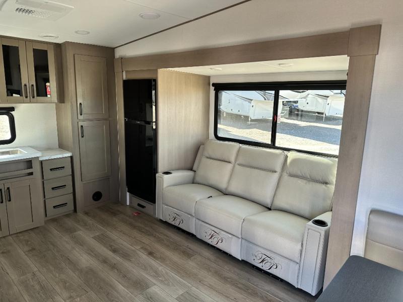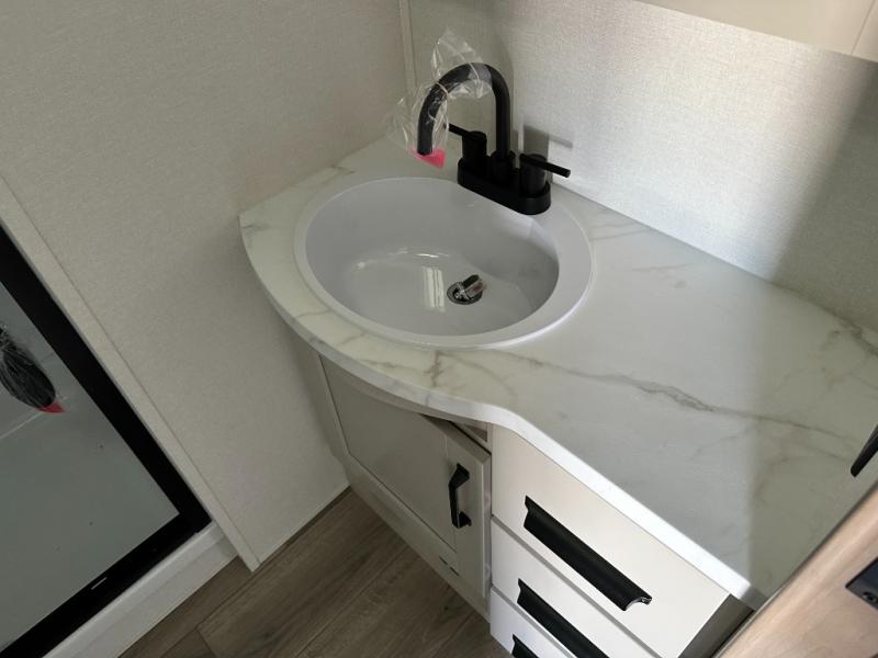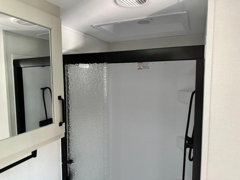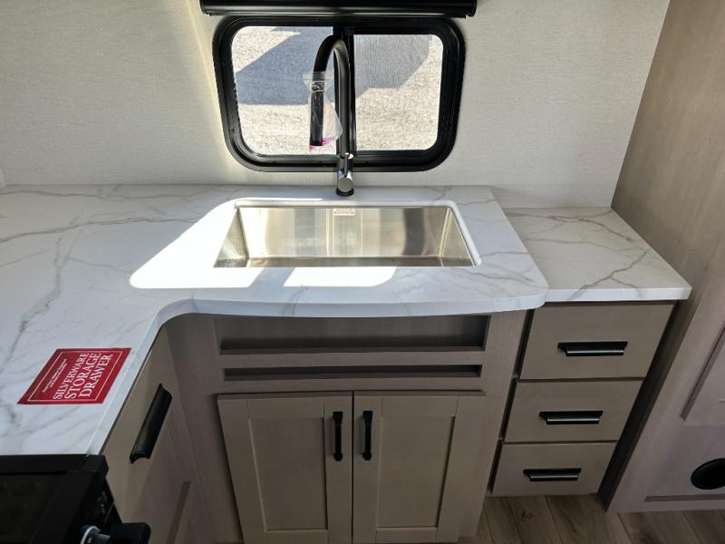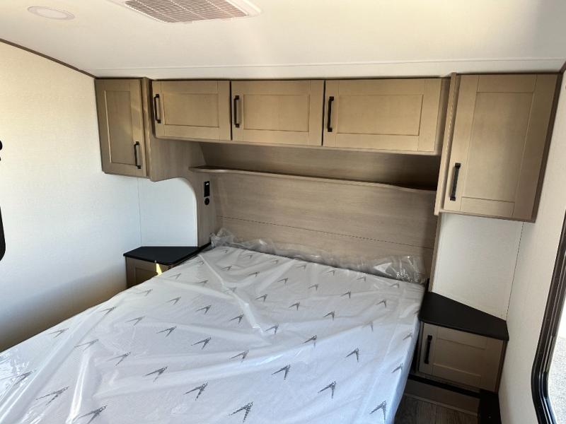You will love this fifth wheel featuring a single slide for added interior living space and all the comforts and conveniences it provides you while you travel. The slide features a 78" theater seat plus there is a breakfast nook for more seating. Both can easily view the entertainment center with 40" TV. A rear kitchen indoors provides everything you need to create meals like home while on the road, and if you want to spend as much time outside as possible, then the outdoor griddle will certainly accommodate you for meals. Up front, a cozy private bedroom with queen bed, wardrobe, and overhead cabinets. Right next door, you will find a large walk-in shower, as well as a toilet, and a vanity with sink and linen cabinet for your towels and toiletries. You will also love the full unobstructed pass-through compartment for all of your gear, plus so much more!