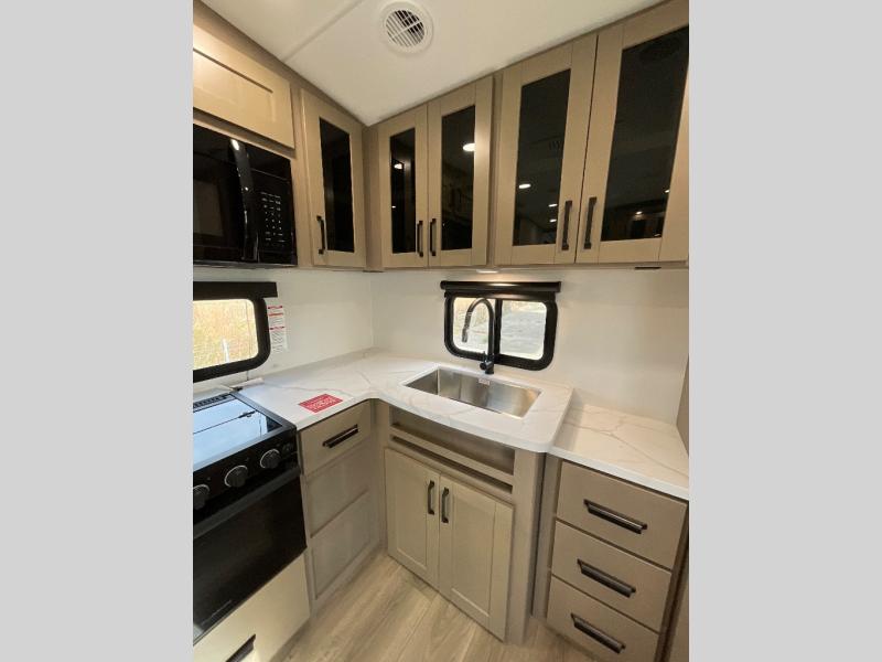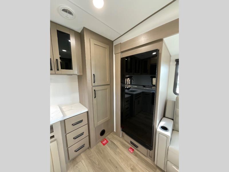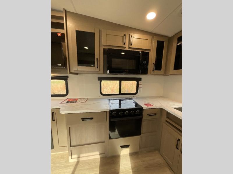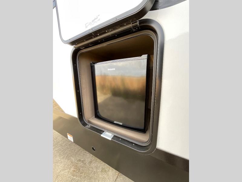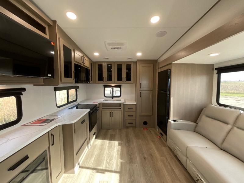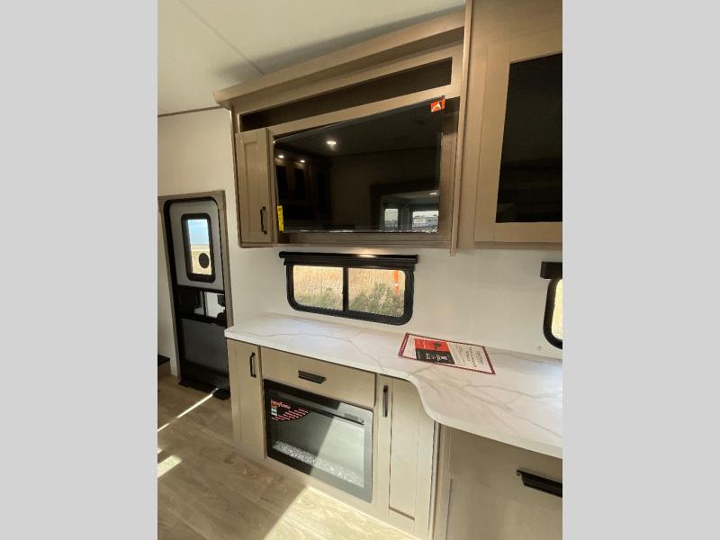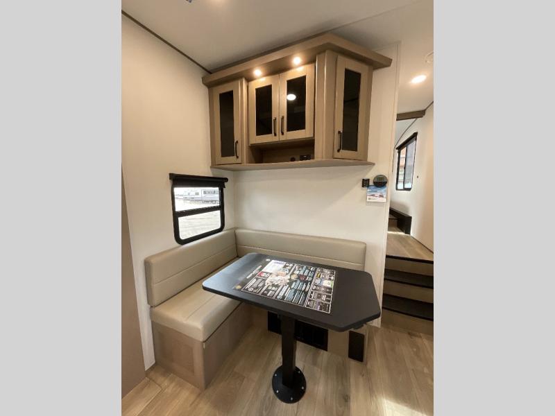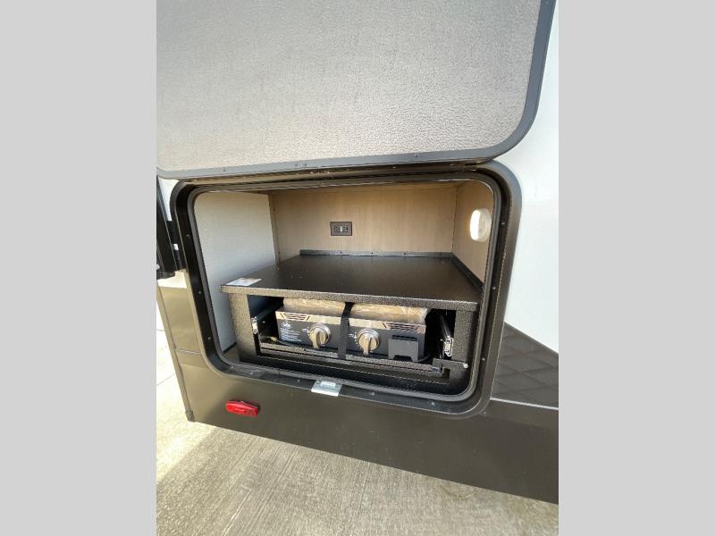 You will love this fifth wheel featuring a single slide for added interior living space and all the comforts and conveniences it provides you while you travel. The slide features a 78" theater seat plus there is a breakfast nook for more seating. Both can easily view the entertainment center with 40" TV. A rear kitchen indoors provides everything you need to create meals like home while on the road, and if you want to spend as much time outside as possible, then the outdoor griddle will certainly accommodate you for meals. Up front, a cozy private bedroom with queen bed, wardrobe, and overhead cabinets. Right next door, you will find a large walk-in shower, as well as a toilet, and a vanity with sink and linen cabinet for your towels and toiletries. You will also love the full unobstructed pass-through compartment for all of your gear, plus so much more!