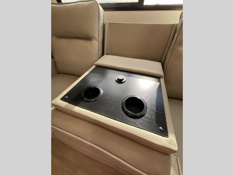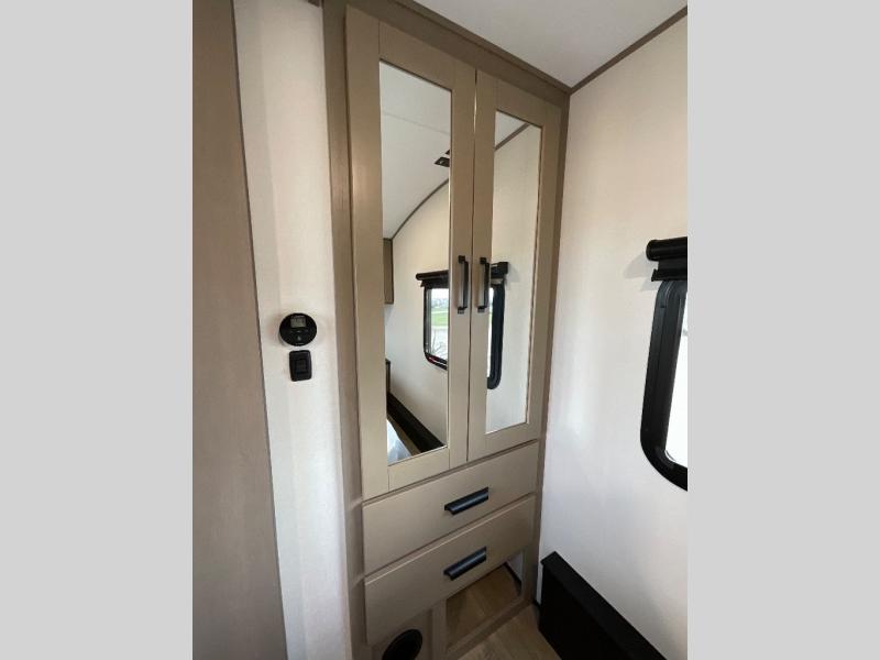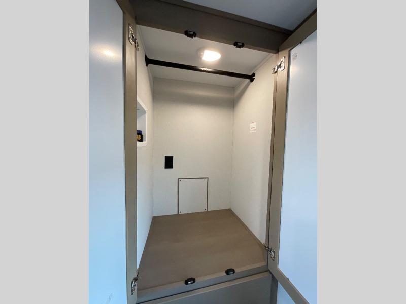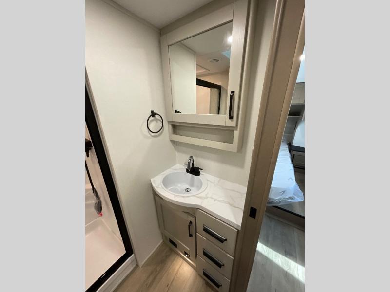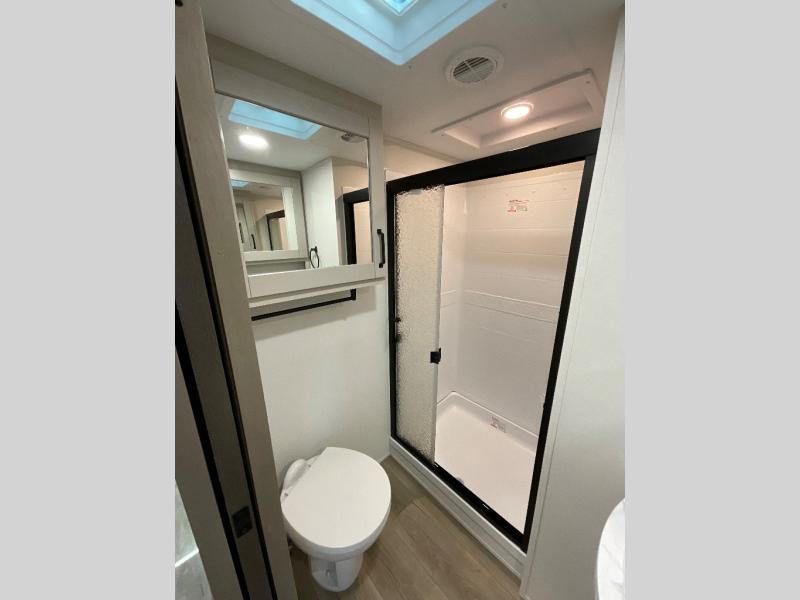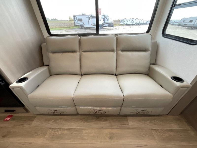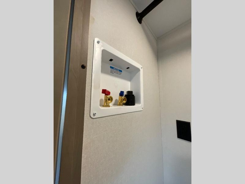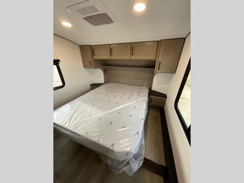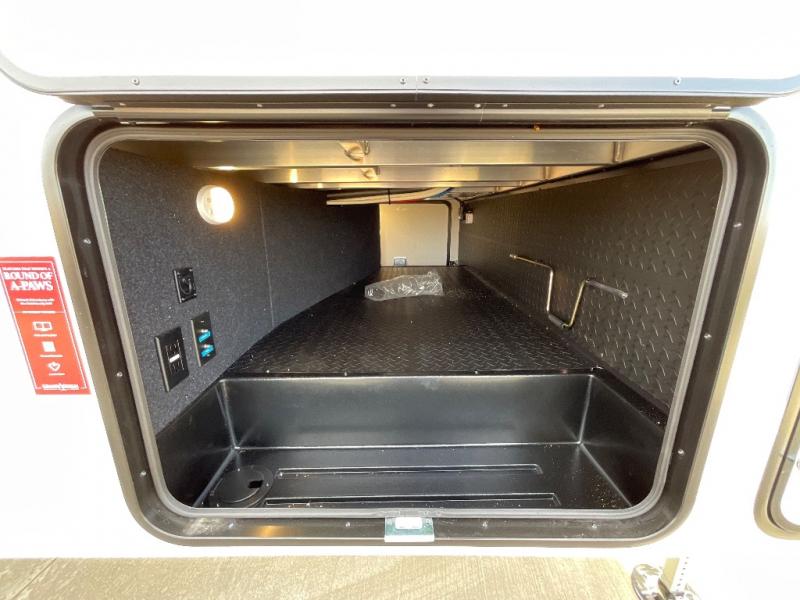 You will love this fifth wheel featuring a single slide for added interior living space and all the comforts and conveniences it provides you while you travel. The slide features a 78" theater seat plus there is a breakfast nook for more seating. Both can easily view the entertainment center with 40" TV. A rear kitchen indoors provides everything you need to create meals like home while on the road, and if you want to spend as much time outside as possible, then the outdoor griddle will certainly accommodate you for meals. Up front, a cozy private bedroom with queen bed, wardrobe, and overhead cabinets. Right next door, you will find a large walk-in shower, as well as a toilet, and a vanity with sink and linen cabinet for your towels and toiletries. You will also love the full unobstructed pass-through compartment for all of your gear, plus so much more!