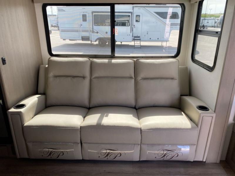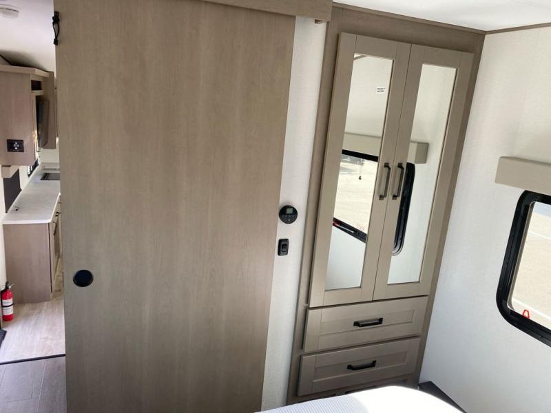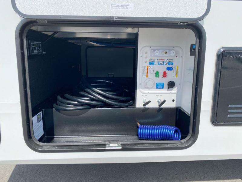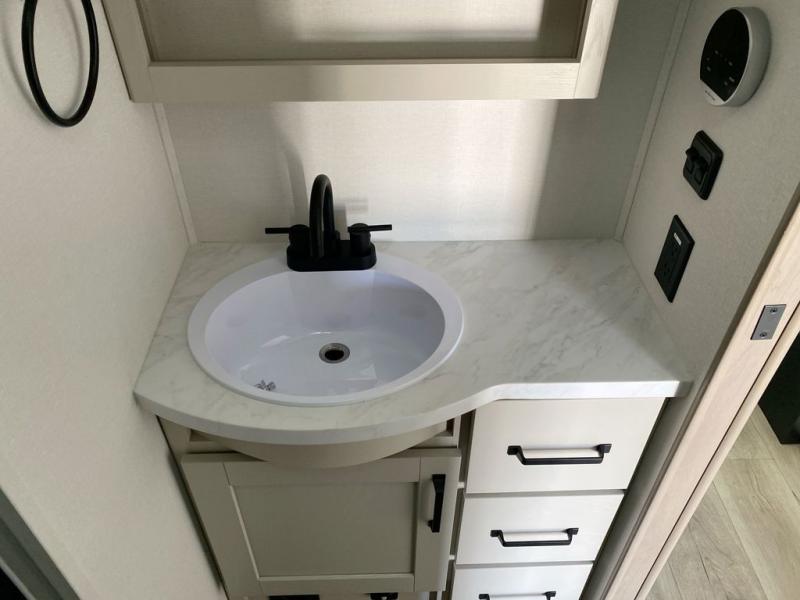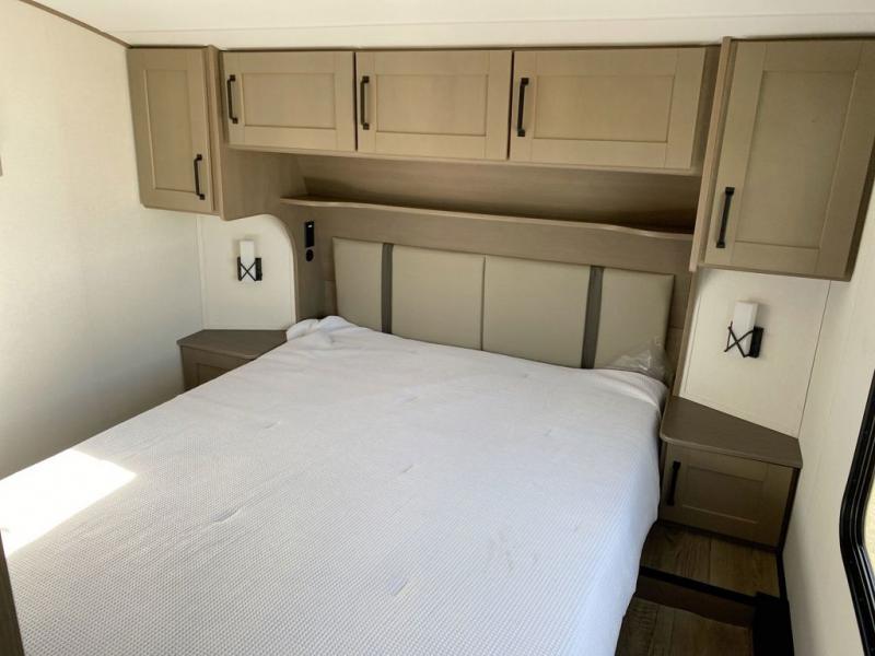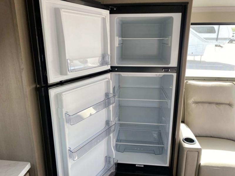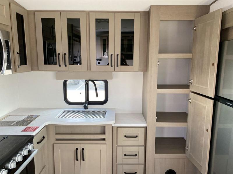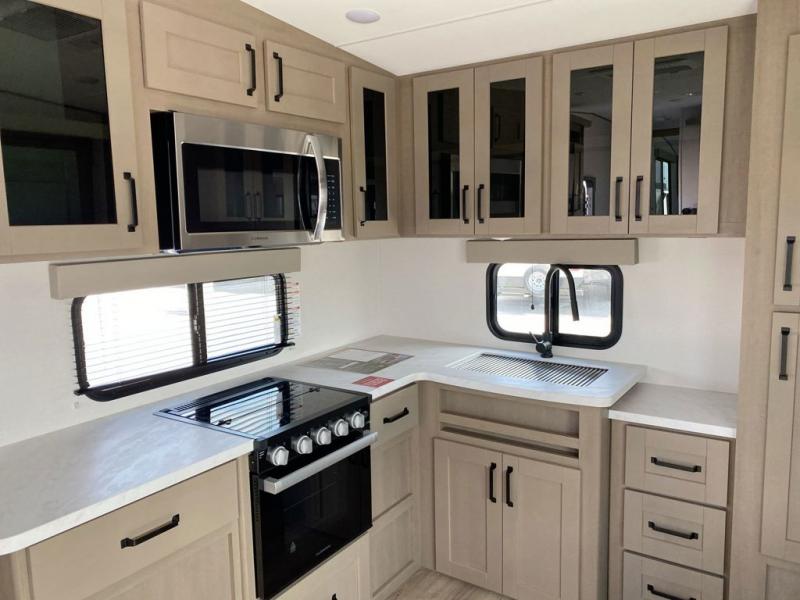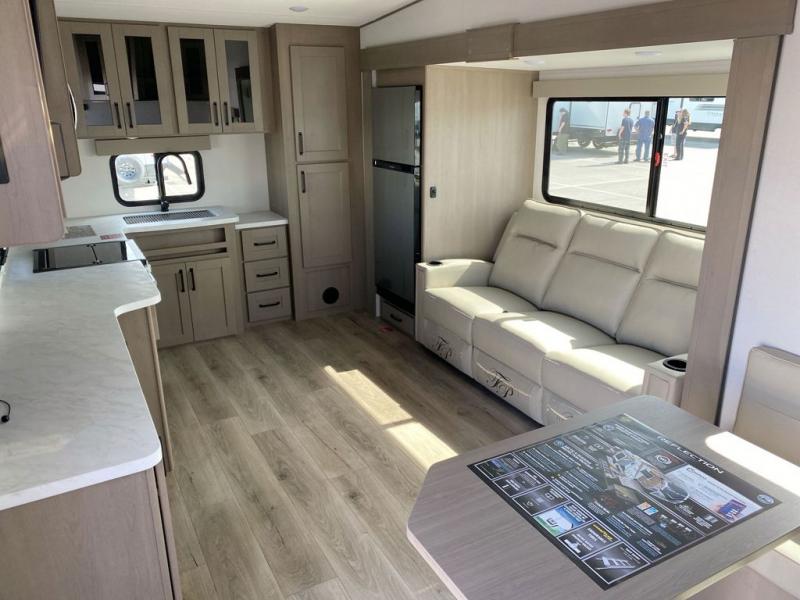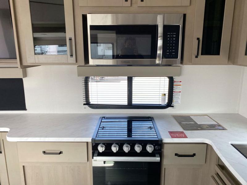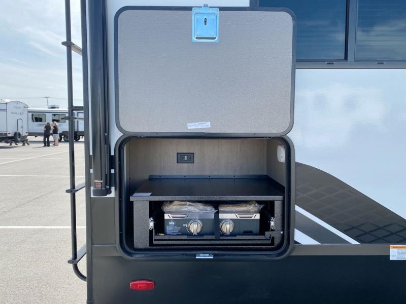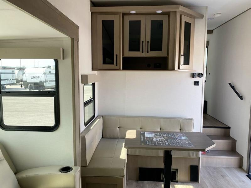 You will love this fifth wheel featuring a single slide for added interior living space and all the comforts and conveniences it provides you while you travel. The slide features a 78" theater seat plus there is a breakfast nook for more seating. Both can easily view the entertainment center with 40" TV. A rear kitchen indoors provides everything you need to create meals like home while on the road, and if you want to spend as much time outside as possible, then the outdoor griddle will certainly accommodate you for meals. Up front, a cozy private bedroom with queen bed, wardrobe, and overhead cabinets. Right next door, you will find a large walk-in shower, as well as a toilet, and a vanity with sink and linen cabinet for your towels and toiletries. You will also love the full unobstructed pass-through compartment for all of your gear, plus so much more!