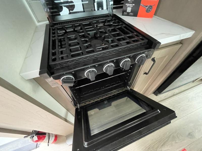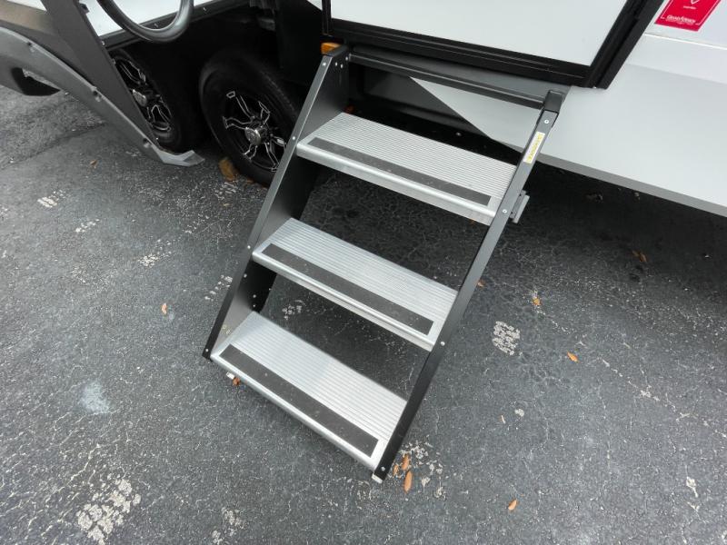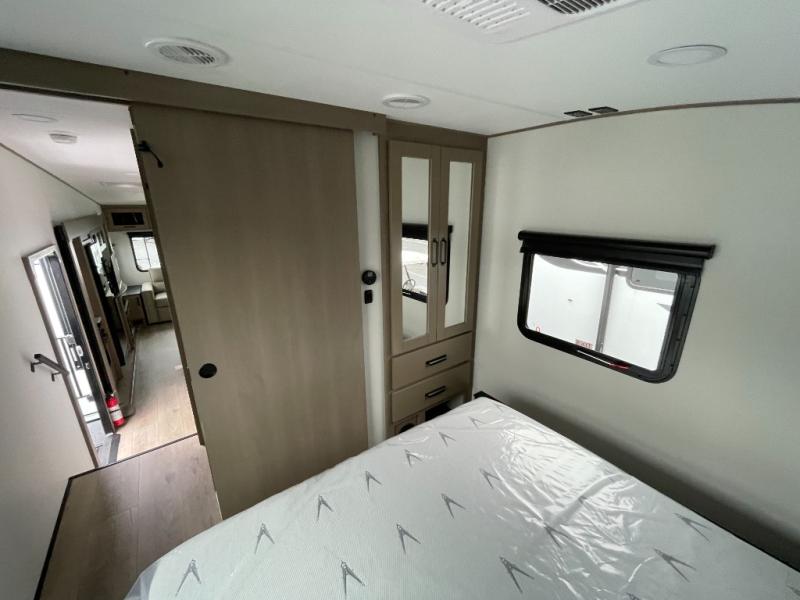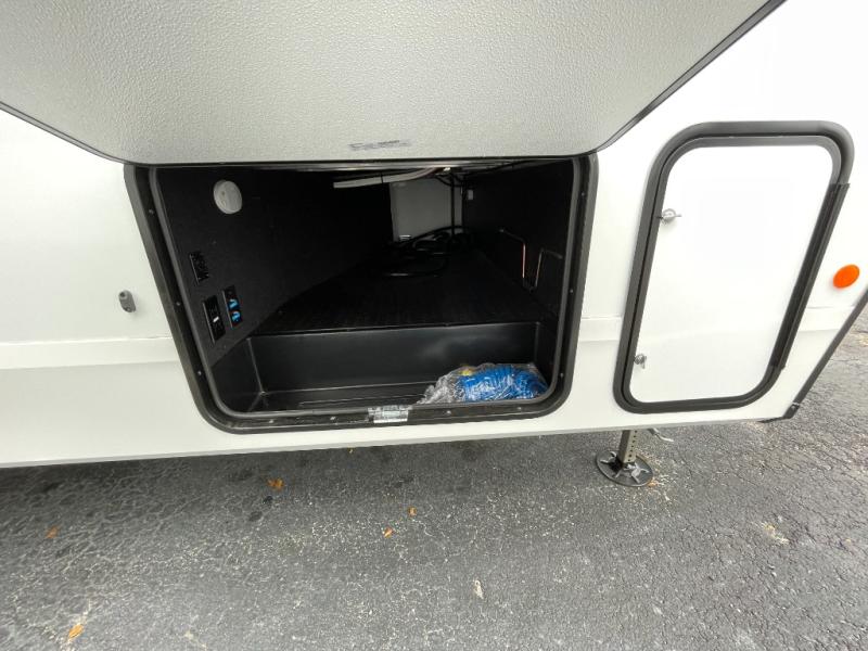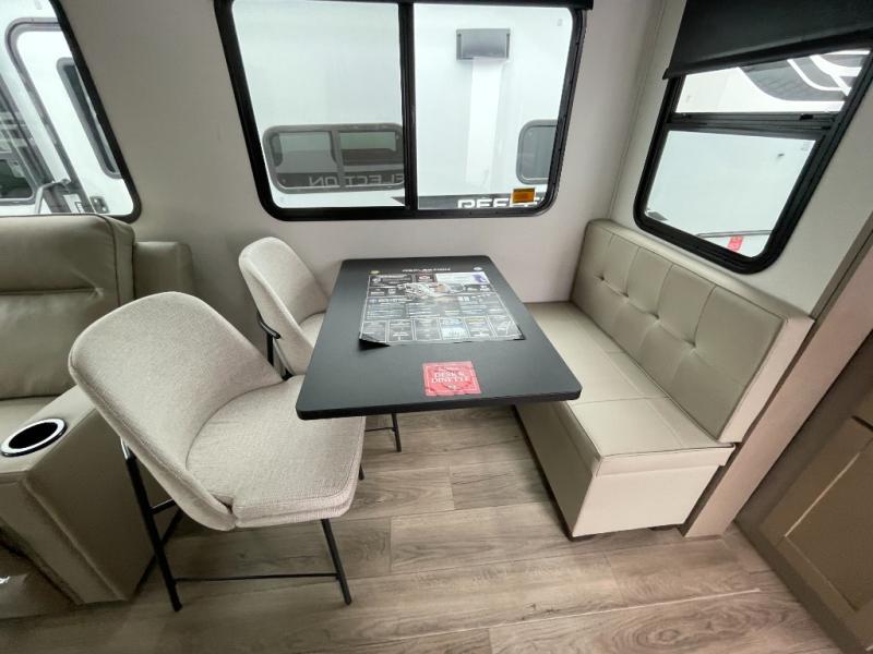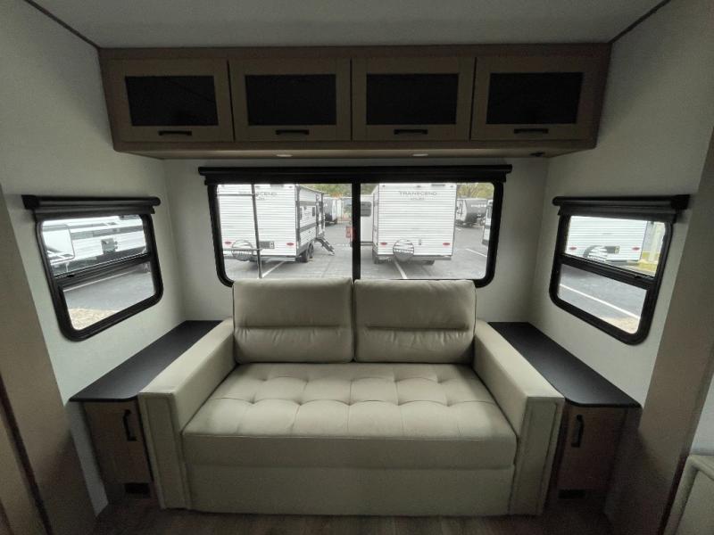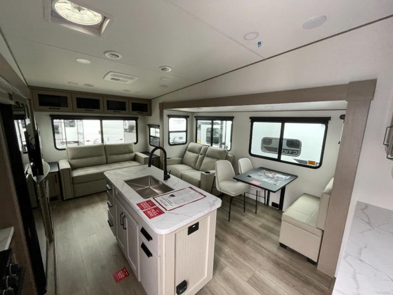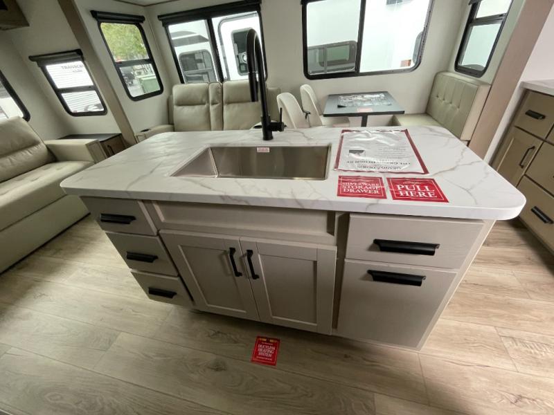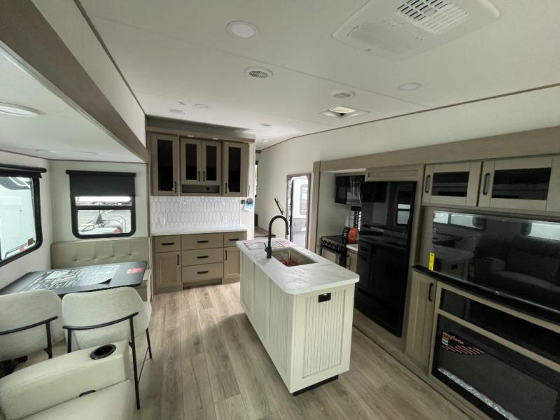 You'll love the amount of space in this fifth wheel thanks to the dual opposing slides in the combined kitchen and rear living room. This will give the chef of your group plenty of space to prep food at the spacious kitchen island while everyone visits on the theater seating, booth dinette and tri-fold sofa. There is also an entertainment center with a 40" TV and fireplace to make your space cozier, and you have the option to choose a swivel dinette in place of the standard booth dinette if you choose! A spacious bath will let you stay clean throughout each trip, and a front private bedroom with a walk-around queen bed will make you feel right at home. There is also TV prep here, plus a wardrobe with washer/dryer prep if you choose to add those appliances!