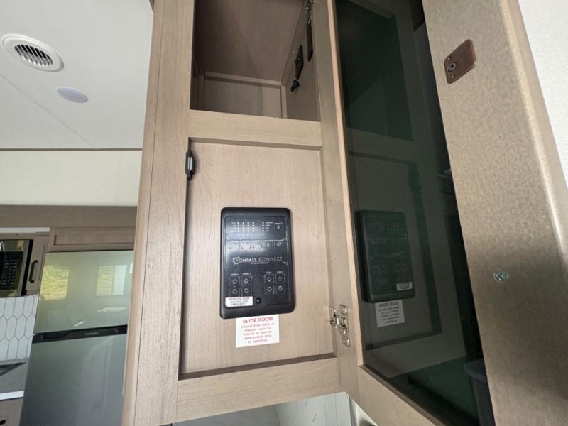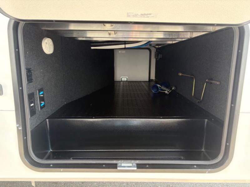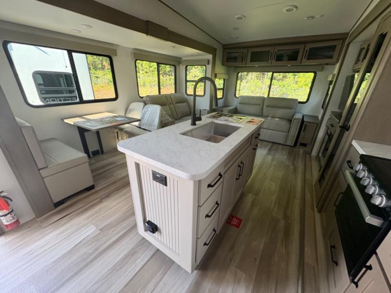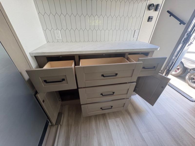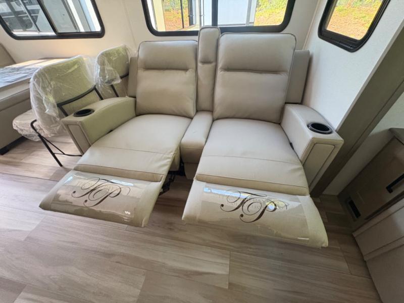 Get ready to enjoy everything the campgrounds and surrounding area has to offer when you are setup to camp in this fifth wheel! The two electric awnings offer protected areas creating outdoor living spaces; just grab your camping chairs from the unobstructed pass-through storage. And the interior offers a spacious living area and kitchen combination with dual opposing slides for maximum space. You can sit on the tri-fold sofa or the booth dinette with an option for a swivel dinette. The hutch and kitchen island offer counter space to prepare and serve meals, and there is a large pantry for goodies. The 40" LED HDTV with a fireplace below provides entertainment before bedtime or on a rainy day. And the front bedroom offers privacy, a walk-around queen bed, and plenty of storage!