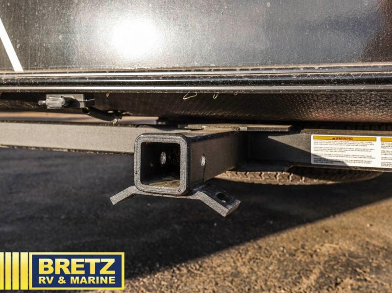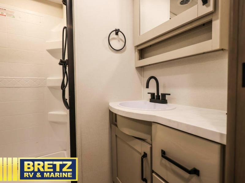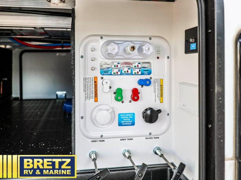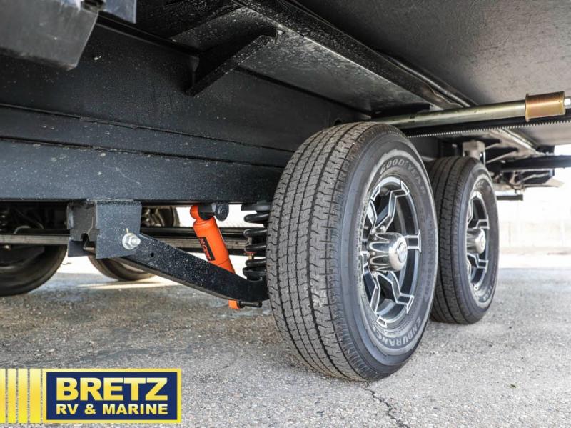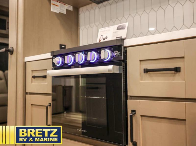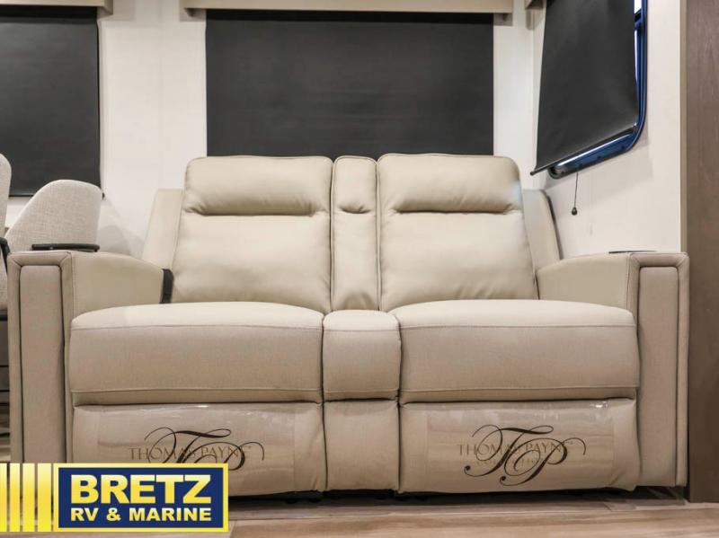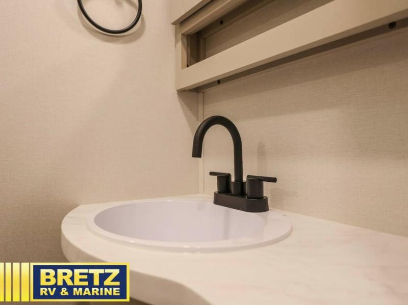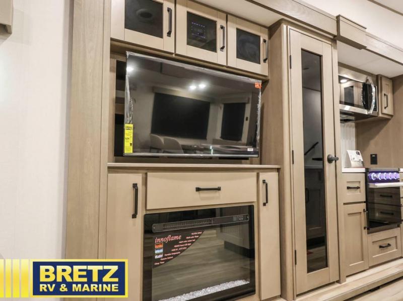 Get ready to enjoy everything the campgrounds and surrounding area has to offer when you are setup to camp in this fifth wheel! The two electric awnings offer protected areas creating outdoor living spaces; just grab your camping chairs from the unobstructed pass-through storage. And the interior offers a spacious living area and kitchen combination with dual opposing slides for maximum space. You can sit on the tri-fold sofa or the booth dinette with an option for a swivel dinette. The hutch and kitchen island offer counter space to prepare and serve meals, and there is a large pantry for goodies. The 40" LED HDTV with a fireplace below provides entertainment before bedtime or on a rainy day. And the front bedroom offers privacy, a walk-around queen bed, and plenty of storage!