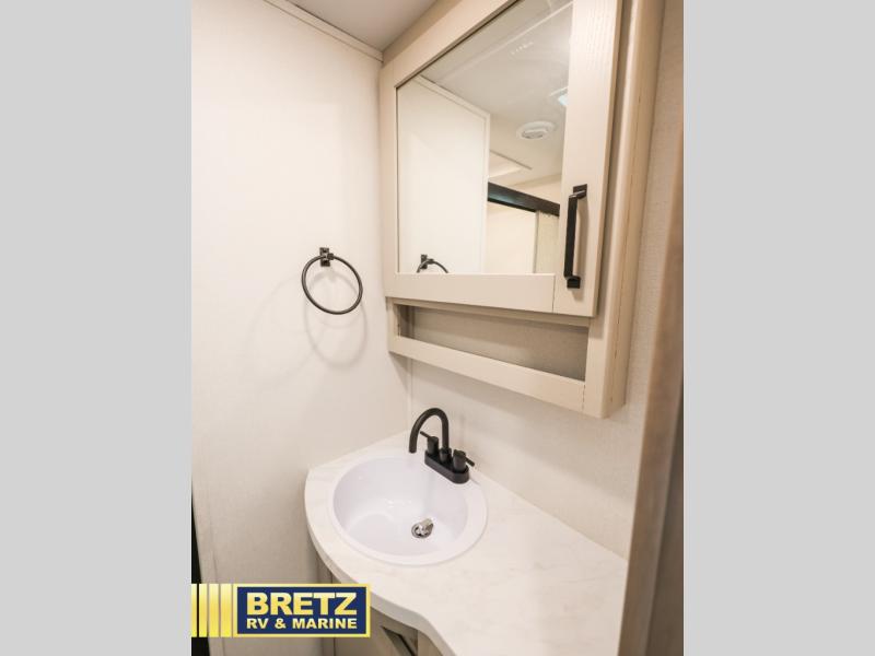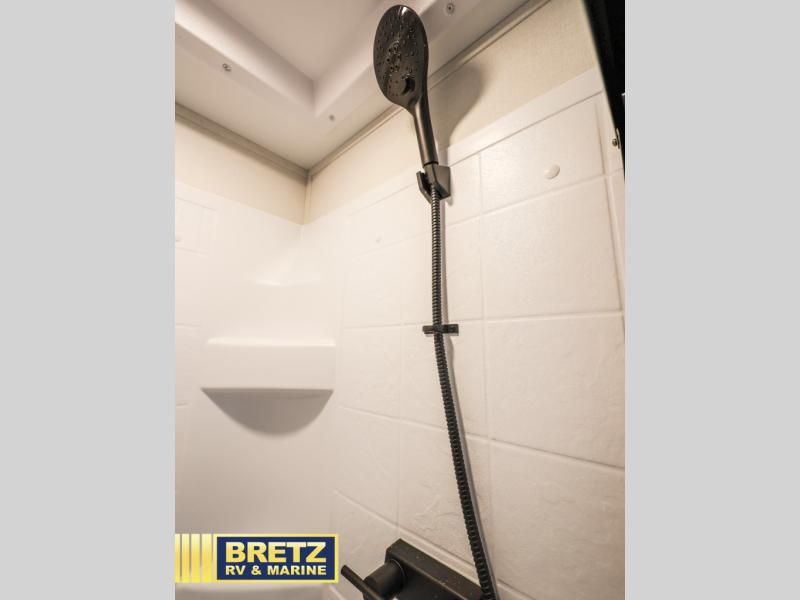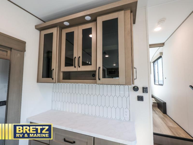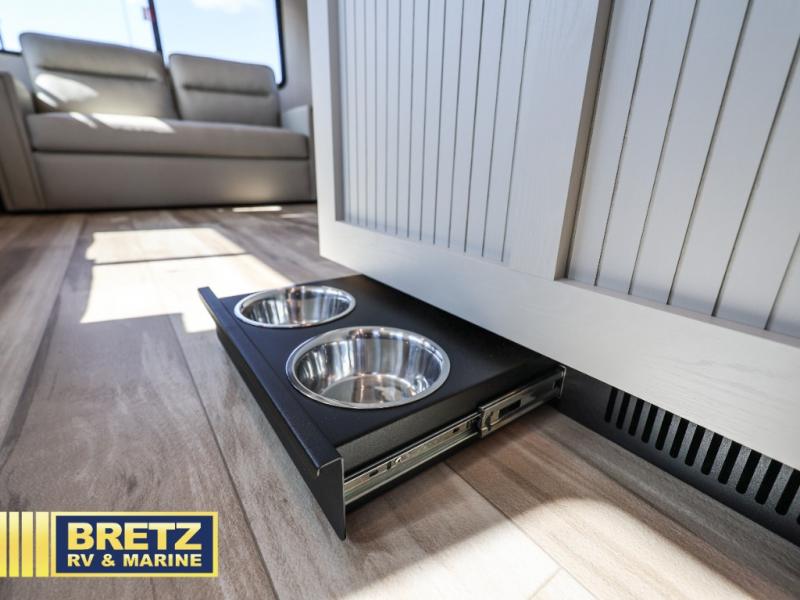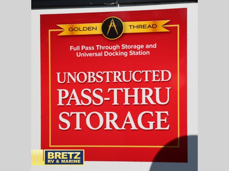 Get ready to enjoy everything the campgrounds and surrounding area has to offer when you are setup to camp in this fifth wheel! The two electric awnings offer protected areas creating outdoor living spaces; just grab your camping chairs from the unobstructed pass-through storage. And the interior offers a spacious living area and kitchen combination with dual opposing slides for maximum space. You can sit on the tri-fold sofa or the booth dinette with an option for a swivel dinette. The hutch and kitchen island offer counter space to prepare and serve meals, and there is a large pantry for goodies. The 40" LED HDTV with a fireplace below provides entertainment before bedtime or on a rainy day. And the front bedroom offers privacy, a walk-around queen bed, and plenty of storage!