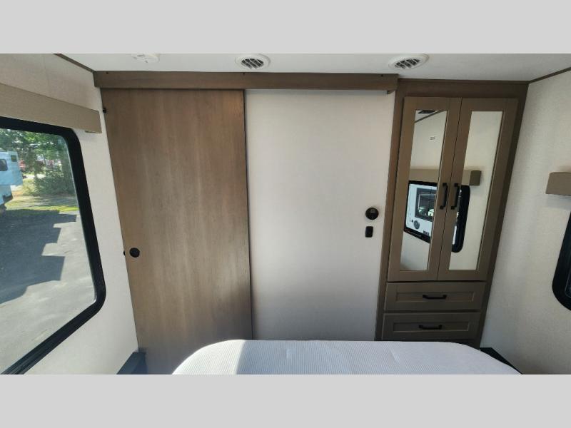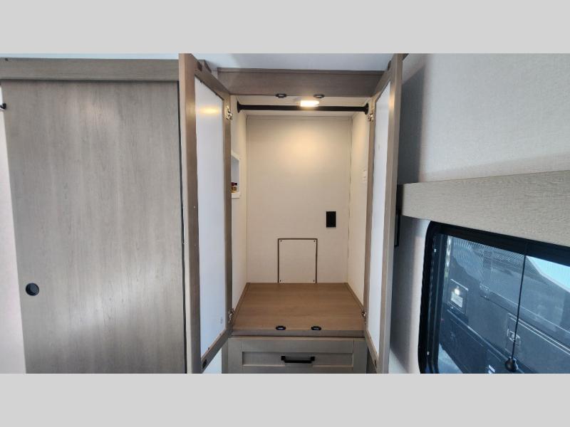 Includes a walk-around queen bed, wardrobe storage, overhead cabinets, and washer/dryer prep. -
