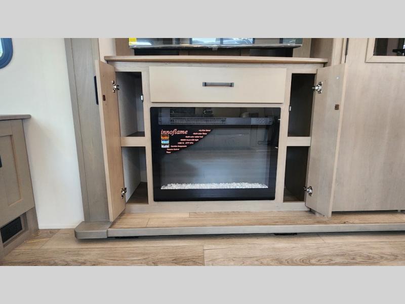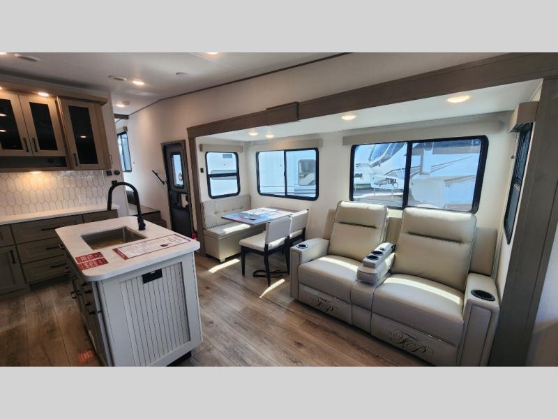 This Unit Includes $18,975 in Options, Featuring a Kitchen Island; Theater Seats; Fireplace; Pantry; Hutch; Walk-Around Queen Bed; 2 Electric Awnings; Heated Pass-Through Storage