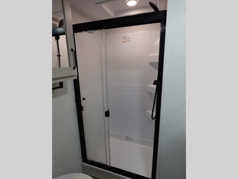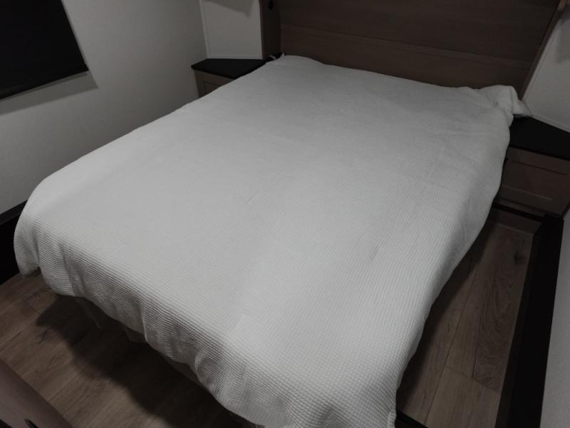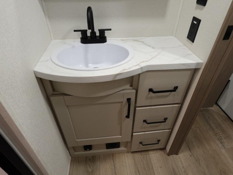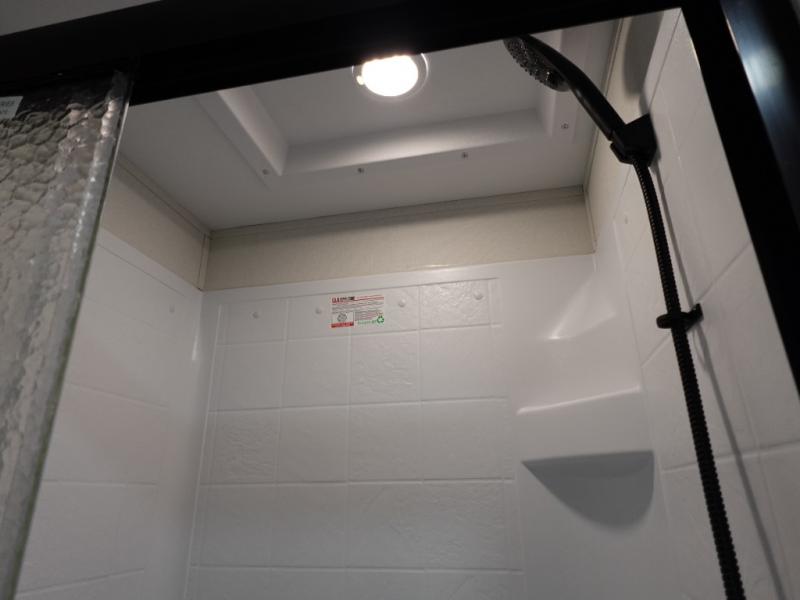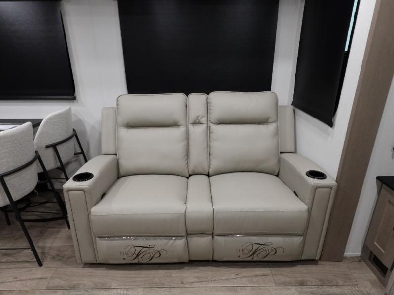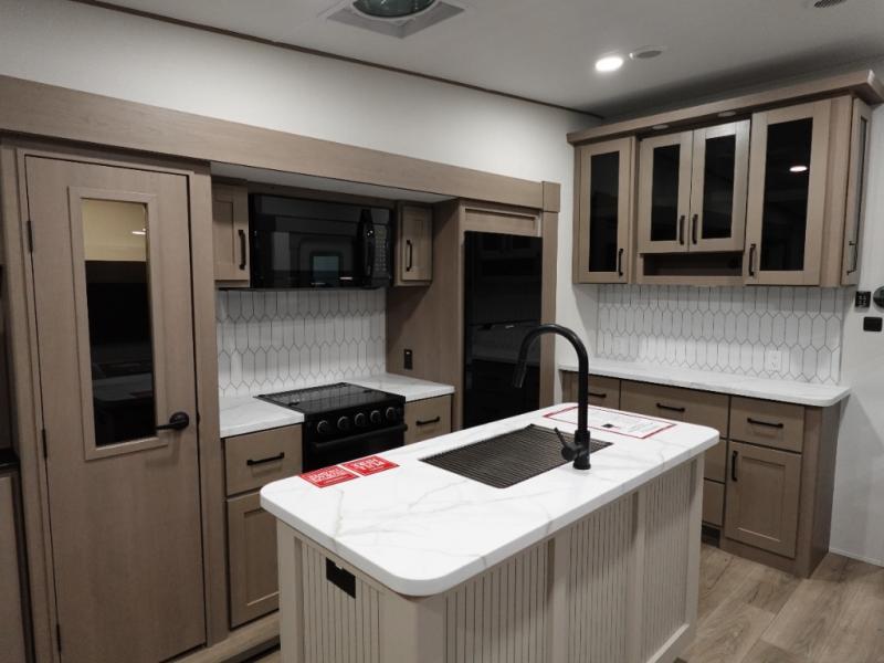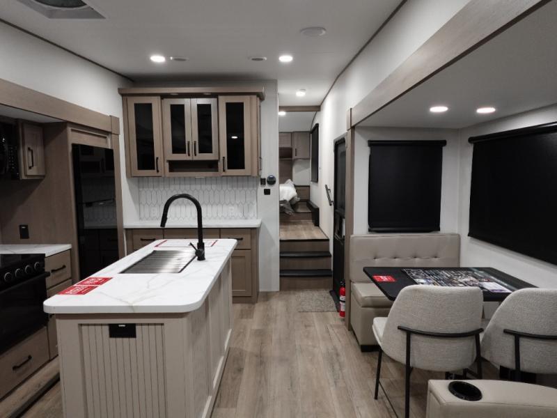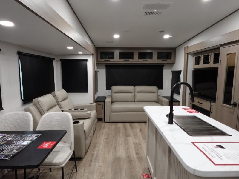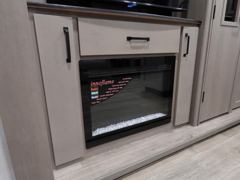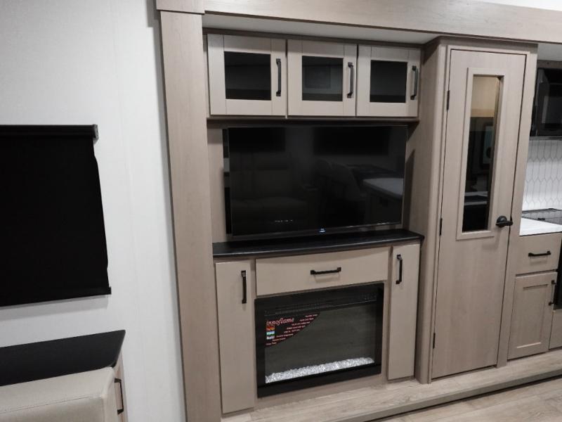 Get ready to enjoy everything the campgrounds and surrounding area has to offer when you are setup to camp in this fifth wheel! The two electric awnings offer protected areas creating outdoor living spaces; just grab your camping chairs from the unobstructed pass-through storage. And the interior offers a spacious living area and kitchen combination with dual opposing slides for maximum space. You can sit on the tri-fold sofa or the booth dinette with an option for a swivel dinette. The hutch and kitchen island offer counter space to prepare and serve meals, and there is a large pantry for goodies. The 40" LED HDTV with a fireplace below provides entertainment before bedtime or on a rainy day. And the front bedroom offers privacy, a walk-around queen bed, and plenty of storage!