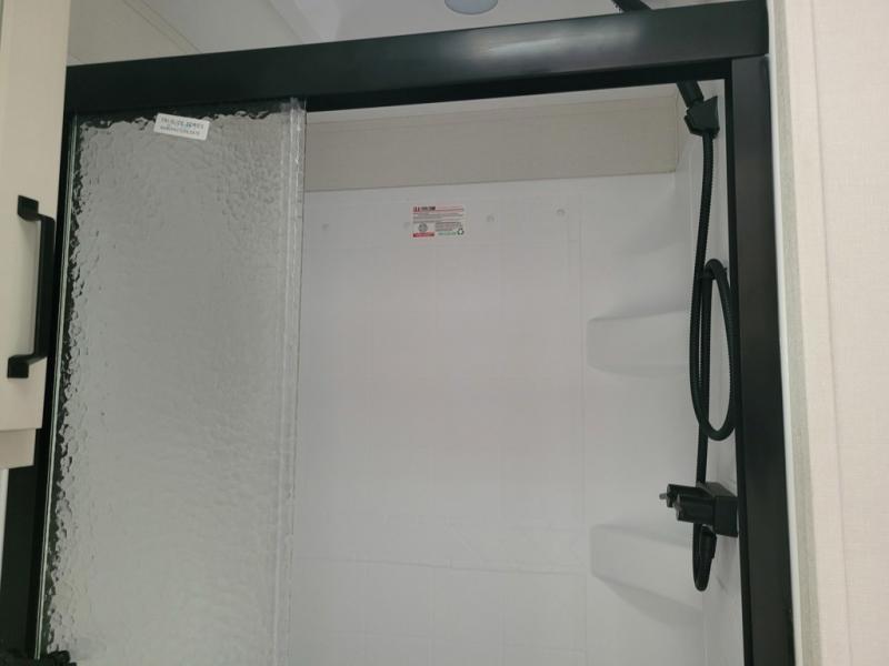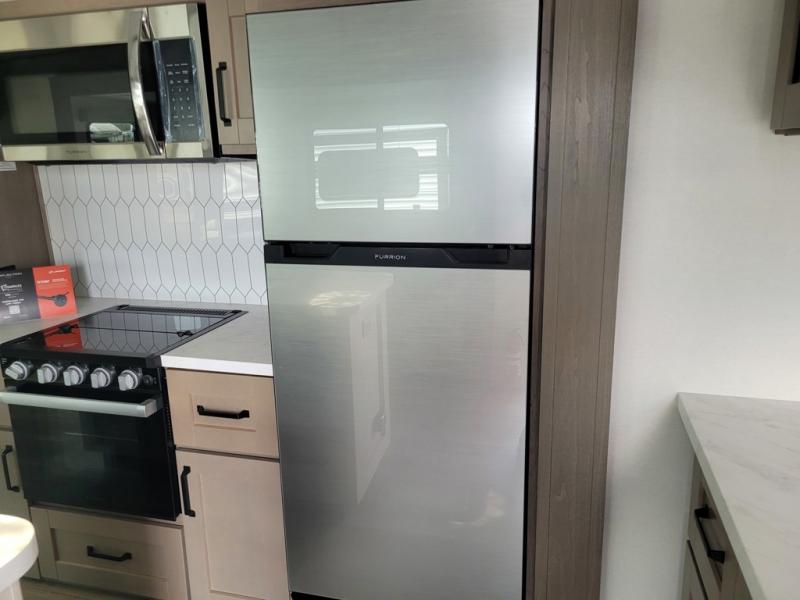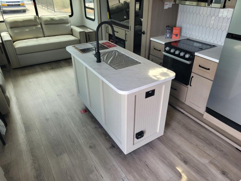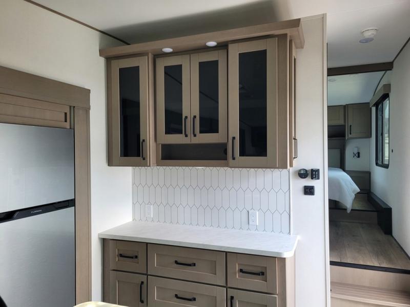 Get ready to enjoy everything the campgrounds and surrounding area has to offer when you are setup to camp in this fifth wheel! The two electric awnings offer protected areas creating outdoor living spaces; just grab your camping chairs from the unobstructed pass-through storage. And the interior offers a spacious living area and kitchen combination with dual opposing slides for maximum space. You can sit on the tri-fold sofa or the booth dinette with an option for a swivel dinette. The hutch and kitchen island offer counter space to prepare and serve meals, and there is a large pantry for goodies. The 40" LED HDTV with a fireplace below provides entertainment before bedtime or on a rainy day. And the front bedroom offers privacy, a walk-around queen bed, and plenty of storage!