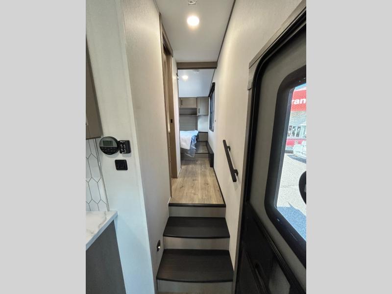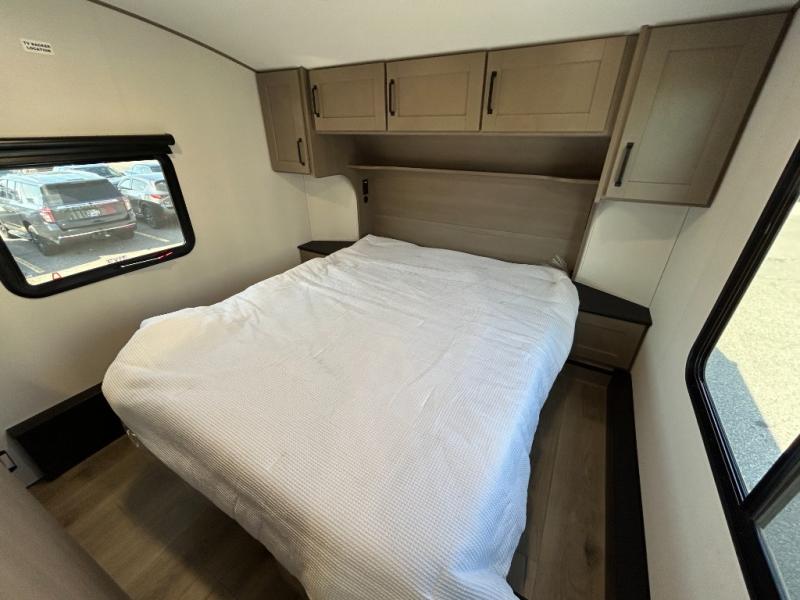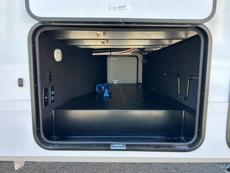 Get ready to enjoy everything the campgrounds and surrounding area has to offer when you are setup to camp in this fifth wheel! The two electric awnings offer protected areas creating outdoor living spaces; just grab your camping chairs from the unobstructed pass-through storage. And the interior offers a spacious living area and kitchen combination with dual opposing slides for maximum space. You can sit on the tri-fold sofa or the booth dinette with an option for a swivel dinette. The hutch and kitchen island offer counter space to prepare and serve meals, and there is a large pantry for goodies. The 40" LED HDTV with a fireplace below provides entertainment before bedtime or on a rainy day. And the front bedroom offers privacy, a walk-around queen bed, and plenty of storage!