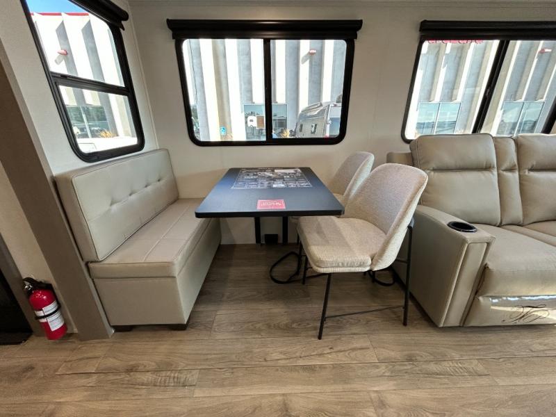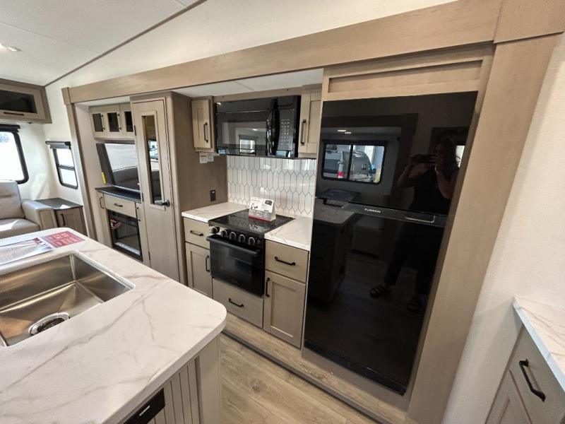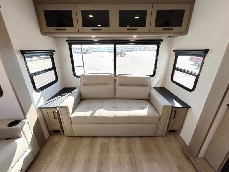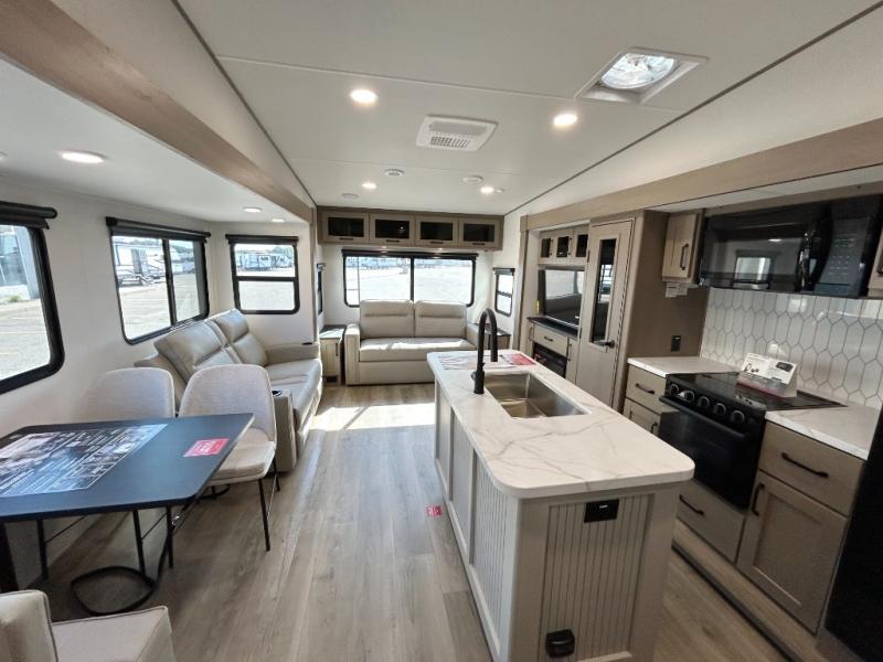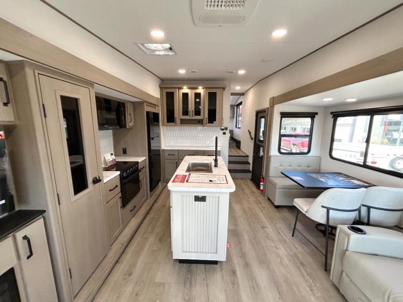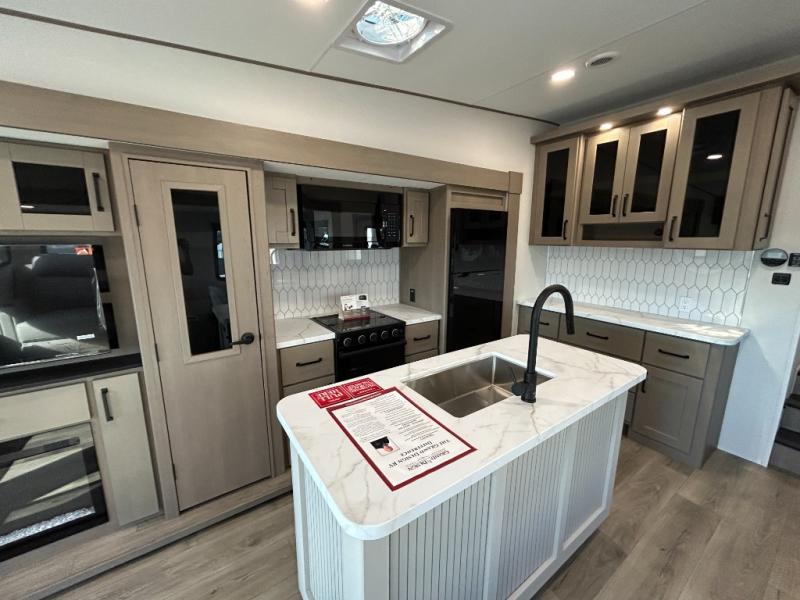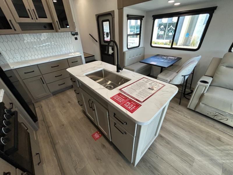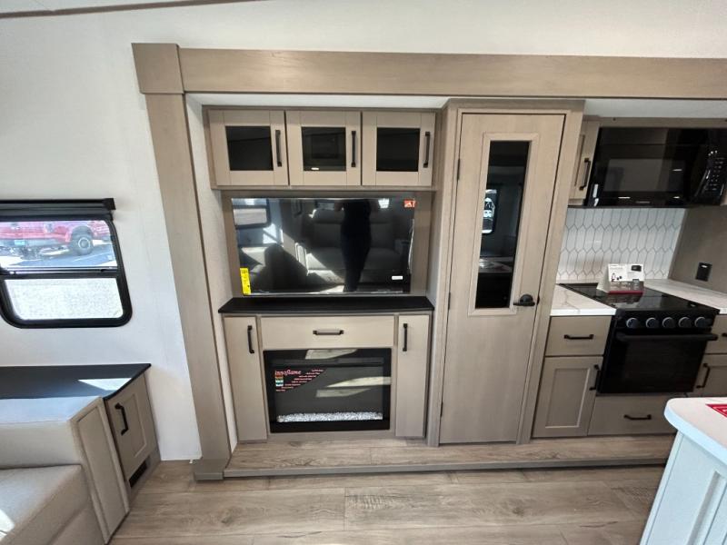 Get ready to enjoy everything the campgrounds and surrounding area has to offer when you are setup to camp in this fifth wheel! The two electric awnings offer protected areas creating outdoor living spaces; just grab your camping chairs from the unobstructed pass-through storage. And the interior offers a spacious living area and kitchen combination with dual opposing slides for maximum space. You can sit on the tri-fold sofa or the booth dinette with an option for a swivel dinette. The hutch and kitchen island offer counter space to prepare and serve meals, and there is a large pantry for goodies. The 40" LED HDTV with a fireplace below provides entertainment before bedtime or on a rainy day. And the front bedroom offers privacy, a walk-around queen bed, and plenty of storage!