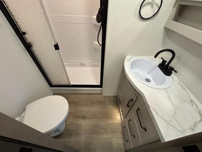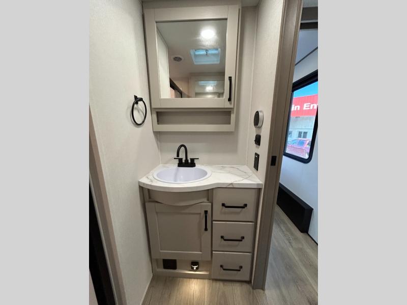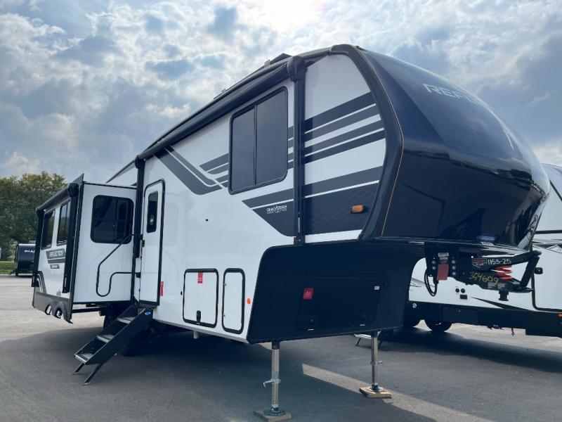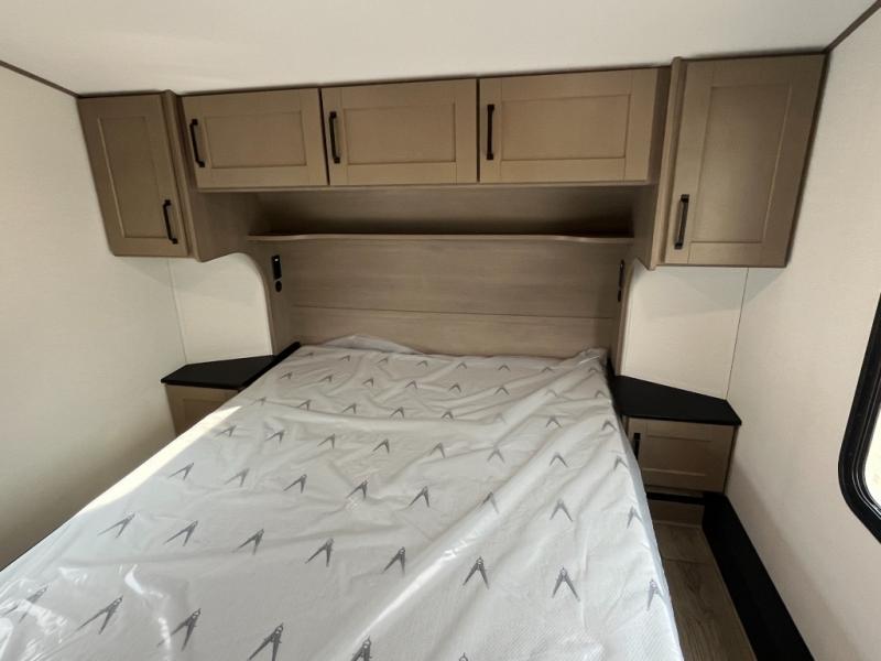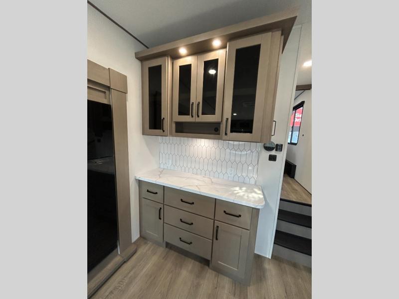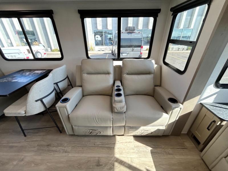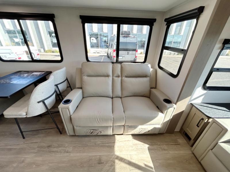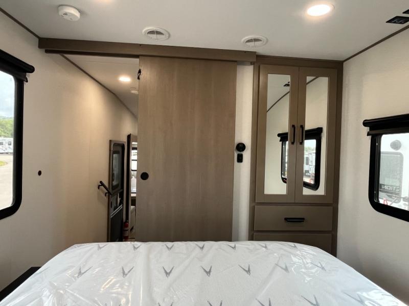 Get ready to enjoy everything the campgrounds and surrounding area has to offer when you are setup to camp in this fifth wheel! The two electric awnings offer protected areas creating outdoor living spaces; just grab your camping chairs from the unobstructed pass-through storage. And the interior offers a spacious living area and kitchen combination with dual opposing slides for maximum space. You can sit on the tri-fold sofa or the booth dinette with an option for a swivel dinette. The hutch and kitchen island offer counter space to prepare and serve meals, and there is a large pantry for goodies. The 40" LED HDTV with a fireplace below provides entertainment before bedtime or on a rainy day. And the front bedroom offers privacy, a walk-around queen bed, and plenty of storage!