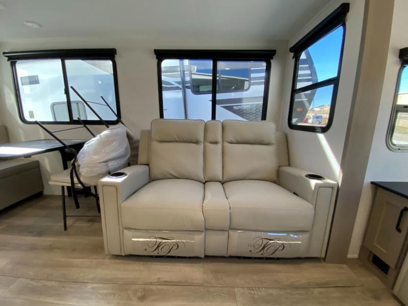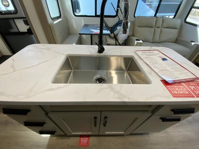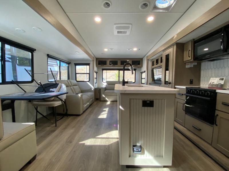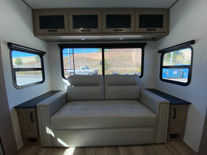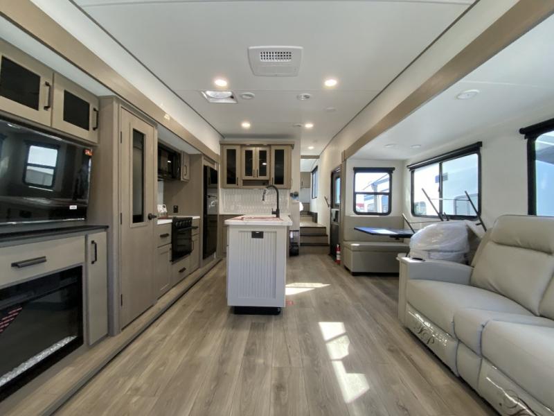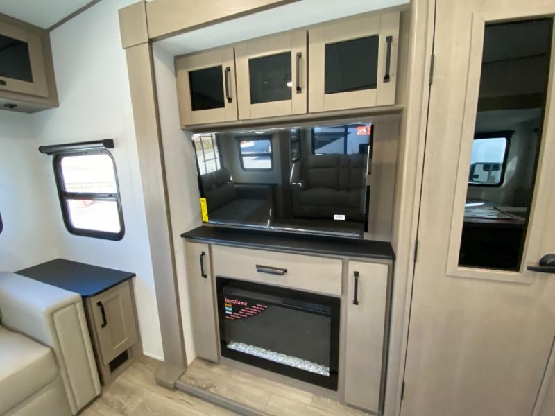 Get ready to enjoy everything the campgrounds and surrounding area has to offer when you are setup to camp in this fifth wheel! The two electric awnings offer protected areas creating outdoor living spaces; just grab your camping chairs from the unobstructed pass-through storage. And the interior offers a spacious living area and kitchen combination with dual opposing slides for maximum space. You can sit on the tri-fold sofa or the booth dinette with an option for a swivel dinette. The hutch and kitchen island offer counter space to prepare and serve meals, and there is a large pantry for goodies. The 40" LED HDTV with a fireplace below provides entertainment before bedtime or on a rainy day. And the front bedroom offers privacy, a walk-around queen bed, and plenty of storage!