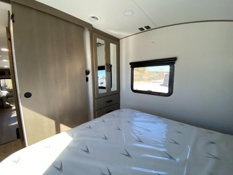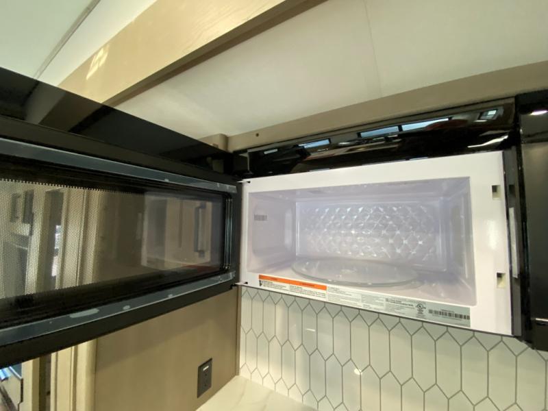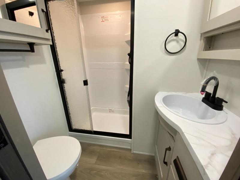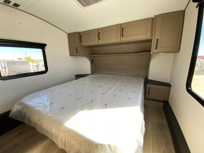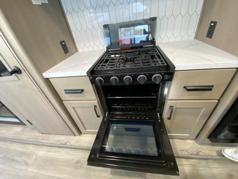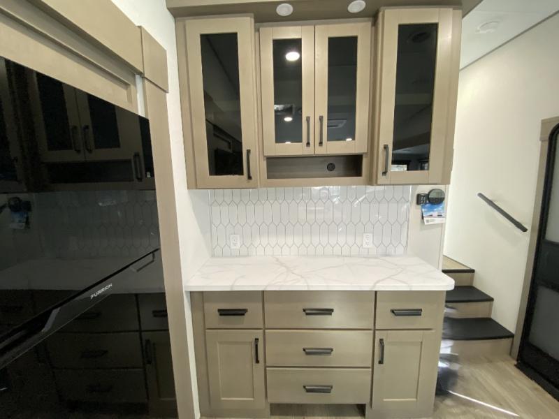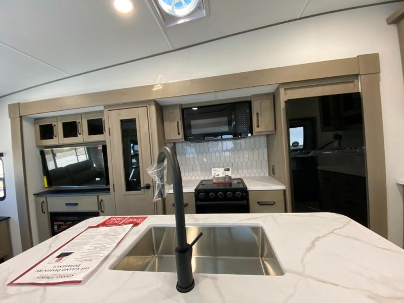 Get ready to enjoy everything the campgrounds and surrounding area has to offer when you are setup to camp in this fifth wheel! The two electric awnings offer protected areas creating outdoor living spaces; just grab your camping chairs from the unobstructed pass-through storage. And the interior offers a spacious living area and kitchen combination with dual opposing slides for maximum space. You can sit on the tri-fold sofa or the booth dinette with an option for a swivel dinette. The hutch and kitchen island offer counter space to prepare and serve meals, and there is a large pantry for goodies. The 40" LED HDTV with a fireplace below provides entertainment before bedtime or on a rainy day. And the front bedroom offers privacy, a walk-around queen bed, and plenty of storage!