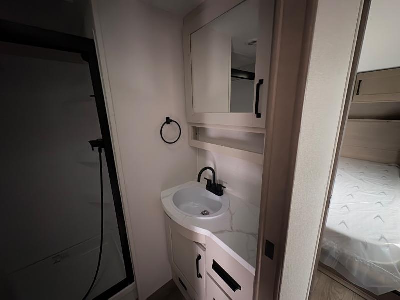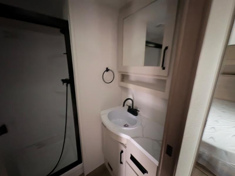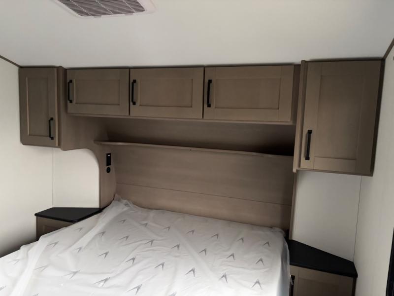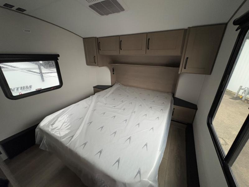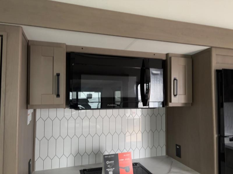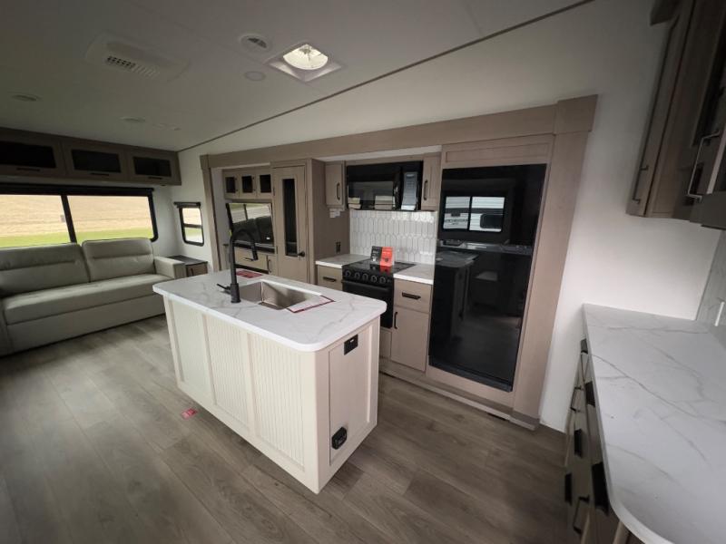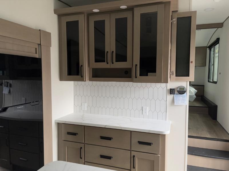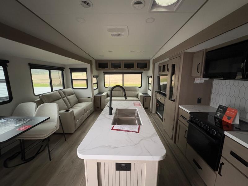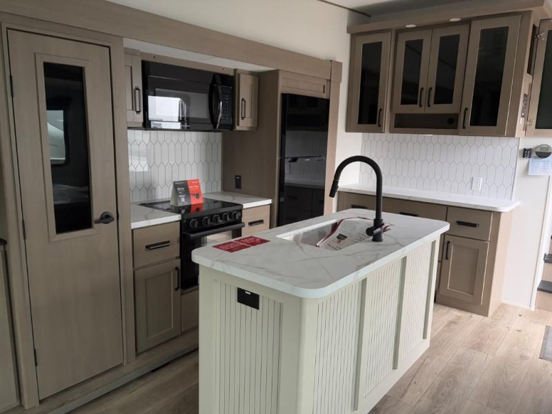 Get ready to enjoy everything the campgrounds and surrounding area has to offer when you are setup to camp in this fifth wheel! The two electric awnings offer protected areas creating outdoor living spaces; just grab your camping chairs from the unobstructed pass-through storage. And the interior offers a spacious living area and kitchen combination with dual opposing slides for maximum space. You can sit on the tri-fold sofa or the booth dinette with an option for a swivel dinette. The hutch and kitchen island offer counter space to prepare and serve meals, and there is a large pantry for goodies. The 40" LED HDTV with a fireplace below provides entertainment before bedtime or on a rainy day. And the front bedroom offers privacy, a walk-around queen bed, and plenty of storage!
