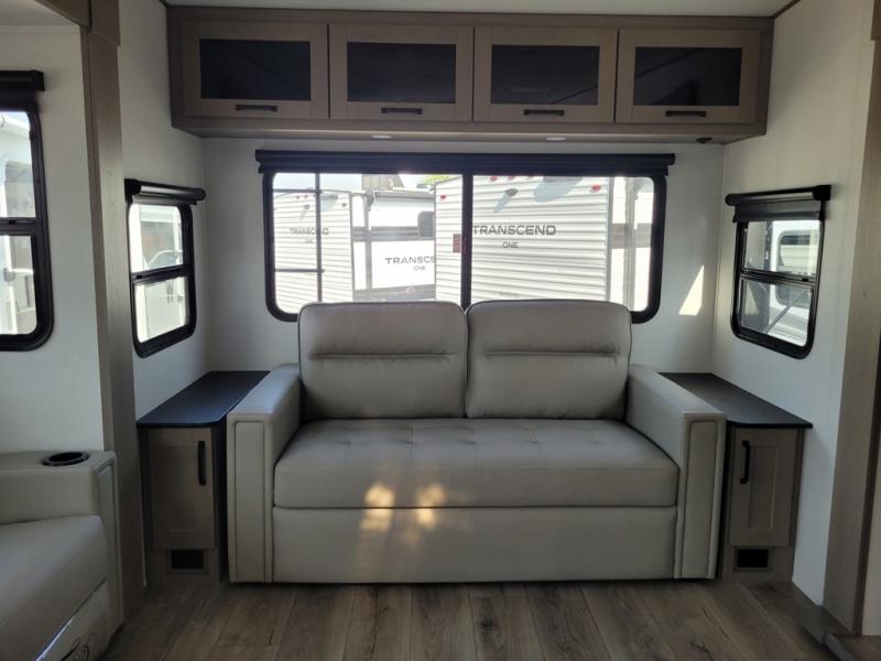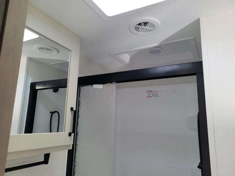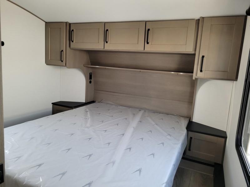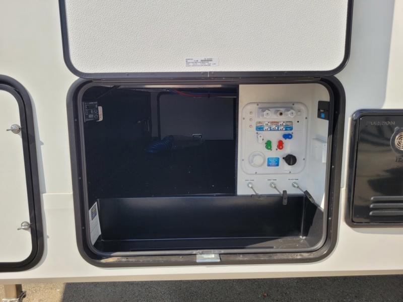 Get ready to enjoy everything the campgrounds and surrounding area has to offer when you are setup to camp in this fifth wheel! The two electric awnings offer protected areas creating outdoor living spaces; just grab your camping chairs from the unobstructed pass-through storage. And the interior offers a spacious living area and kitchen combination with dual opposing slides for maximum space. You can sit on the tri-fold sofa or the booth dinette with an option for a swivel dinette. The hutch and kitchen island offer counter space to prepare and serve meals, and there is a large pantry for goodies. The 40" LED HDTV with a fireplace below provides entertainment before bedtime or on a rainy day. And the front bedroom offers privacy, a walk-around queen bed, and plenty of storage!