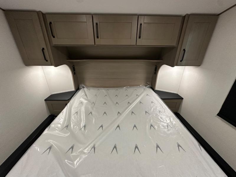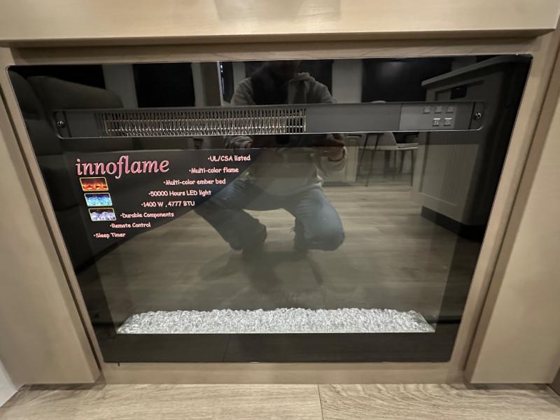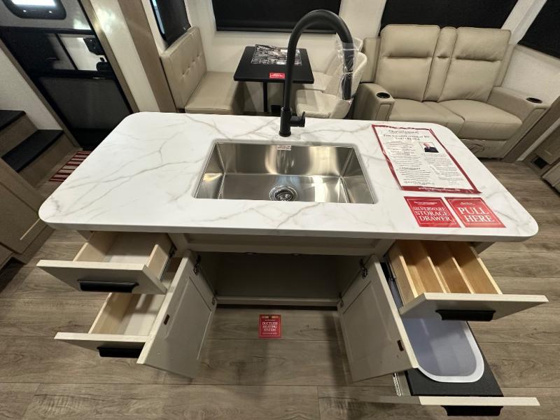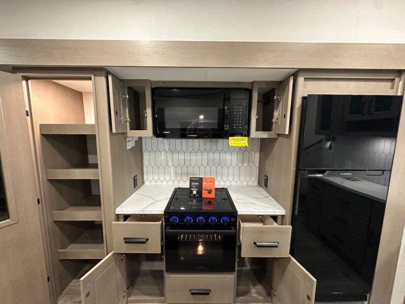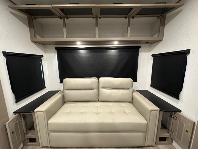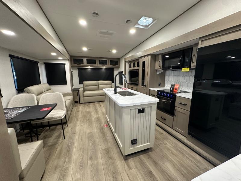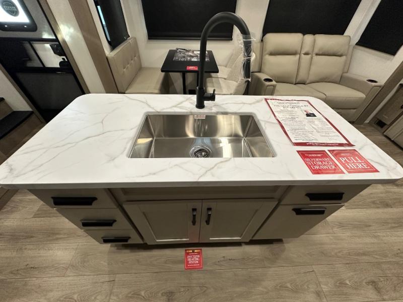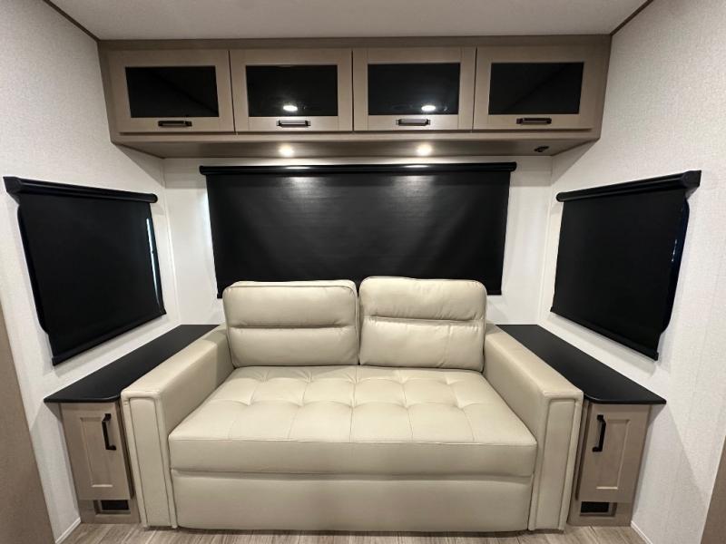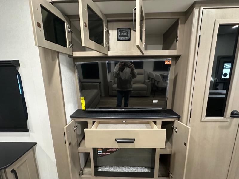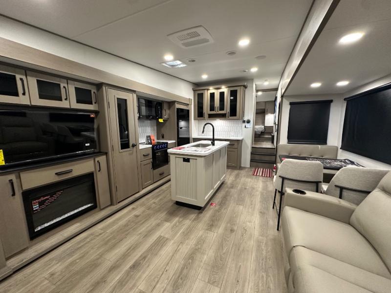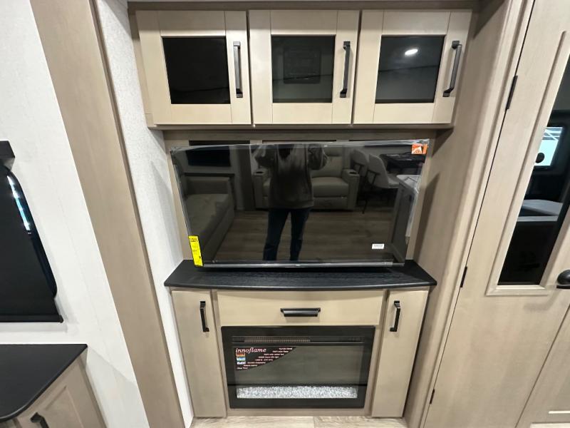 Get ready to enjoy everything the campgrounds and surrounding area has to offer when you are setup to camp in this fifth wheel! The two electric awnings offer protected areas creating outdoor living spaces; just grab your camping chairs from the unobstructed pass-through storage. And the interior offers a spacious living area and kitchen combination with dual opposing slides for maximum space. You can sit on the tri-fold sofa or the booth dinette with an option for a swivel dinette. The hutch and kitchen island offer counter space to prepare and serve meals, and there is a large pantry for goodies. The 40" LED HDTV with a fireplace below provides entertainment before bedtime or on a rainy day. And the front bedroom offers privacy, a walk-around queen bed, and plenty of storage!