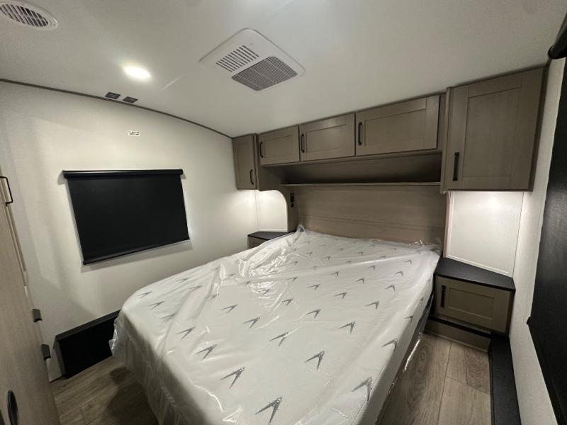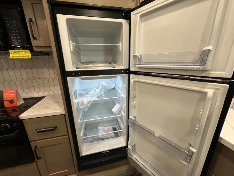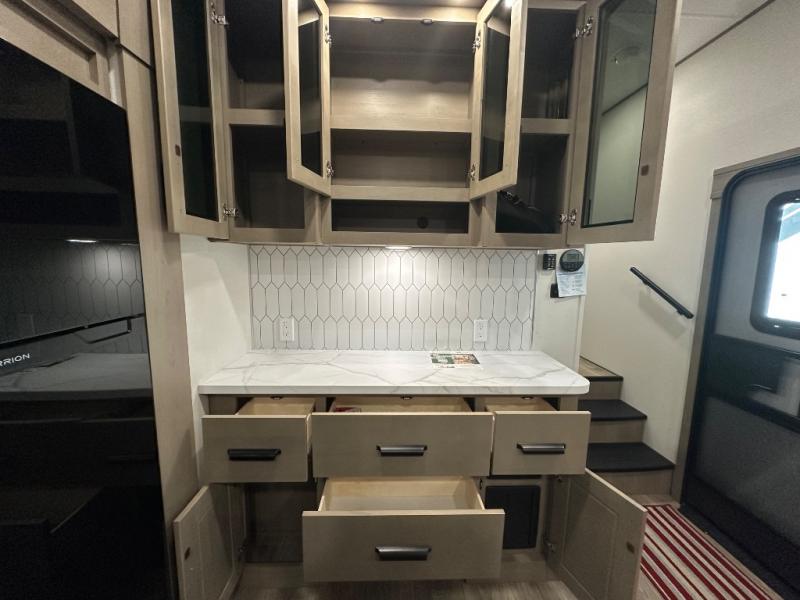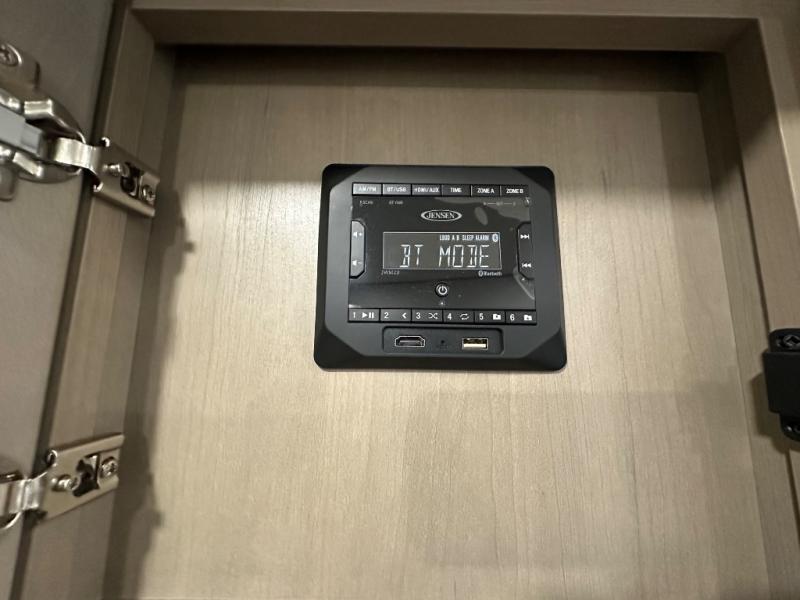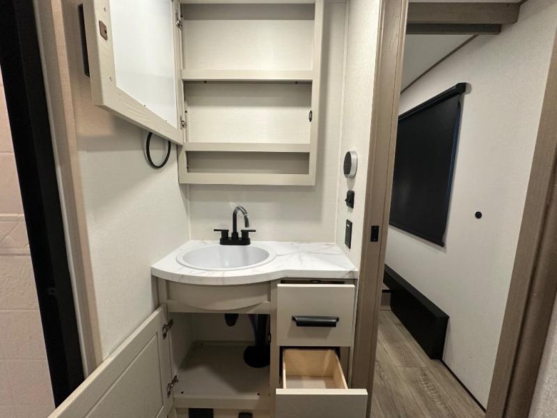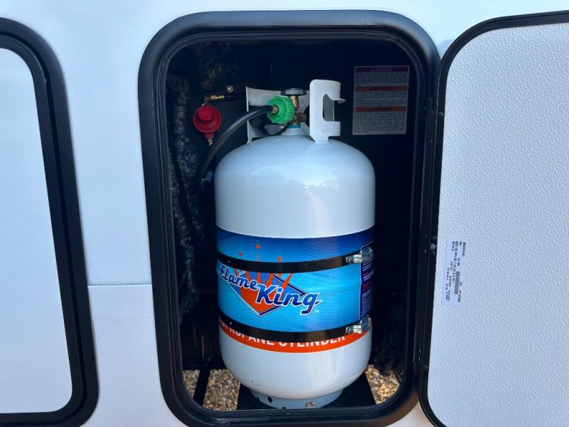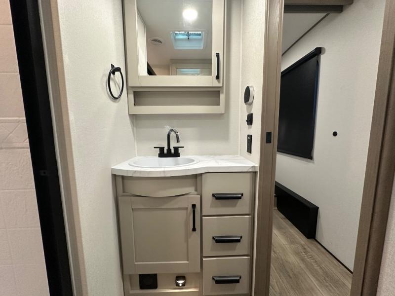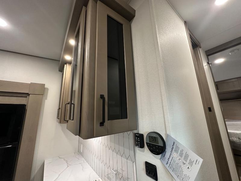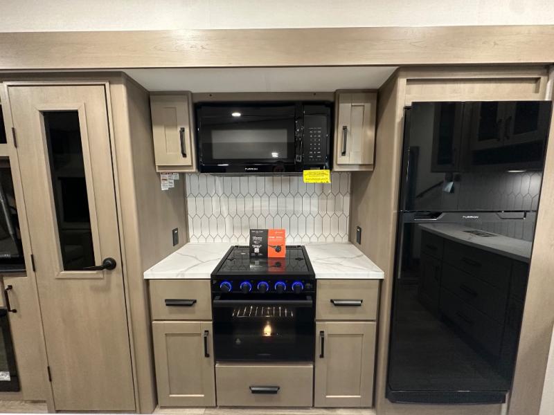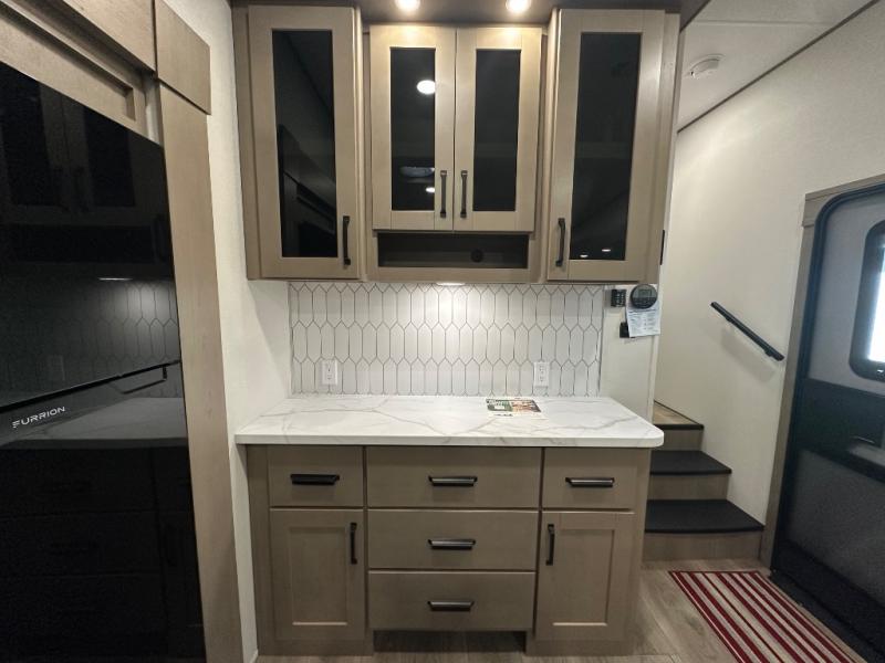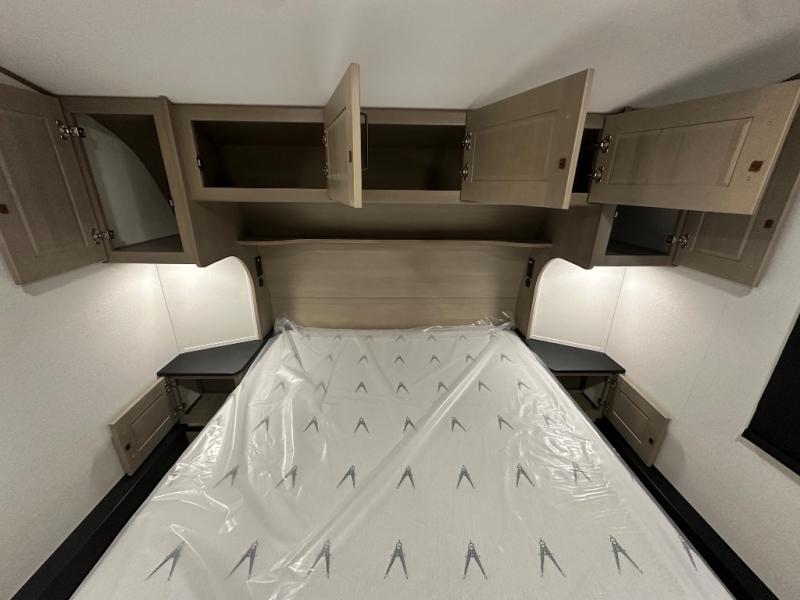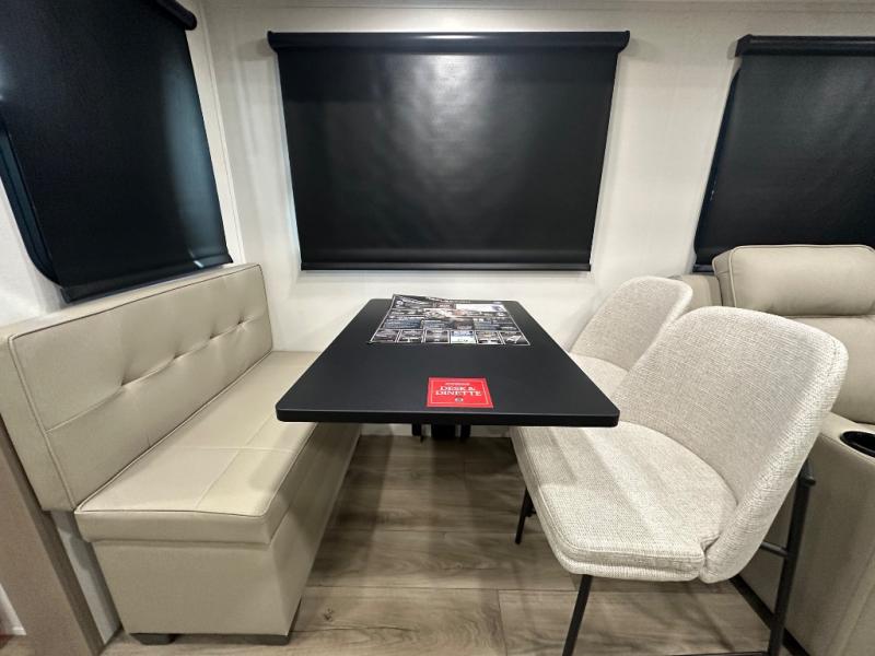 Get ready to enjoy everything the campgrounds and surrounding area has to offer when you are setup to camp in this fifth wheel! The two electric awnings offer protected areas creating outdoor living spaces; just grab your camping chairs from the unobstructed pass-through storage. And the interior offers a spacious living area and kitchen combination with dual opposing slides for maximum space. You can sit on the tri-fold sofa or the booth dinette with an option for a swivel dinette. The hutch and kitchen island offer counter space to prepare and serve meals, and there is a large pantry for goodies. The 40" LED HDTV with a fireplace below provides entertainment before bedtime or on a rainy day. And the front bedroom offers privacy, a walk-around queen bed, and plenty of storage!