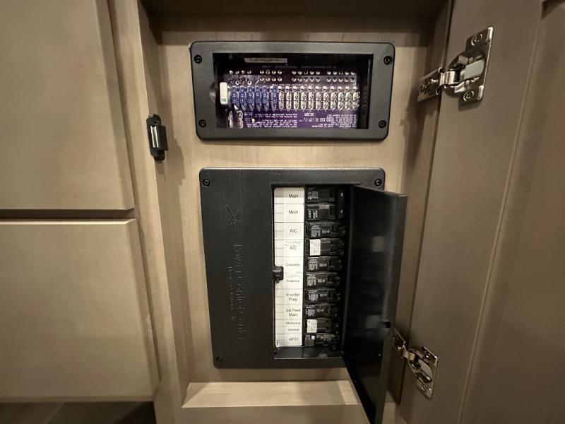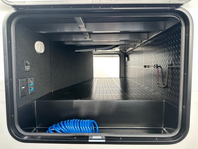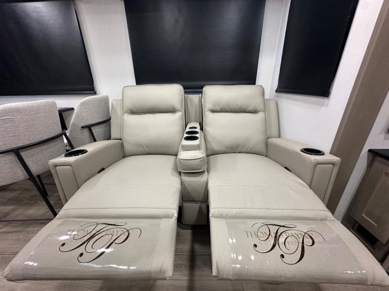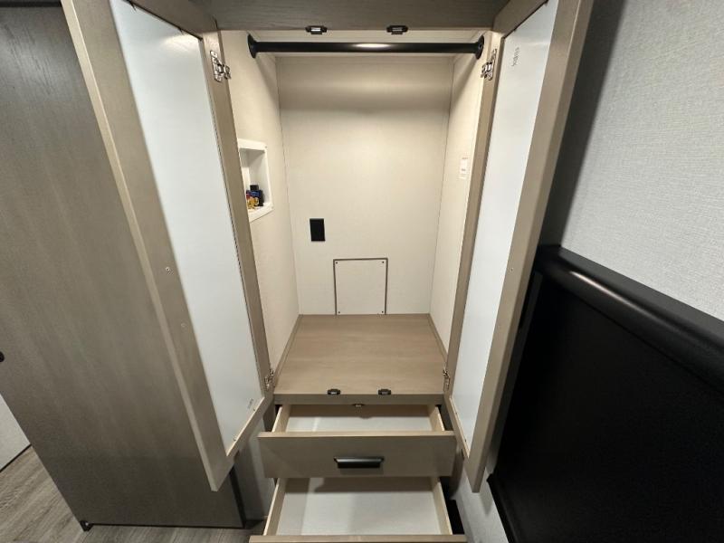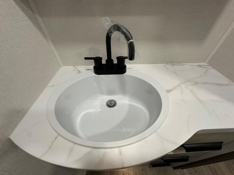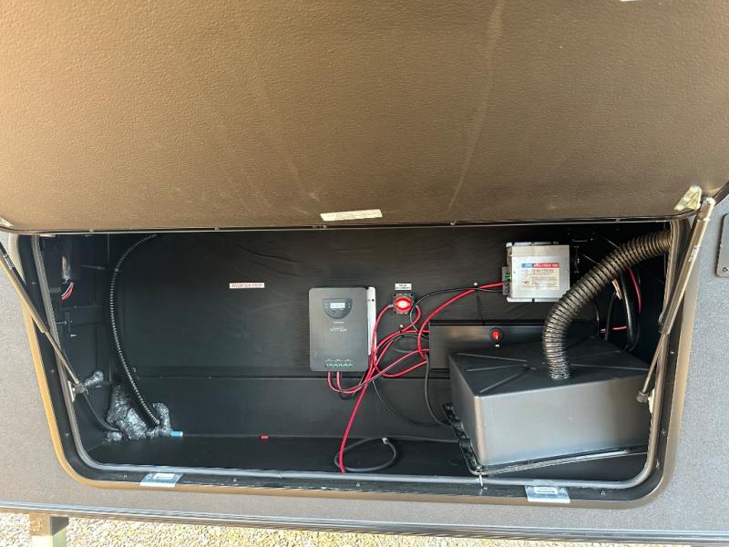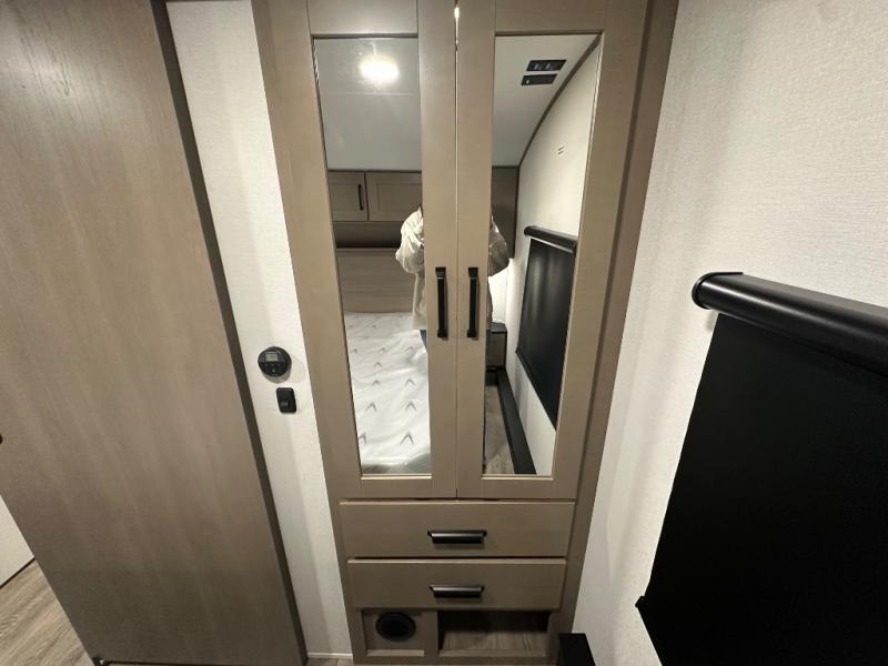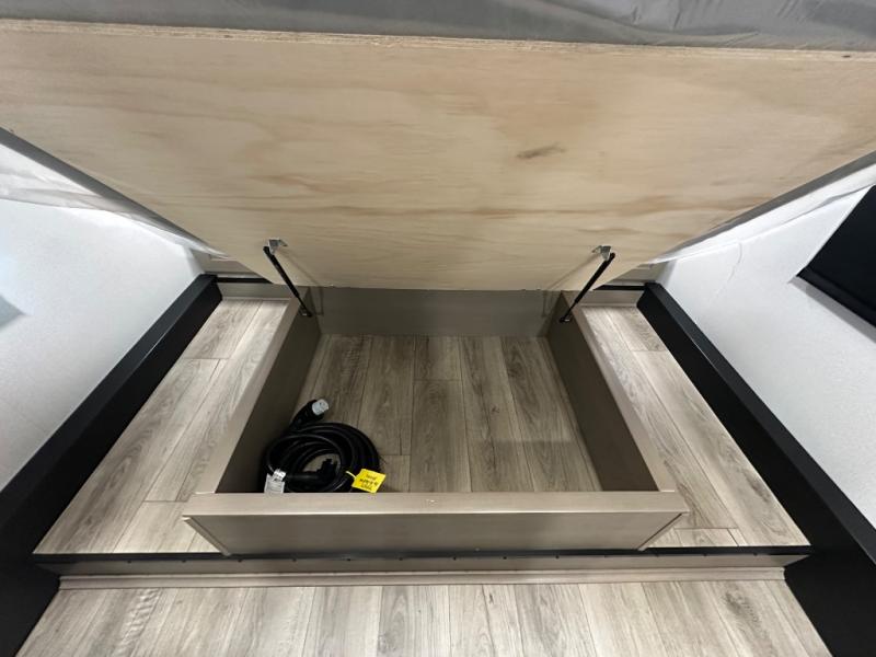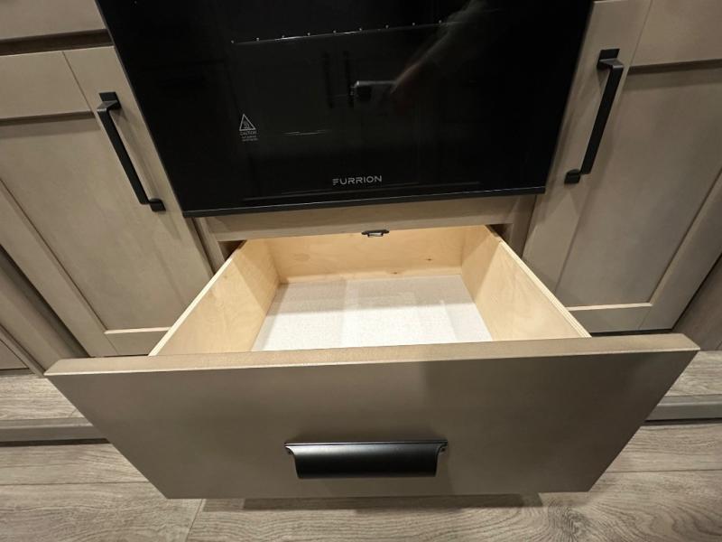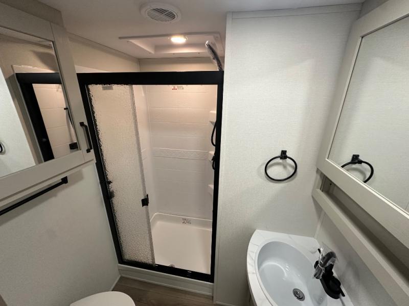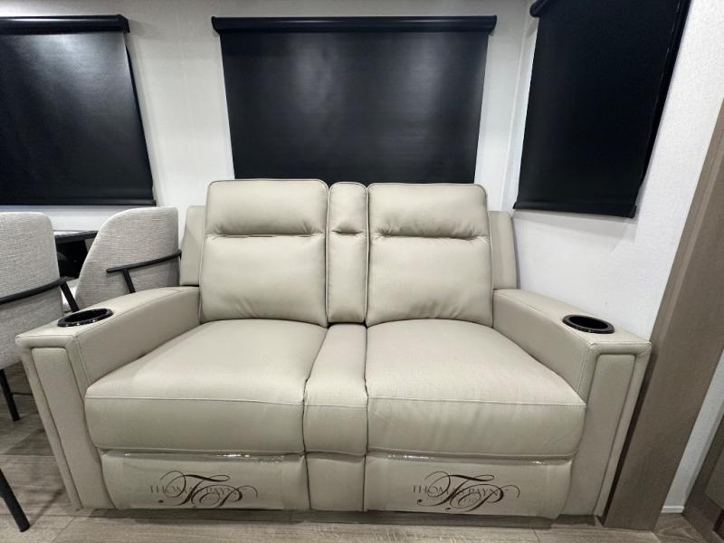 Get ready to enjoy everything the campgrounds and surrounding area has to offer when you are setup to camp in this fifth wheel! The two electric awnings offer protected areas creating outdoor living spaces; just grab your camping chairs from the unobstructed pass-through storage. And the interior offers a spacious living area and kitchen combination with dual opposing slides for maximum space. You can sit on the tri-fold sofa or the booth dinette with an option for a swivel dinette. The hutch and kitchen island offer counter space to prepare and serve meals, and there is a large pantry for goodies. The 40" LED HDTV with a fireplace below provides entertainment before bedtime or on a rainy day. And the front bedroom offers privacy, a walk-around queen bed, and plenty of storage!