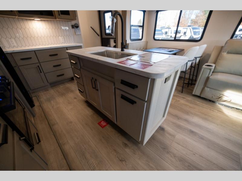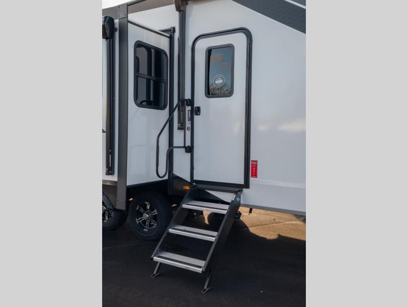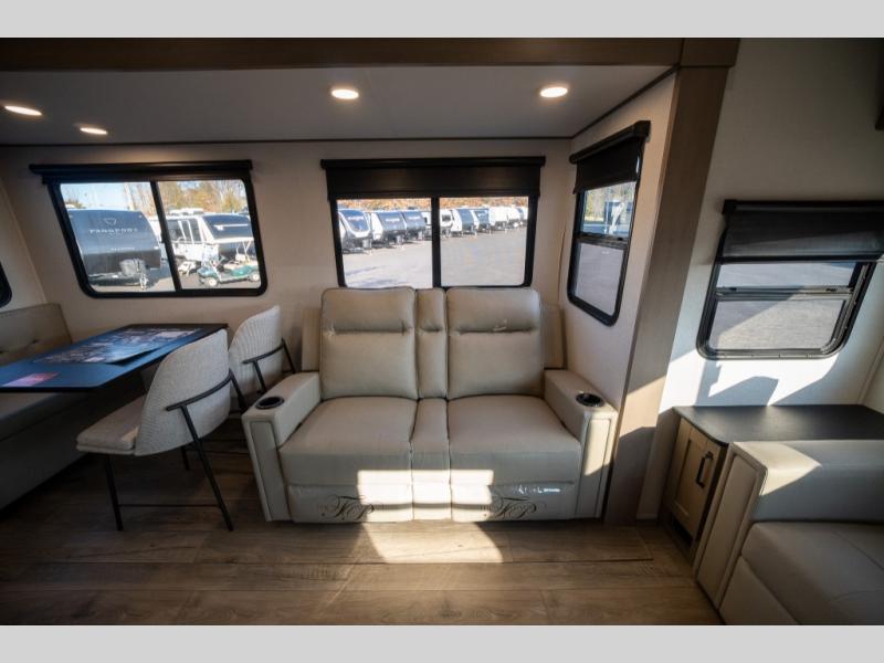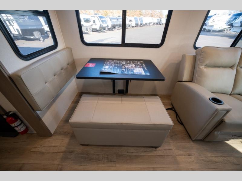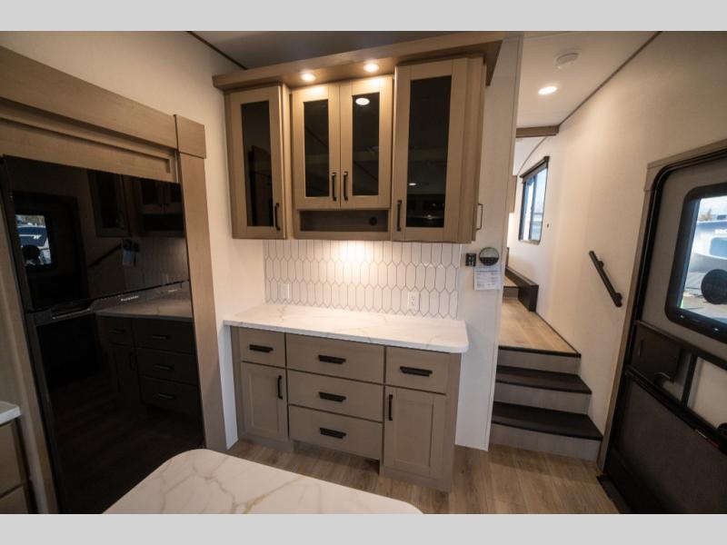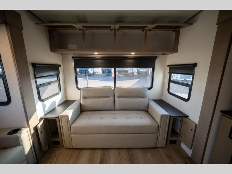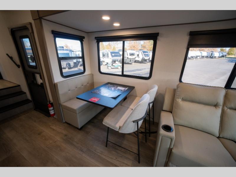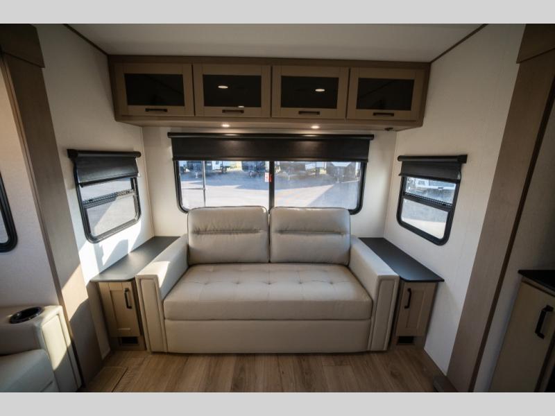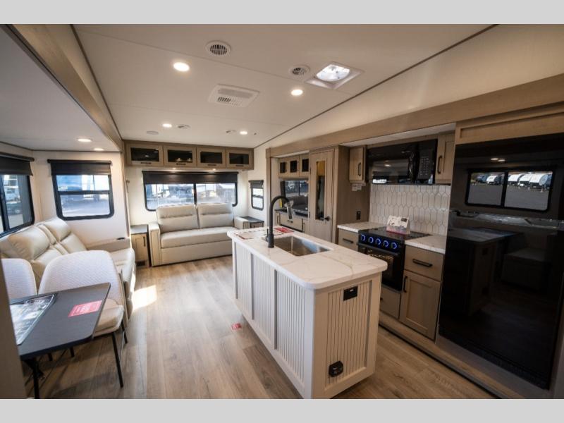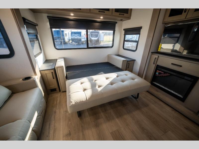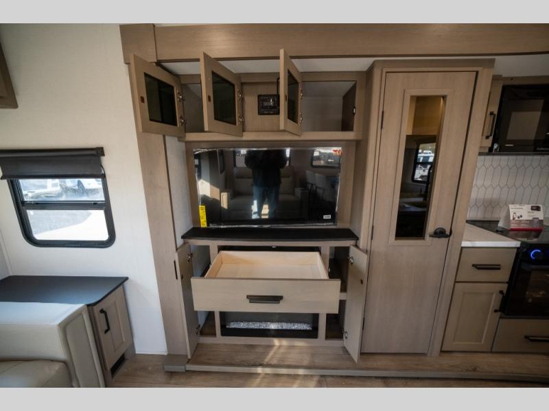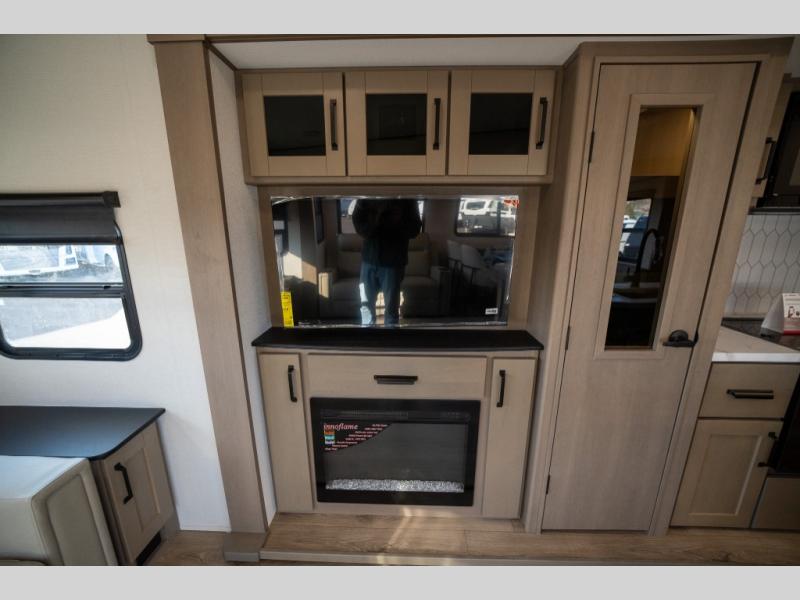 Get ready to enjoy everything the campgrounds and surrounding area has to offer when you are setup to camp in this fifth wheel! The two electric awnings offer protected areas creating outdoor living spaces; just grab your camping chairs from the unobstructed pass-through storage. And the interior offers a spacious living area and kitchen combination with dual opposing slides for maximum space. You can sit on the tri-fold sofa or the booth dinette with an option for a swivel dinette. The hutch and kitchen island offer counter space to prepare and serve meals, and there is a large pantry for goodies. The 40" LED HDTV with a fireplace below provides entertainment before bedtime or on a rainy day. And the front bedroom offers privacy, a walk-around queen bed, and plenty of storage!