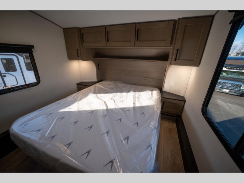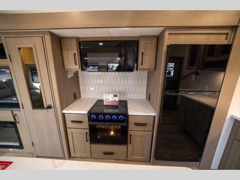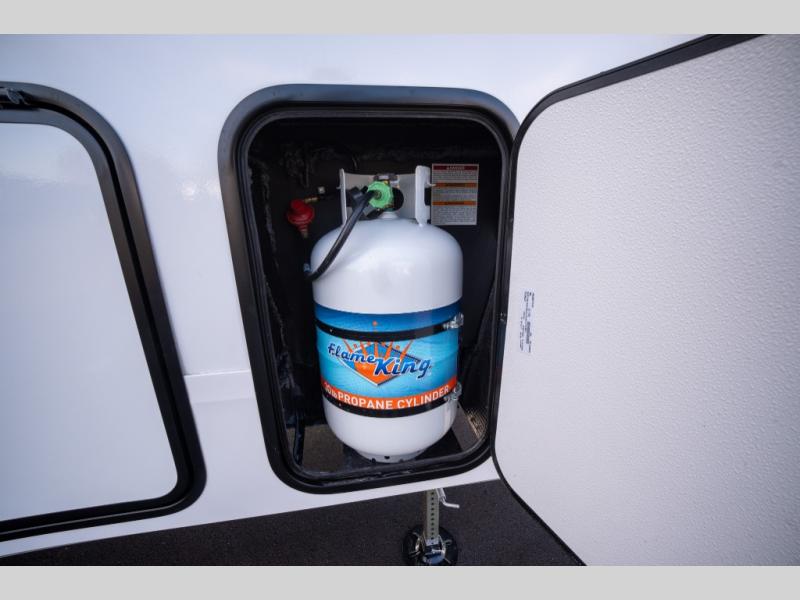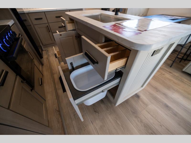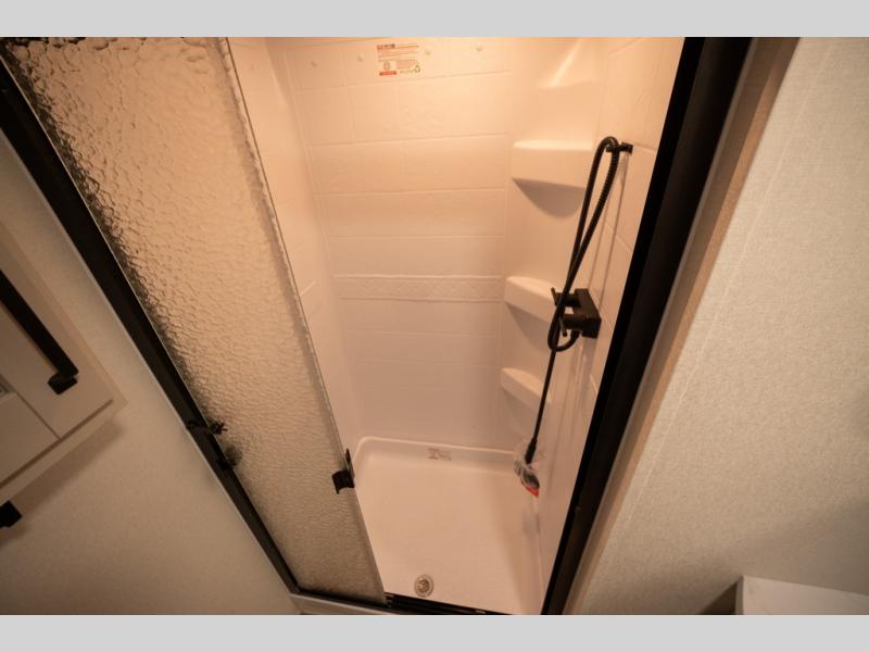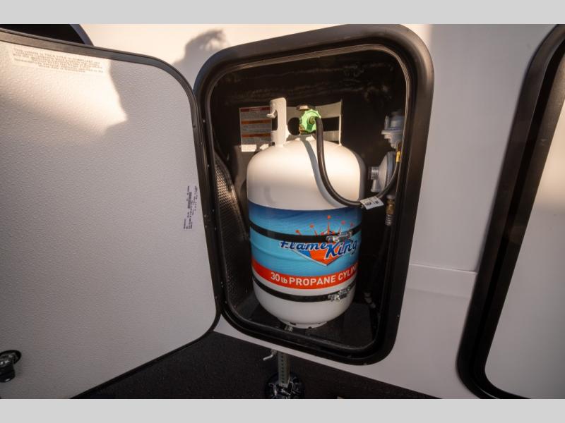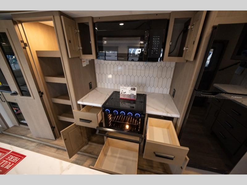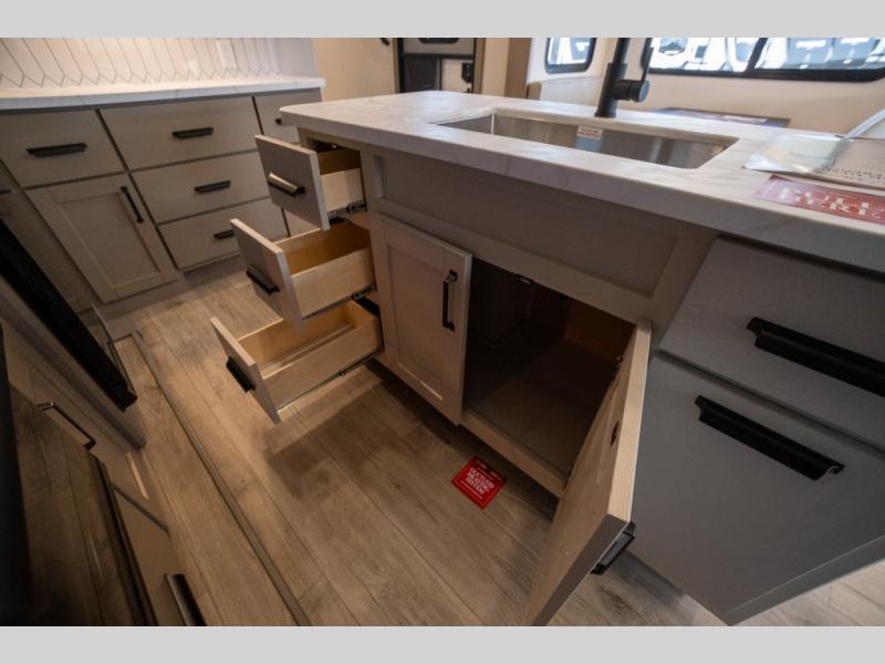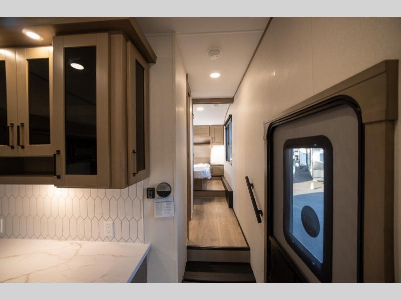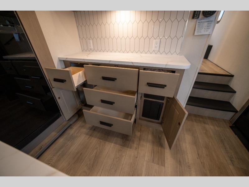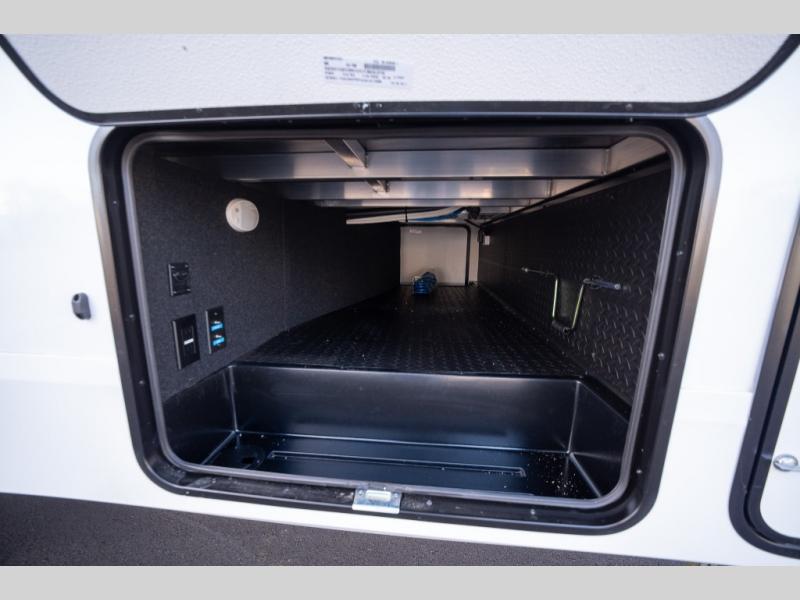 Get ready to enjoy everything the campgrounds and surrounding area has to offer when you are setup to camp in this fifth wheel! The two electric awnings offer protected areas creating outdoor living spaces; just grab your camping chairs from the unobstructed pass-through storage. And the interior offers a spacious living area and kitchen combination with dual opposing slides for maximum space. You can sit on the tri-fold sofa or the booth dinette with an option for a swivel dinette. The hutch and kitchen island offer counter space to prepare and serve meals, and there is a large pantry for goodies. The 40" LED HDTV with a fireplace below provides entertainment before bedtime or on a rainy day. And the front bedroom offers privacy, a walk-around queen bed, and plenty of storage!