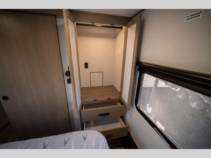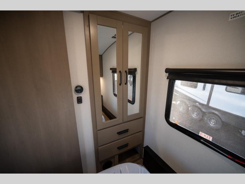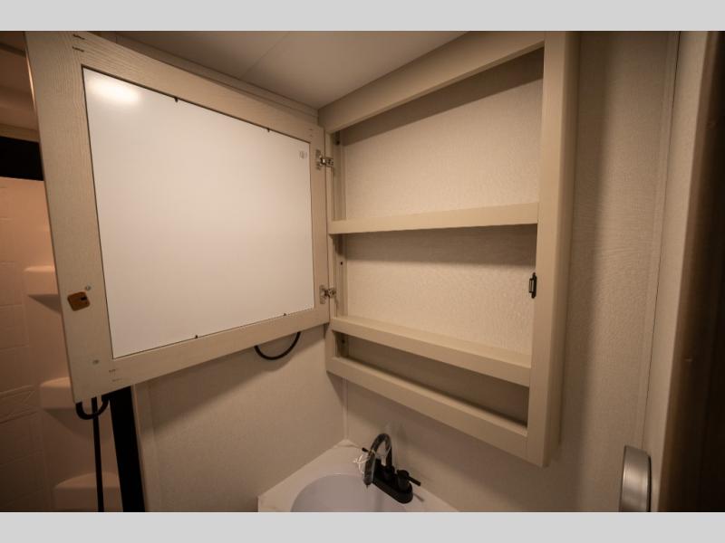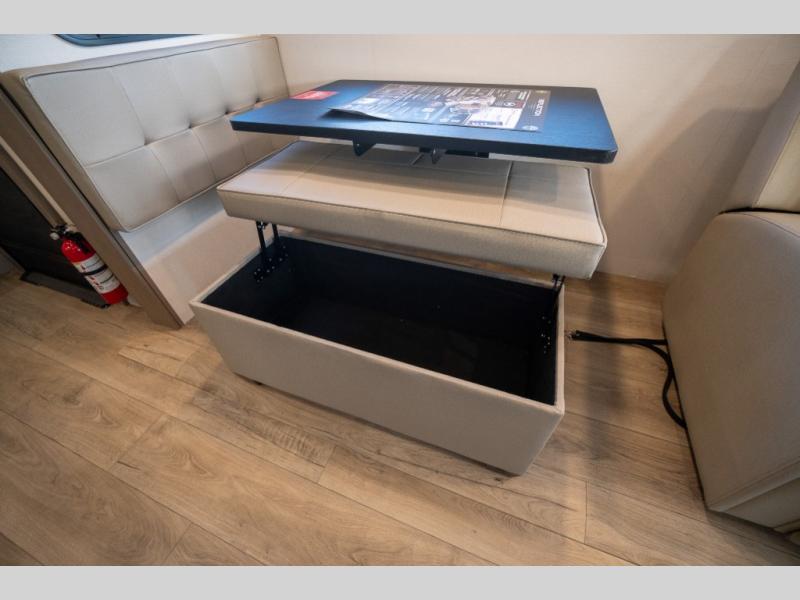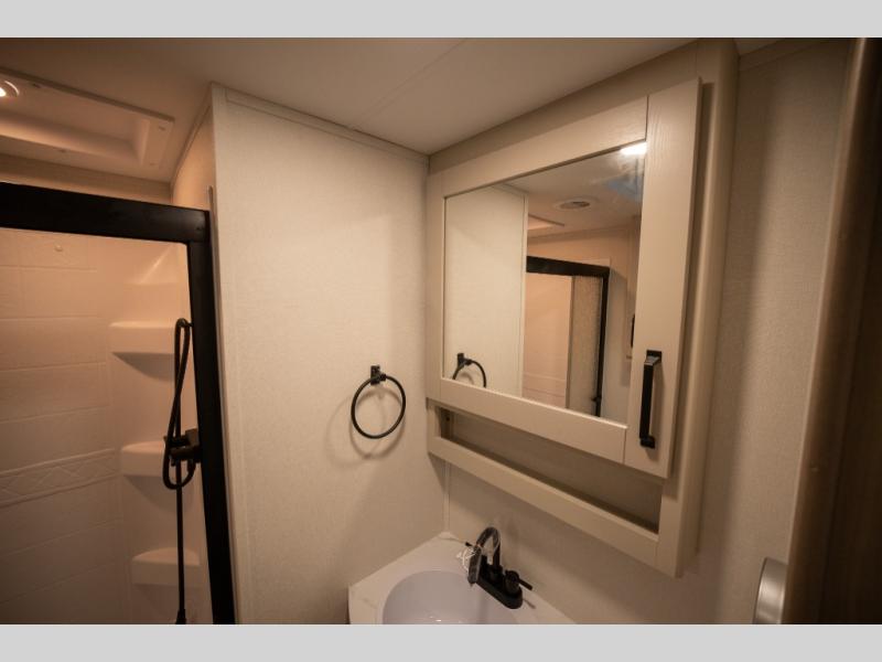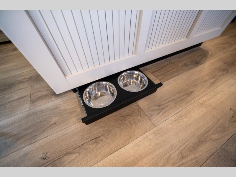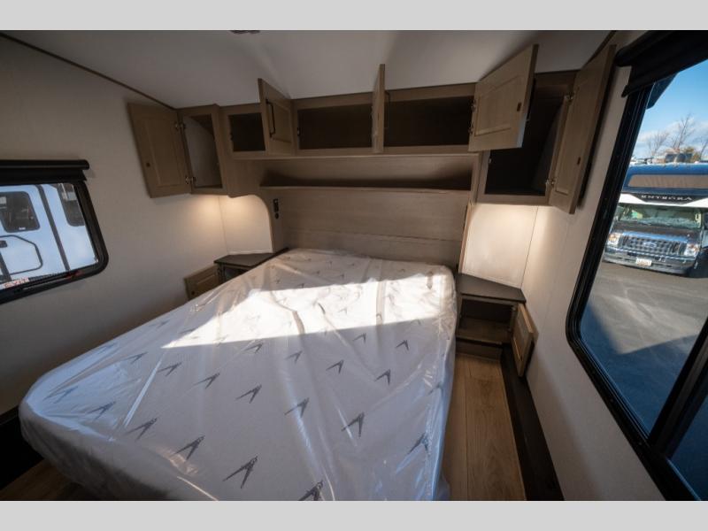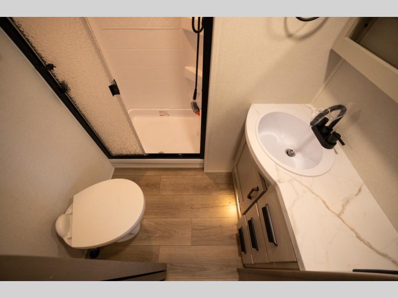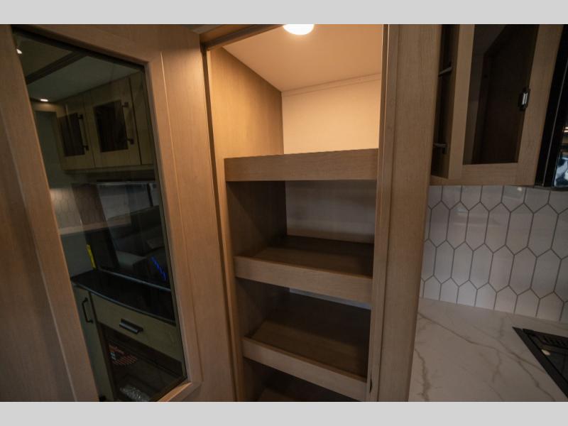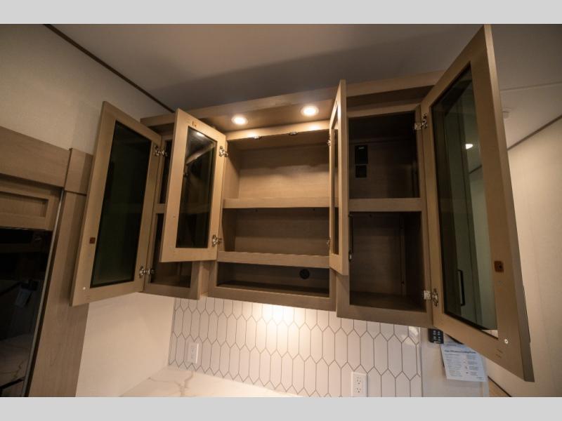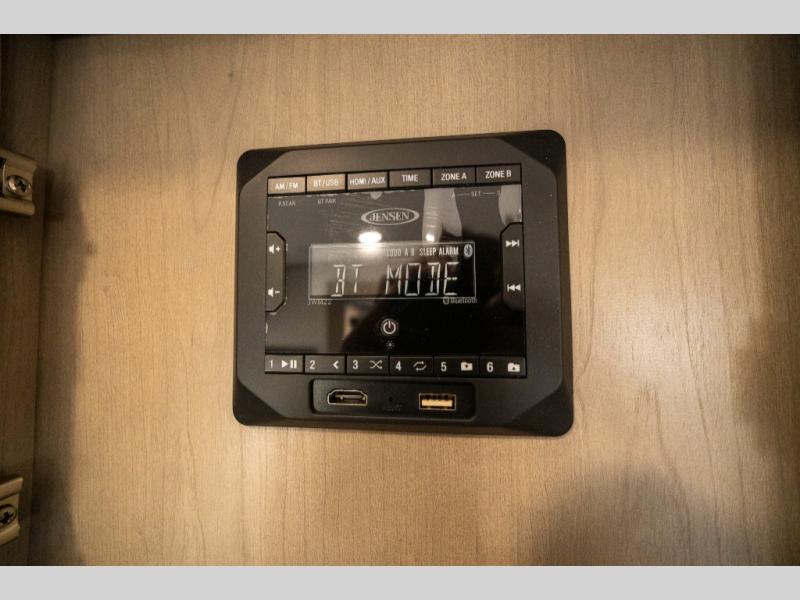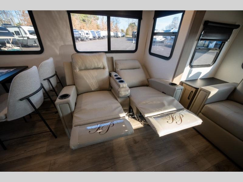 Get ready to enjoy everything the campgrounds and surrounding area has to offer when you are setup to camp in this fifth wheel! The two electric awnings offer protected areas creating outdoor living spaces; just grab your camping chairs from the unobstructed pass-through storage. And the interior offers a spacious living area and kitchen combination with dual opposing slides for maximum space. You can sit on the tri-fold sofa or the booth dinette with an option for a swivel dinette. The hutch and kitchen island offer counter space to prepare and serve meals, and there is a large pantry for goodies. The 40" LED HDTV with a fireplace below provides entertainment before bedtime or on a rainy day. And the front bedroom offers privacy, a walk-around queen bed, and plenty of storage!
