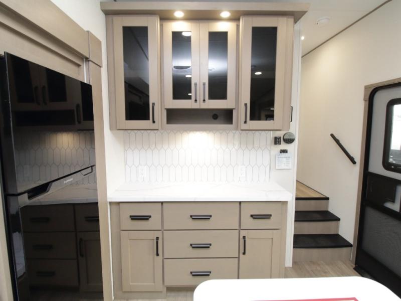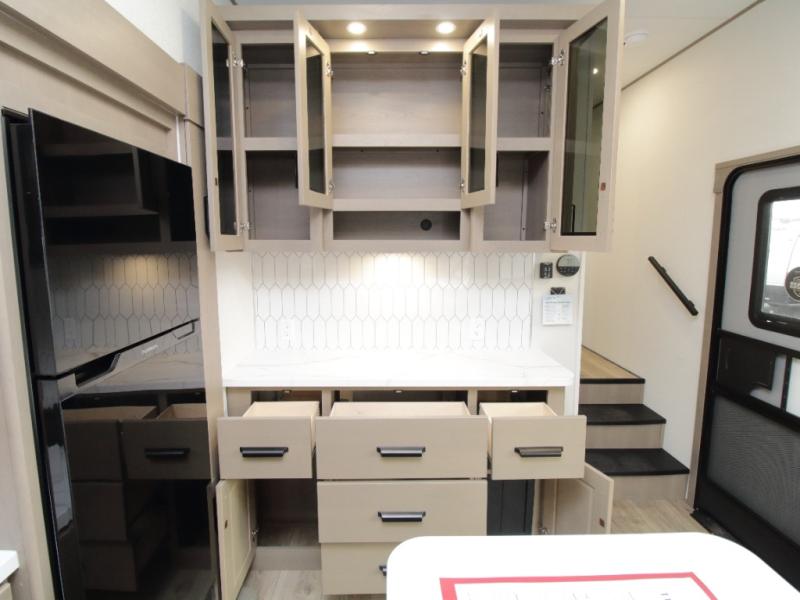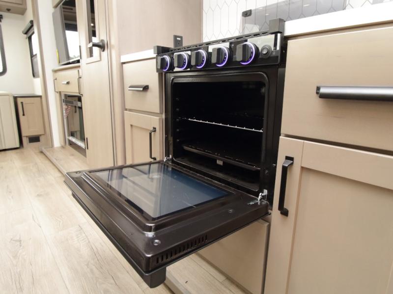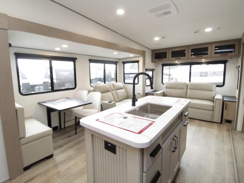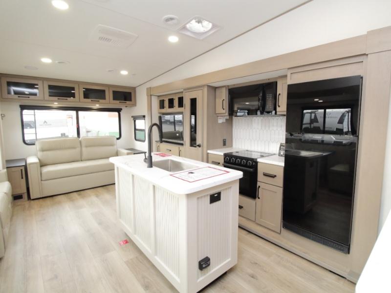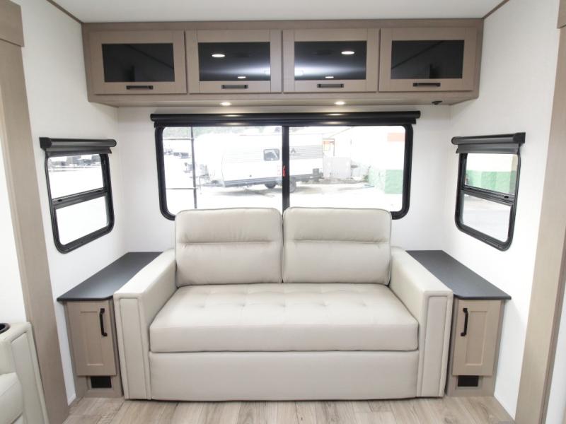 The Reflection 150 Series 295RL combines luxury with functionality. Its dual opposing slides create a spacious interior, while the Ultimate Power Package makes setup effortless with a “One-Touch” leveling system, motion-sensor lighting, and a detachable LED-lit power cord. The 90-degree turning radius ensures this fifth wheel is short-bed truck friendly—no slider hitch required. Safety and convenience are built in with Tire Linc TPMS and generous payload capacity for stress-free travel.