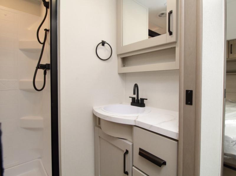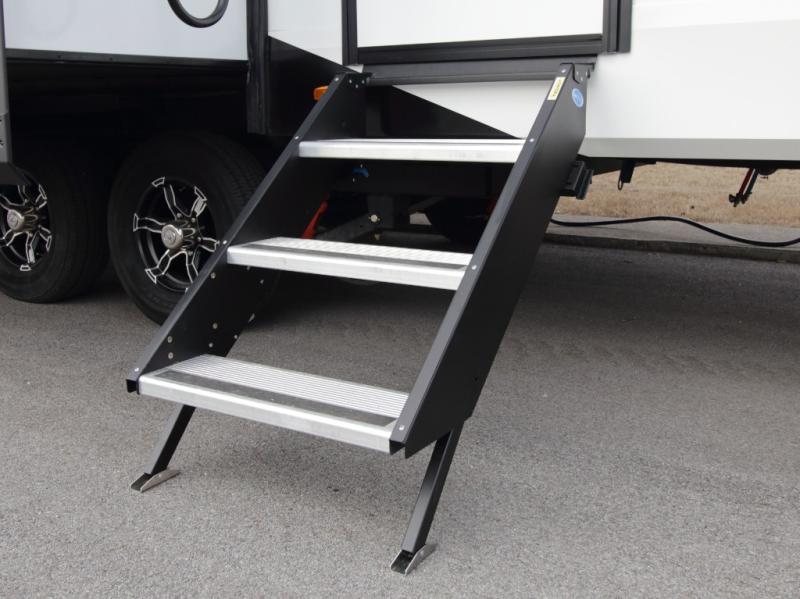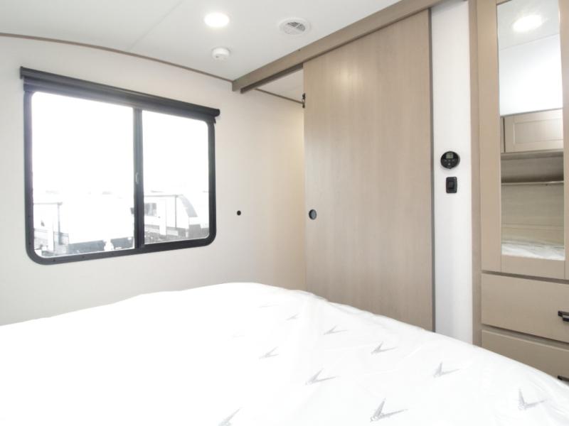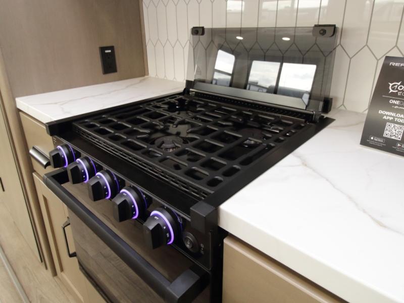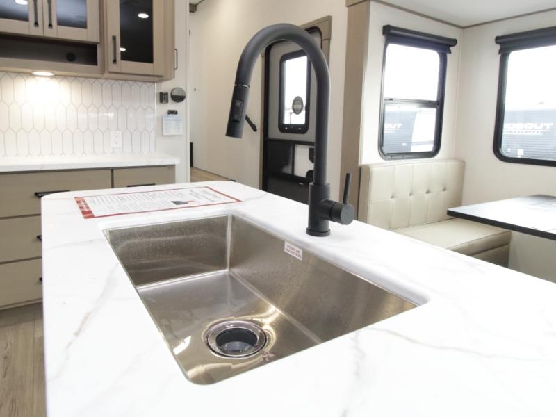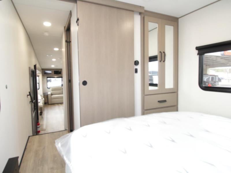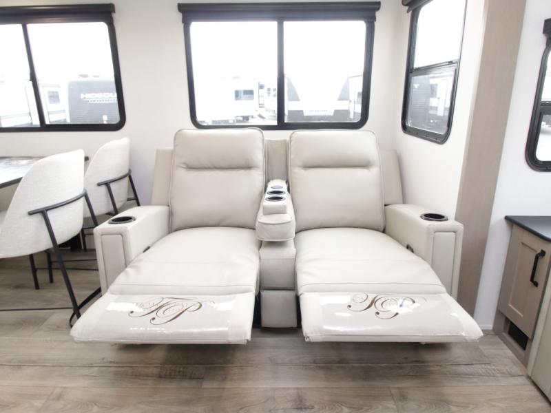 The Reflection 150 Series 295RL combines luxury with functionality. Its dual opposing slides create a spacious interior, while the Ultimate Power Package makes setup effortless with a “One-Touch” leveling system, motion-sensor lighting, and a detachable LED-lit power cord. The 90-degree turning radius ensures this fifth wheel is short-bed truck friendly—no slider hitch required. Safety and convenience are built in with Tire Linc TPMS and generous payload capacity for stress-free travel.