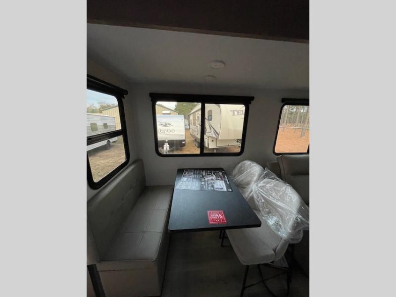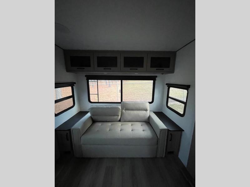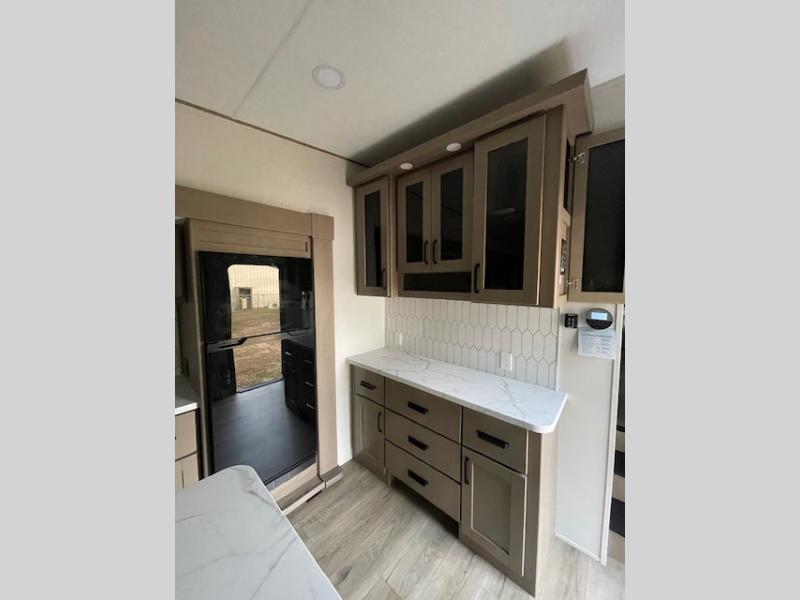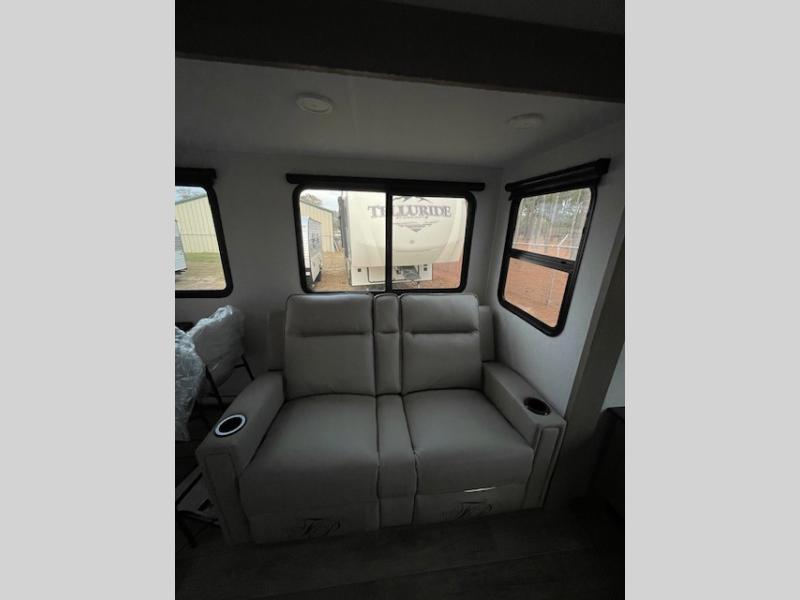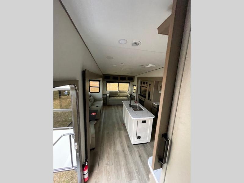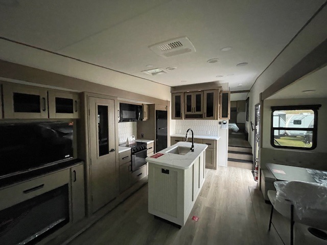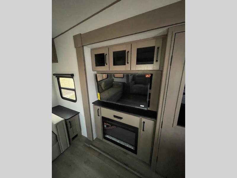 Get ready to enjoy everything the campgrounds and surrounding area has to offer when you are setup to camp in this fifth wheel! The two electric awnings offer protected areas creating outdoor living spaces; just grab your camping chairs from the unobstructed pass-through storage. And the interior offers a spacious living area and kitchen combination with dual opposing slides for maximum space. You can sit on the tri-fold sofa or the booth dinette with an option for a swivel dinette. The hutch and kitchen island offer counter space to prepare and serve meals, and there is a large pantry for goodies. The 40" LED HDTV with a fireplace below provides entertainment before bedtime or on a rainy day. And the front bedroom offers privacy, a walk-around queen bed, and plenty of storage!