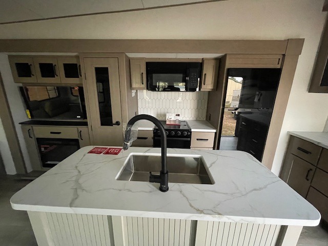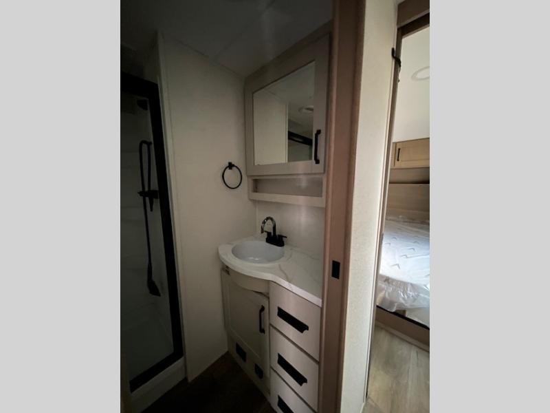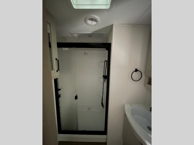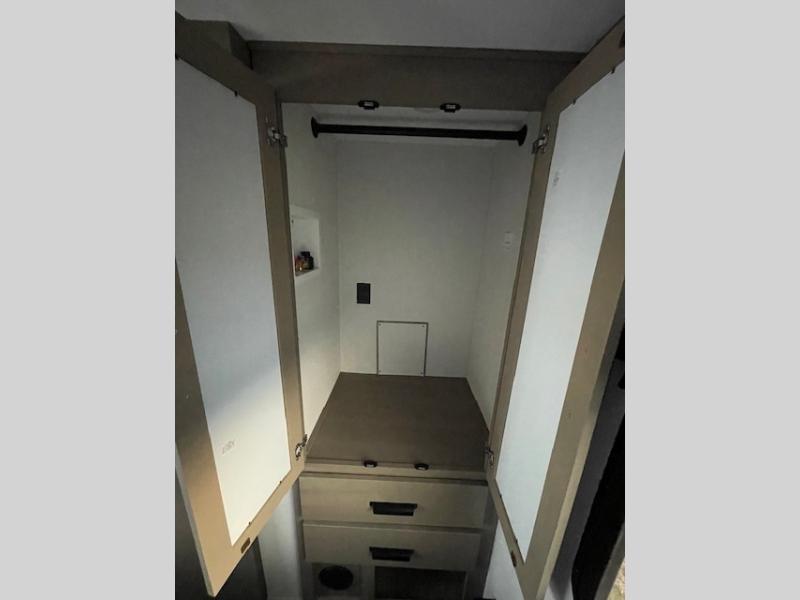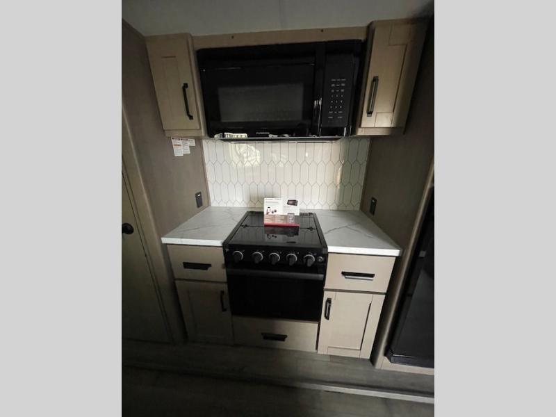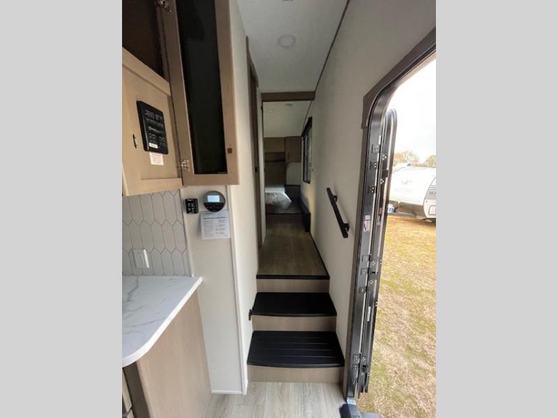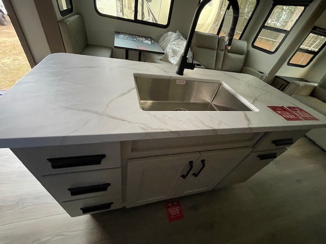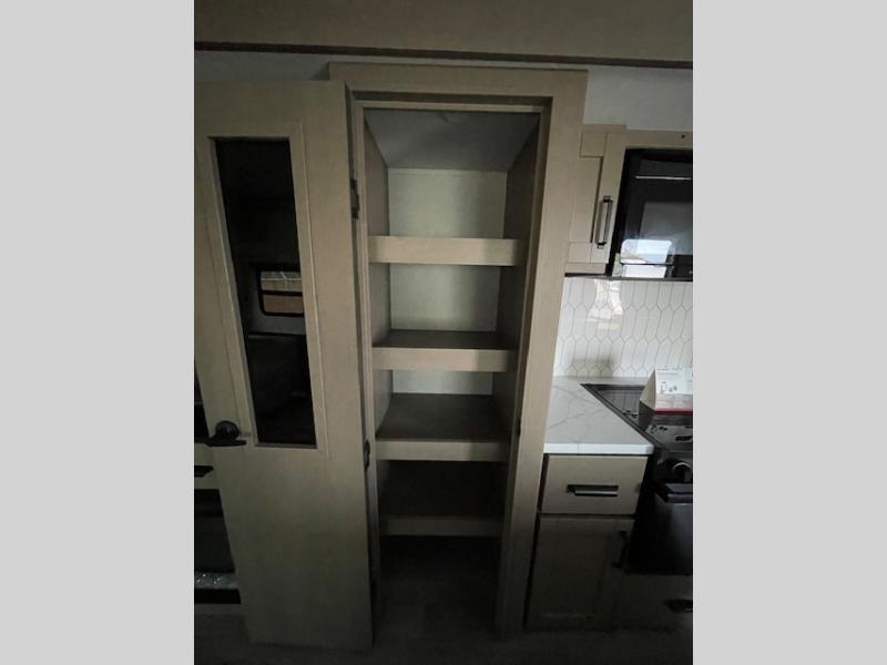 Get ready to enjoy everything the campgrounds and surrounding area has to offer when you are setup to camp in this fifth wheel! The two electric awnings offer protected areas creating outdoor living spaces; just grab your camping chairs from the unobstructed pass-through storage. And the interior offers a spacious living area and kitchen combination with dual opposing slides for maximum space. You can sit on the tri-fold sofa or the booth dinette with an option for a swivel dinette. The hutch and kitchen island offer counter space to prepare and serve meals, and there is a large pantry for goodies. The 40" LED HDTV with a fireplace below provides entertainment before bedtime or on a rainy day. And the front bedroom offers privacy, a walk-around queen bed, and plenty of storage!