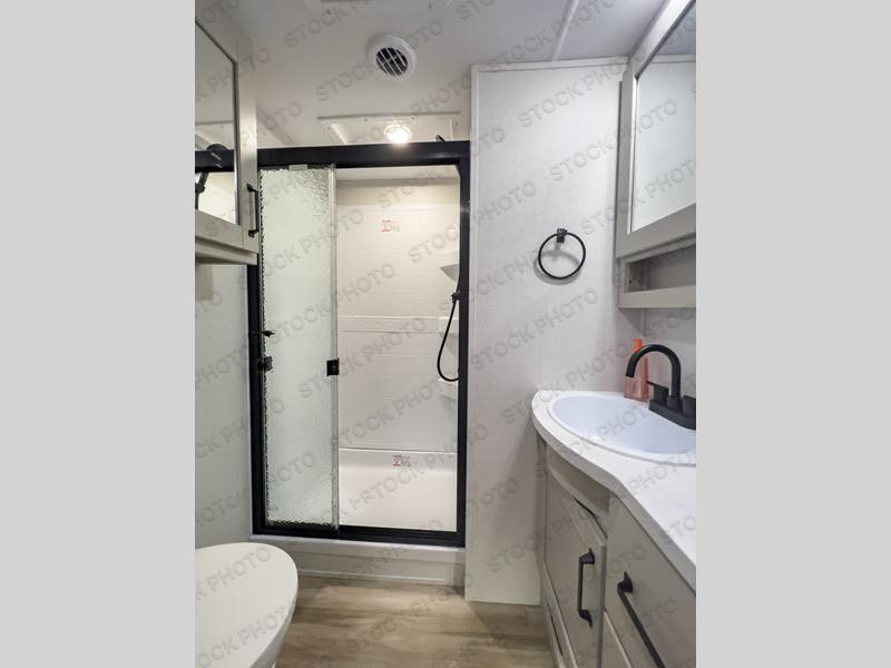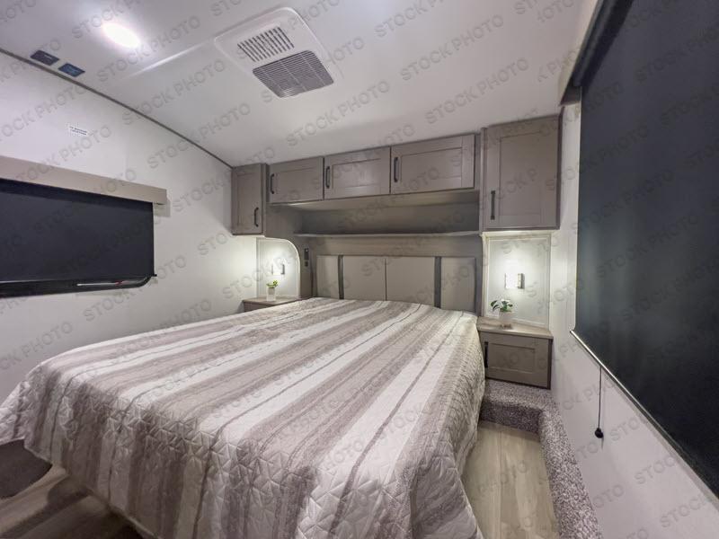 Get ready to enjoy everything the campgrounds and surrounding area has to offer when you are setup to camp in this fifth wheel! The two electric awnings offer protected areas creating outdoor living spaces; just grab your camping chairs from the unobstructed pass-through storage. And the interior offers a spacious living area and kitchen combination with dual opposing slides for maximum space. You can sit on the tri-fold sofa or the dinette to lounge back and rest after a day of adventure. The hutch and kitchen island offer counter space to prepare and serve meals, and there is a large pantry for goodies. The 40" LED HDTV with a fireplace below provides entertainment before bedtime or on a rainy day. And the front bedroom offers privacy, a walk-around queen bed, and plenty of storage!