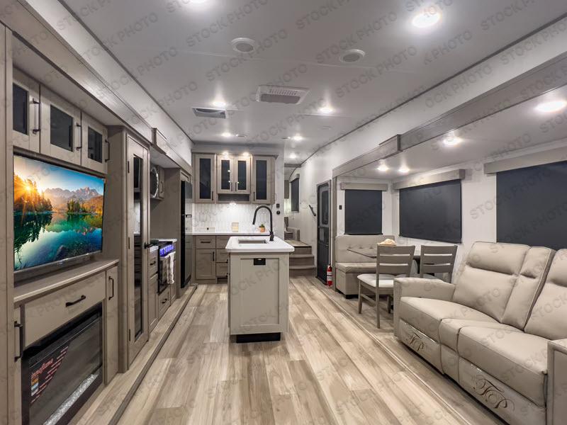 Get ready to enjoy everything the campgrounds and surrounding area has to offer when you are setup to camp in this fifth wheel! The two electric awnings offer protected areas creating outdoor living spaces; just grab your camping chairs from the unobstructed pass-through storage. And the interior offers a spacious living area and kitchen combination with dual opposing slides for maximum space. You can sit on the tri-fold sofa or the dinette to lounge back and rest after a day of adventure. The hutch and kitchen island offer counter space to prepare and serve meals, and there is a large pantry for goodies. The 40" LED HDTV with a fireplace below provides entertainment before bedtime or on a rainy day. And the front bedroom offers privacy, a walk-around queen bed, and plenty of storage!