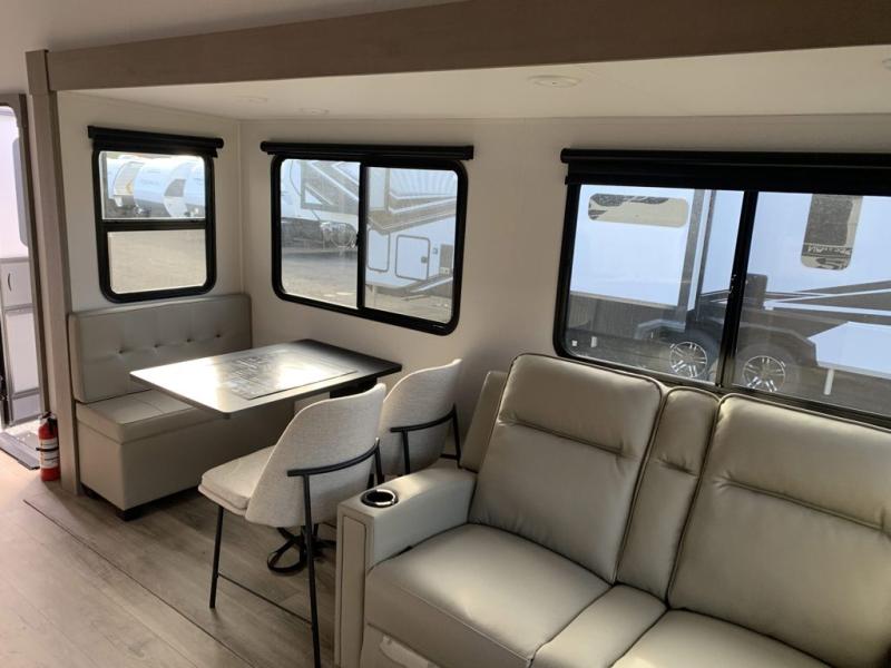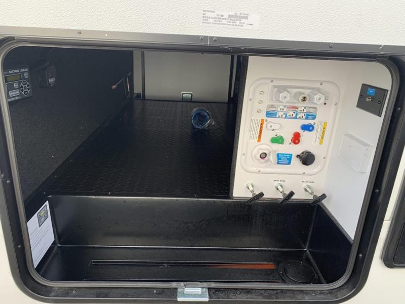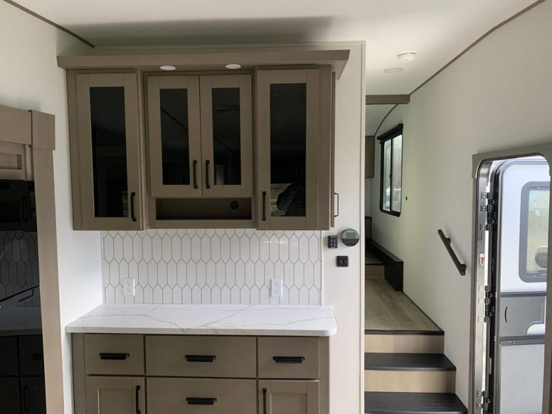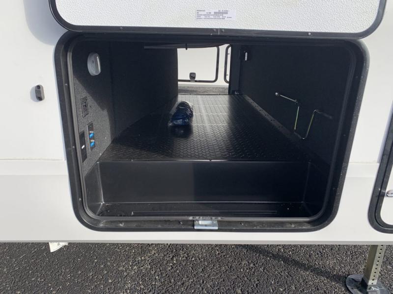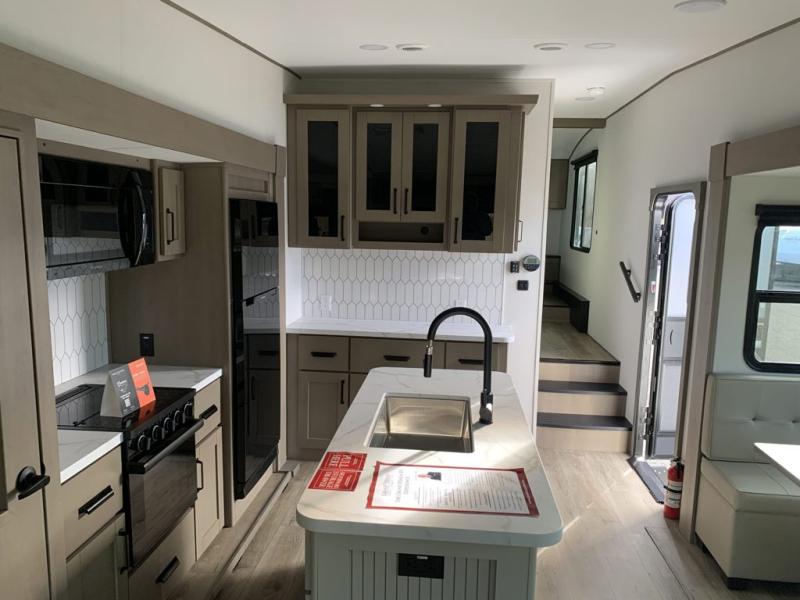 Get ready to enjoy everything the campgrounds and surrounding area has to offer when you are setup to camp in this fifth wheel! The two electric awnings offer protected areas creating outdoor living spaces; just grab your camping chairs from the unobstructed pass-through storage. And the interior offers a spacious living area and kitchen combination with dual opposing slides for maximum space. You can sit on the tri-fold sofa or the dinette to lounge back and rest after a day of adventure. The hutch and kitchen island offer counter space to prepare and serve meals, and there is a large pantry for goodies. The 40" LED HDTV with a fireplace below provides entertainment before bedtime or on a rainy day. And the front bedroom offers privacy, a walk-around queen bed, and plenty of storage!
