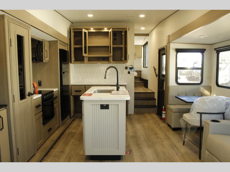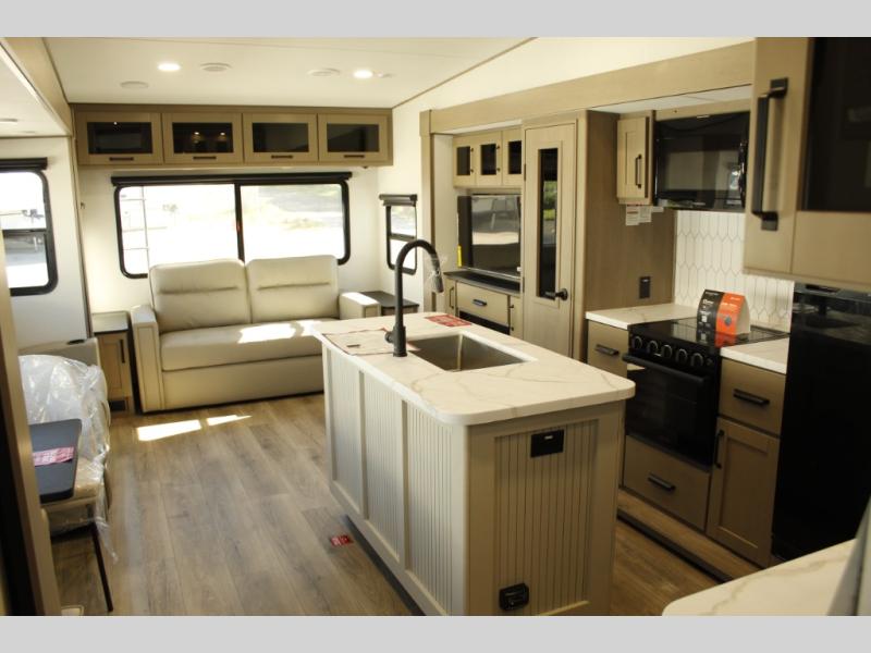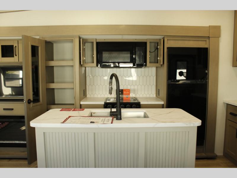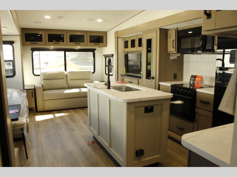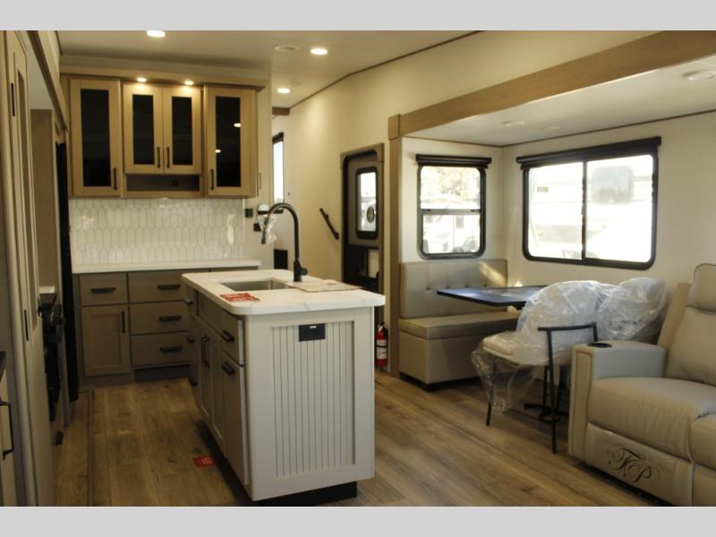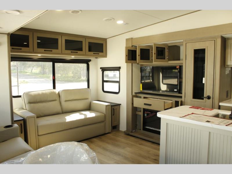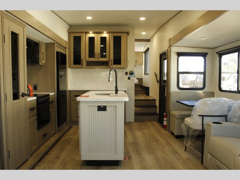 Get ready to enjoy everything the campgrounds and surrounding area has to offer when you are setup to camp in this fifth wheel! The two electric awnings offer protected areas creating outdoor living spaces; just grab your camping chairs from the unobstructed pass-through storage. And the interior offers a spacious living area and kitchen combination with dual opposing slides for maximum space. You can sit on the tri-fold sofa or the dinette to lounge back and rest after a day of adventure. The hutch and kitchen island offer counter space to prepare and serve meals, and there is a large pantry for goodies. The 40" LED HDTV with a fireplace below provides entertainment before bedtime or on a rainy day. And the front bedroom offers privacy, a walk-around queen bed, and plenty of storage!