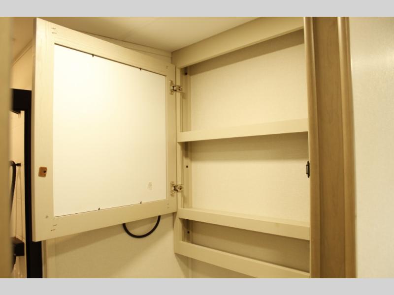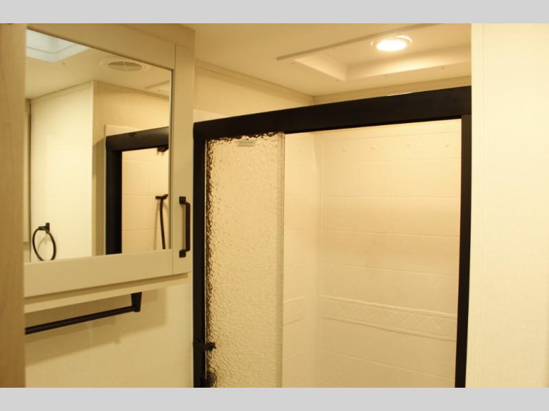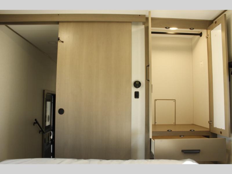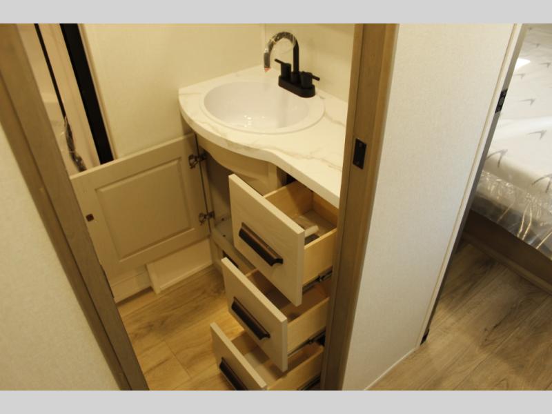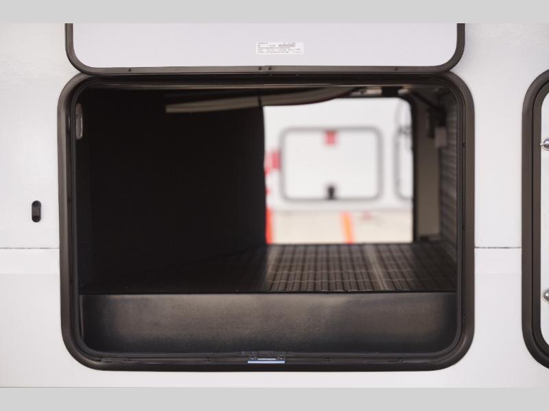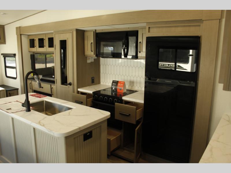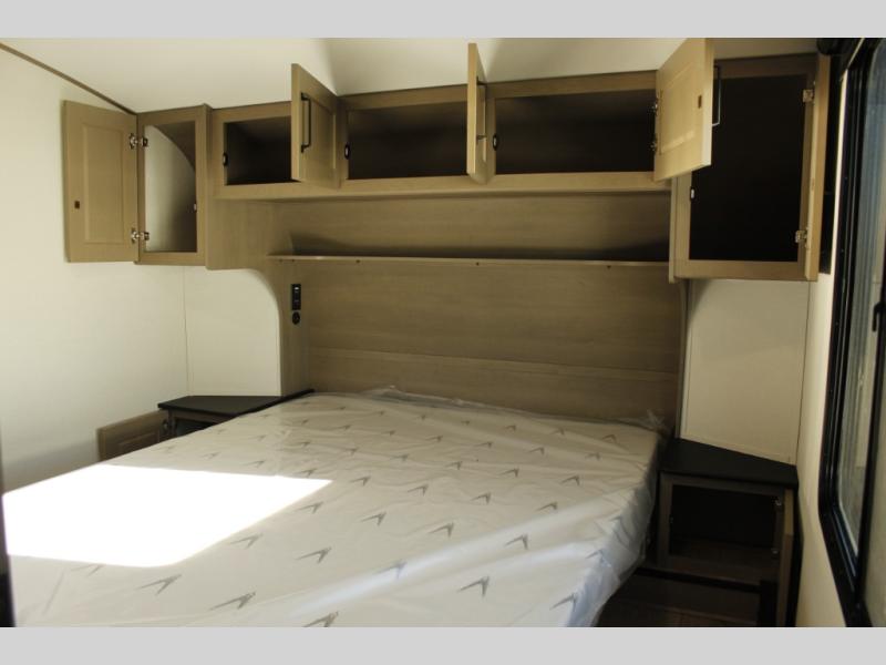 Get ready to enjoy everything the campgrounds and surrounding area has to offer when you are setup to camp in this fifth wheel! The two electric awnings offer protected areas creating outdoor living spaces; just grab your camping chairs from the unobstructed pass-through storage. And the interior offers a spacious living area and kitchen combination with dual opposing slides for maximum space. You can sit on the tri-fold sofa or the dinette to lounge back and rest after a day of adventure. The hutch and kitchen island offer counter space to prepare and serve meals, and there is a large pantry for goodies. The 40" LED HDTV with a fireplace below provides entertainment before bedtime or on a rainy day. And the front bedroom offers privacy, a walk-around queen bed, and plenty of storage!
