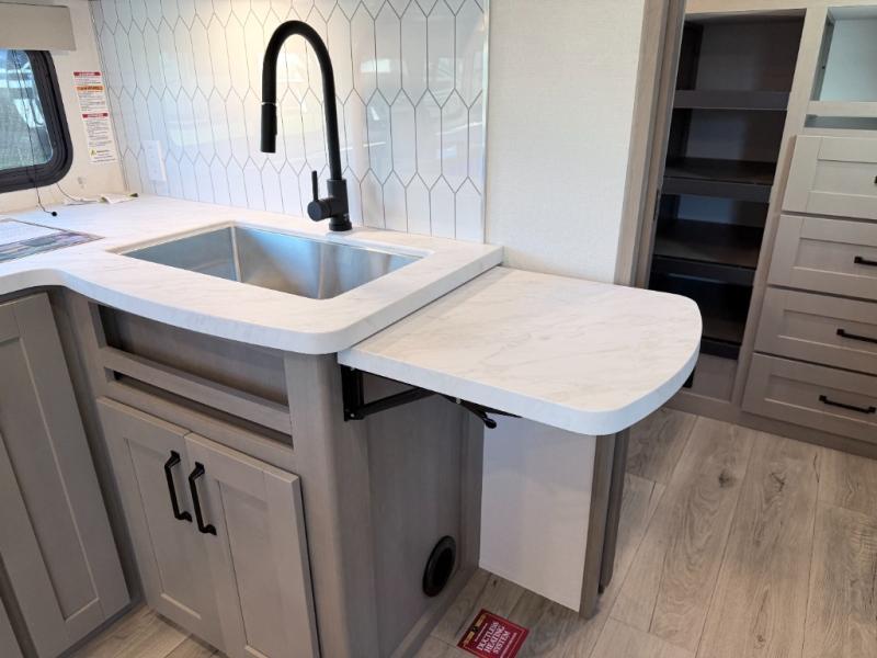 - Kitchen with flip-up countertop, three burner cooktop, and generous storage