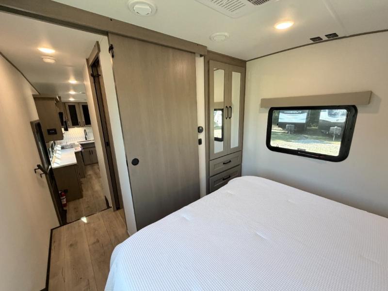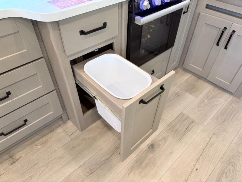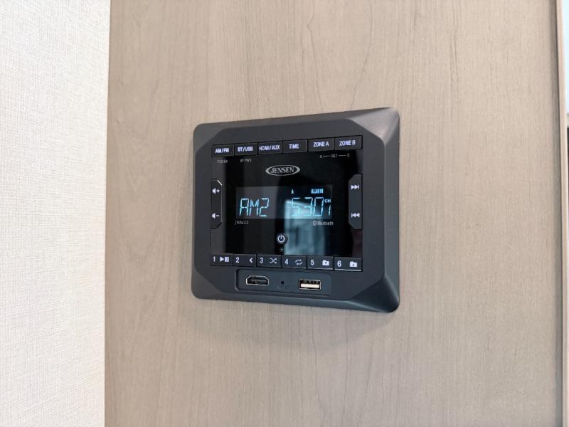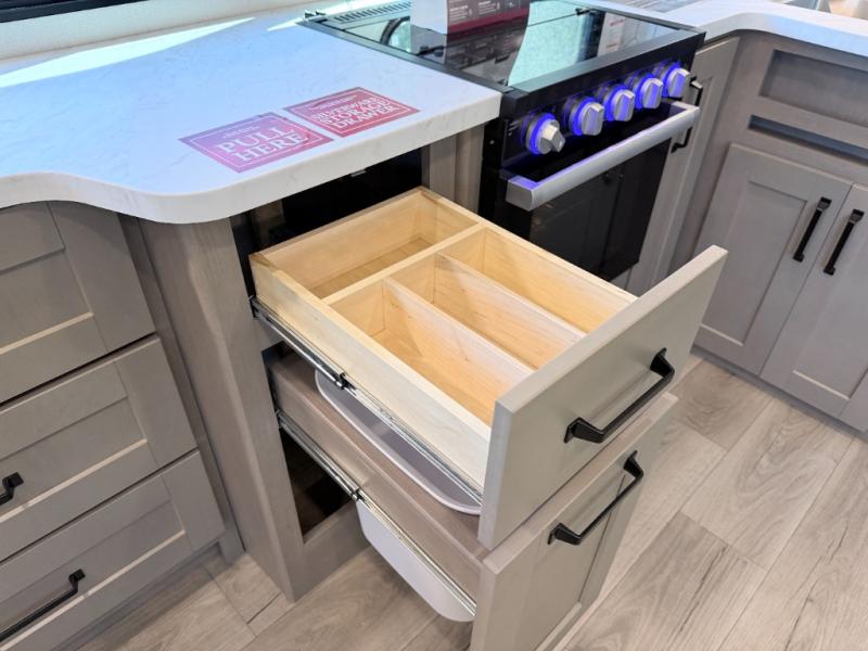 - Rear private bunkhouse with 30" and 34" top bunks over lower bunks, storage drawers, and TV prep