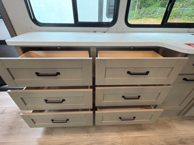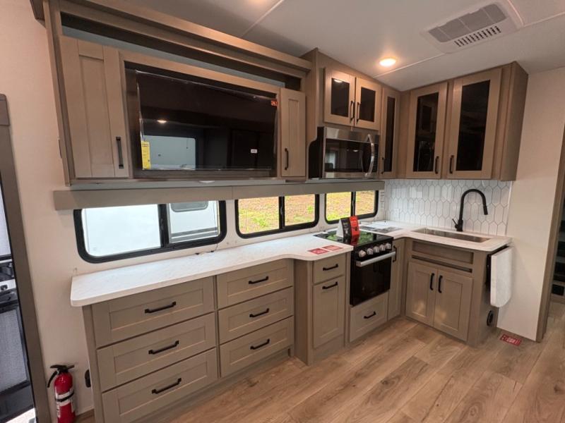 The whole family will enjoy camping in this fifth wheel! The kiddos will love having their own privacy with the rear private bunkhouse that has a 30" top bunk above a set of drawers, a 34" top bunk above a 48" lower bunk, and a TV prep area. You will enjoy having your own private retreat too with a front private bedroom that has a queen bed for a good night's rest and a wardrobe for your hang up clothes. You could even transform the U-shaped dinette and tri-fold sofa into extra sleeping spaces, and the dinette could be switched out for the optional 78" theater seating. The chef will have an easy time preparing their best dishes with the three burner cooktop and flip-up countertop or they can breathe in some fresh air while they cook at the outside kitchen with a griddle and 1.6 cu. ft. refrigerator for a cold beverage!