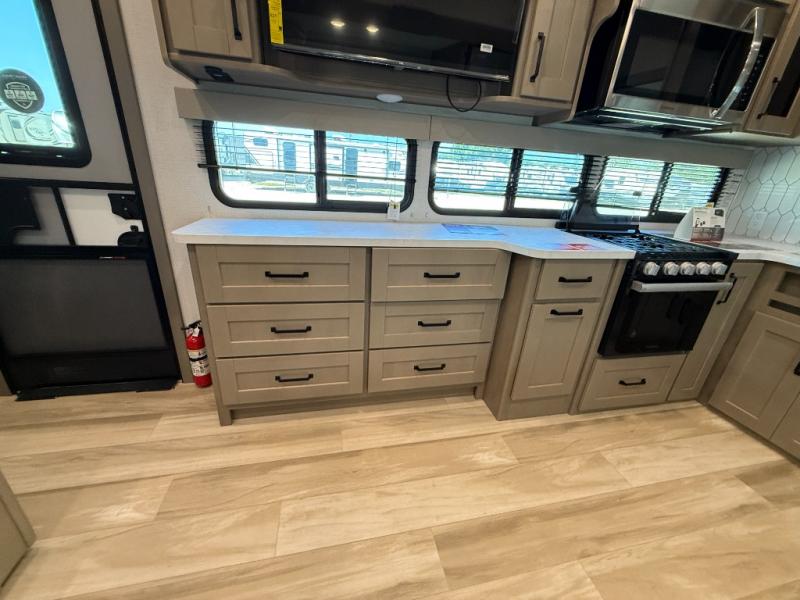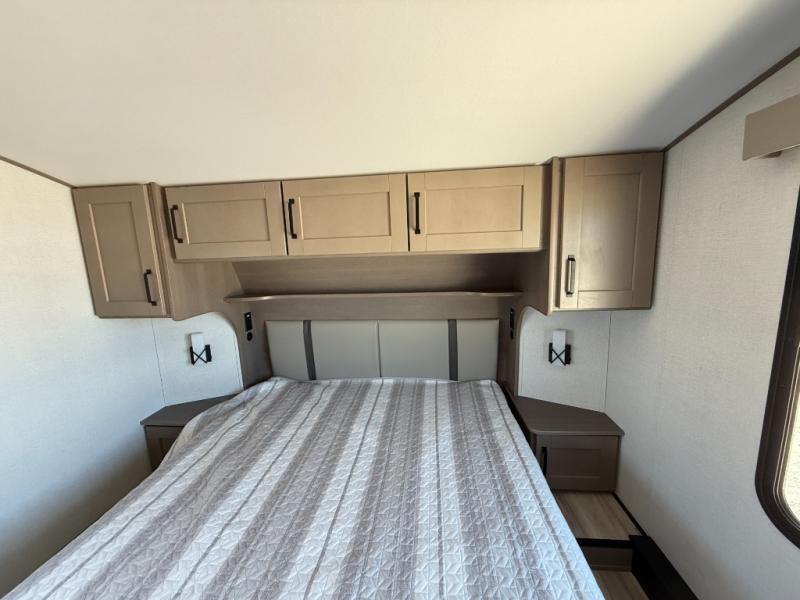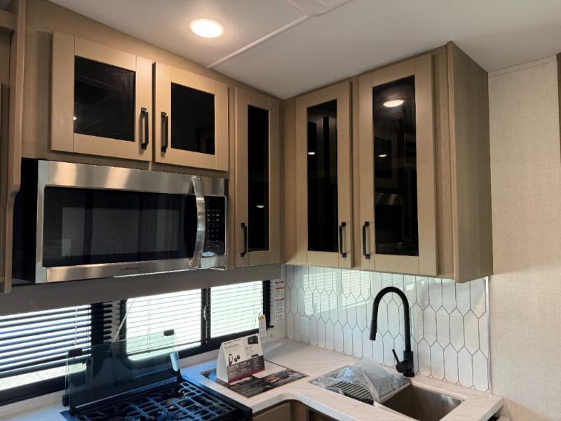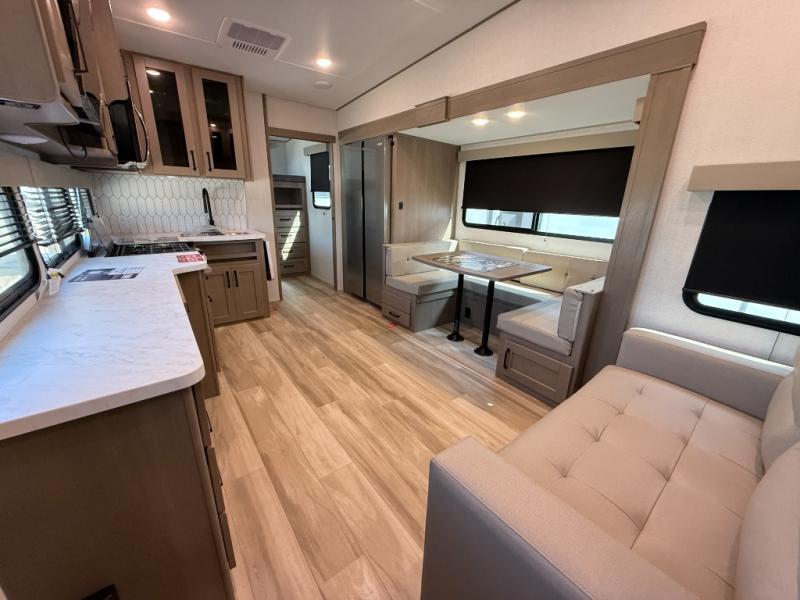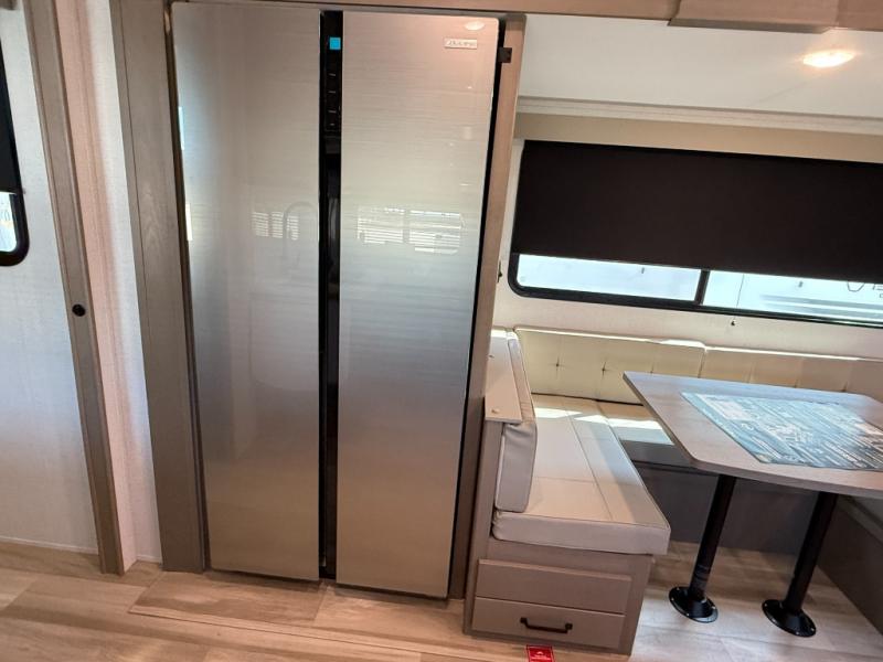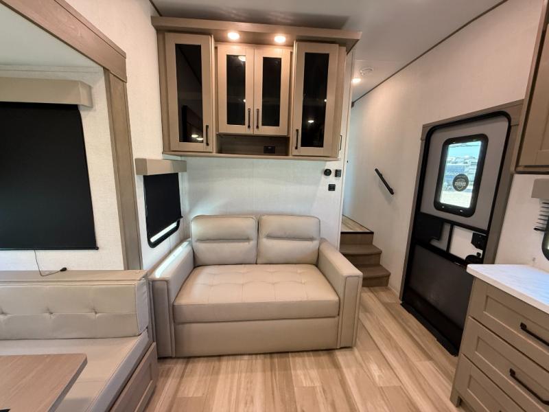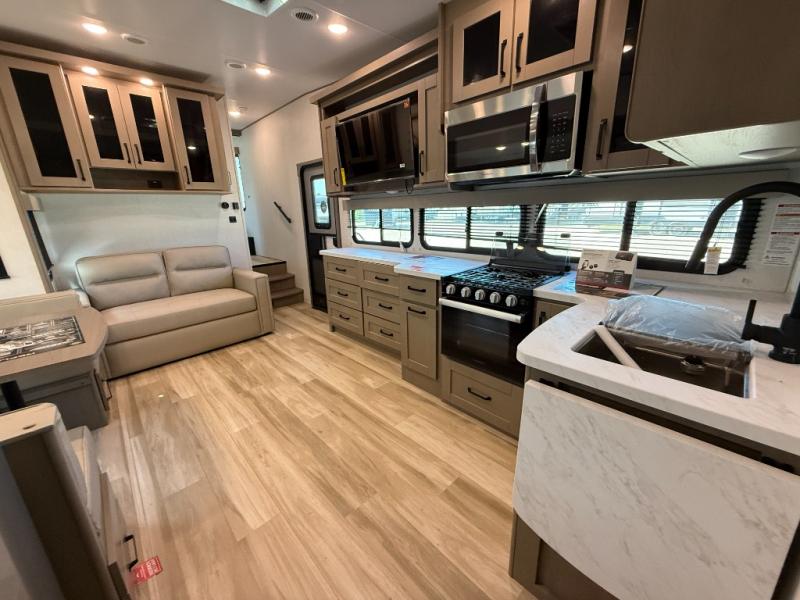 With any Reflection 150 Series fifth wheel by Grand Design, there is more available payload capacity and a broader range of half-ton trucks capable of towing this fifth wheel, and no slider hitch is needed thanks to the 90-degree turning radius which makes them short bed friendly and easier to tow. The mandatory Ultimate Power package provides a "One-Touch" automatic leveling system and a detachable power cord with LED light for easy setup, plus motion sensor pass-through lighting and entry lighting, and the Tire Linc TPMS will help you stay safe on the road. The interior offers residential luxury from the cabinetry and premium Congoleum flooring, to the booth dinette and residential-style window treatment. Make your refined decision today!