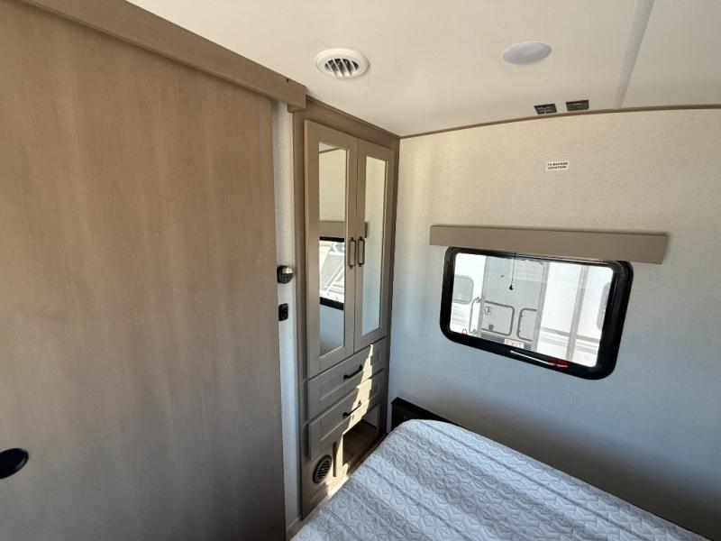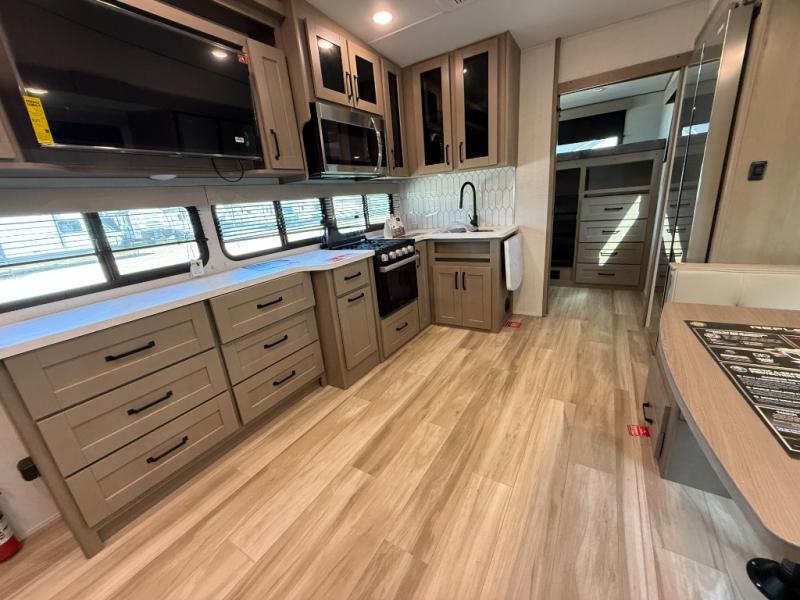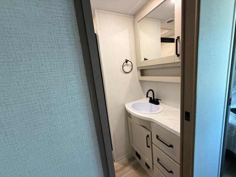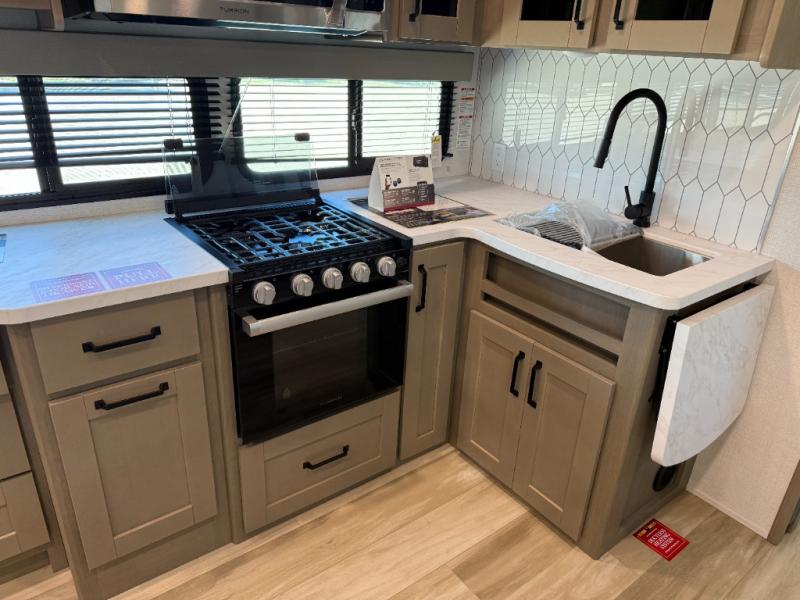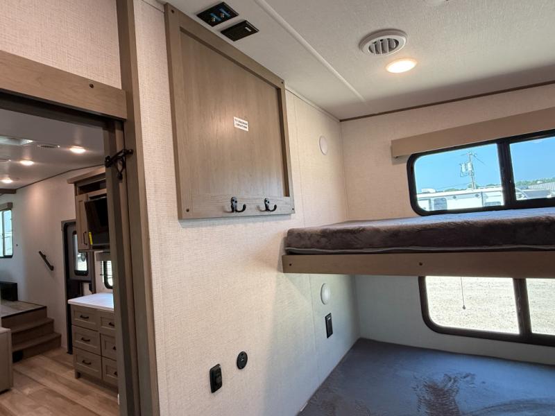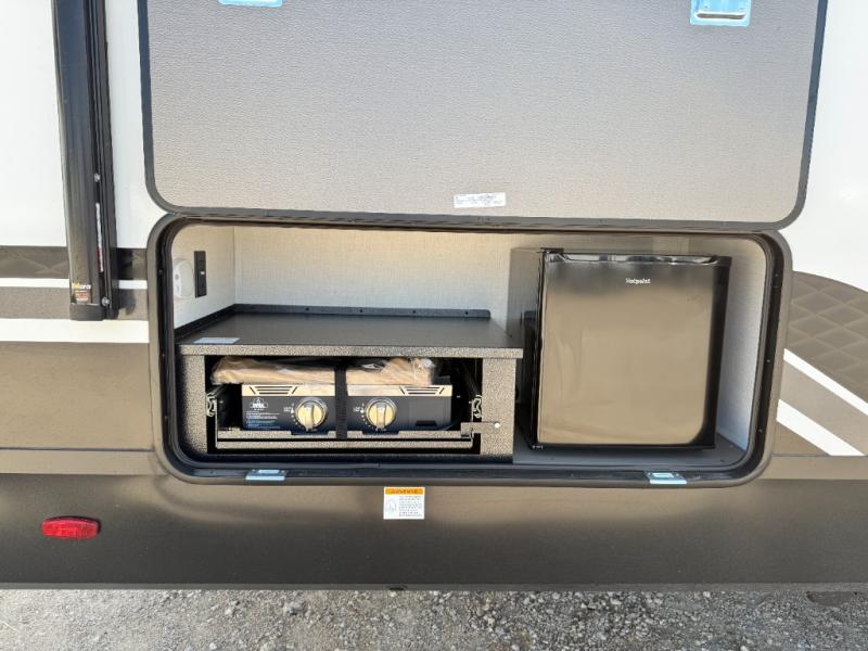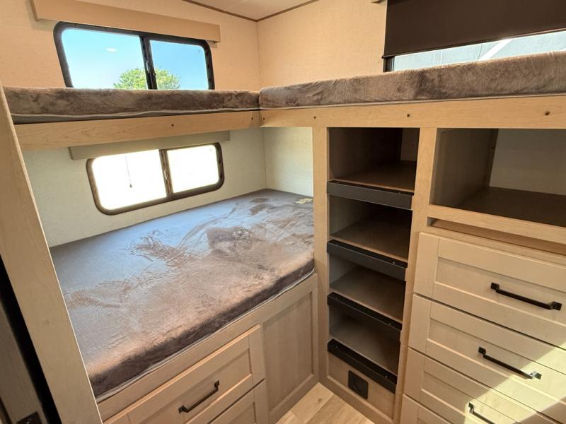 The whole family will enjoy camping in this fifth wheel! The kiddos will love having their own privacy with the rear private bunkhouse that has a 30" top bunk above a set of drawers, a 34" top bunk above a 48" lower bunk, and a TV prep area. You will enjoy having your own private retreat too with a front private bedroom that has a queen bed for a good night's rest and a wardrobe for your hang up clothes. You could even transform the U-shaped dinette and tri-fold sofa into extra sleeping spaces, and the dinette could be switched out for the optional 78" theater seating. The chef will have an easy time preparing their best dishes with the three burner cooktop and flip-up countertop or they can breathe in some fresh air while they cook at the outside kitchen with a griddle and 1.6 cu. ft. refrigerator for a cold beverage!