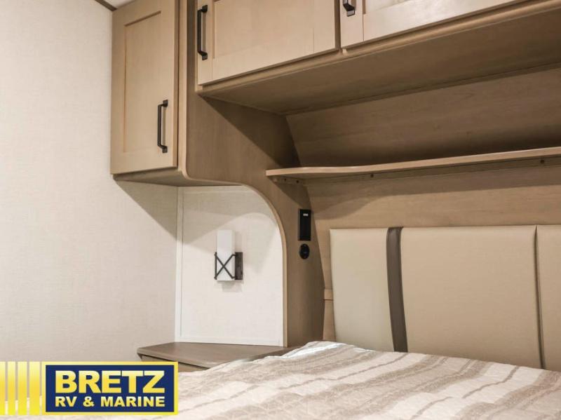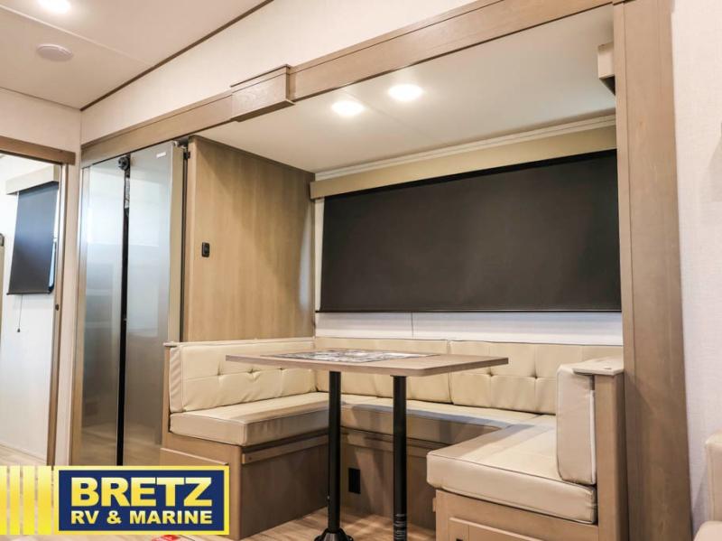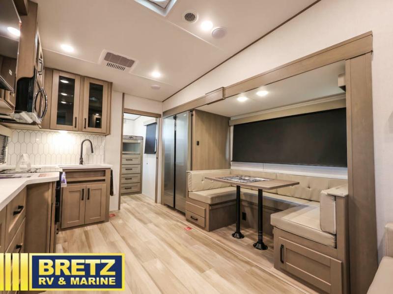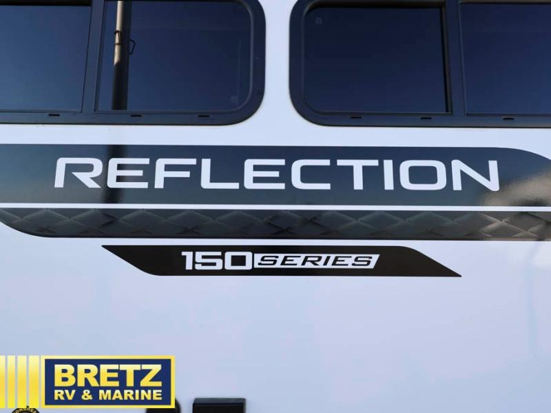 With any Reflection 150 Series fifth wheel by Grand Design, there is more available payload capacity and a broader range of half-ton trucks capable of towing this fifth wheel, and no slider hitch is needed thanks to the 90-degree turning radius which makes them short bed friendly and easier to tow. The mandatory Ultimate Power package provides a "One-Touch" automatic leveling system and a detachable power cord with LED light for easy setup, plus motion sensor pass-through lighting and entry lighting, and the Tire Linc TPMS will help you stay safe on the road. The interior offers residential luxury from the cabinetry and premium Congoleum flooring, to the booth dinette and residential-style window treatment. Make your refined decision today!