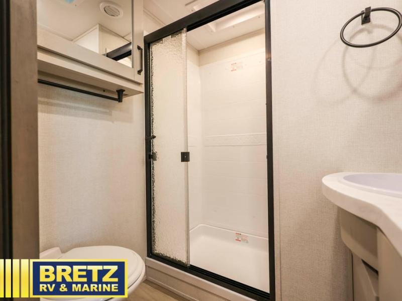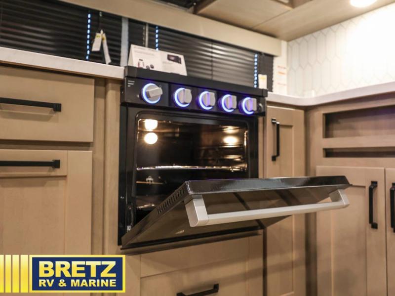 The whole family will enjoy camping in this fifth wheel! The kiddos will love having their own privacy with the rear private bunkhouse that has a 30" top bunk above a set of drawers, a 34" top bunk above a 48" lower bunk, and a TV prep area. You will enjoy having your own private retreat too with a front private bedroom that has a queen bed for a good night's rest and a wardrobe for your hang up clothes. You could even transform the U-shaped dinette and tri-fold sofa into extra sleeping spaces, and the dinette could be switched out for the optional 78" theater seating. The chef will have an easy time preparing their best dishes with the three burner cooktop and flip-up countertop or they can breathe in some fresh air while they cook at the outside kitchen with a griddle and 1.6 cu. ft. refrigerator for a cold beverage!
