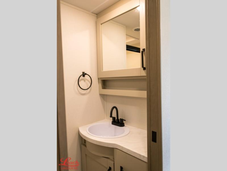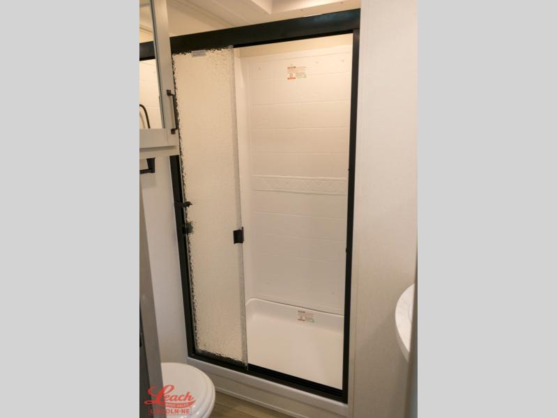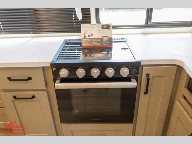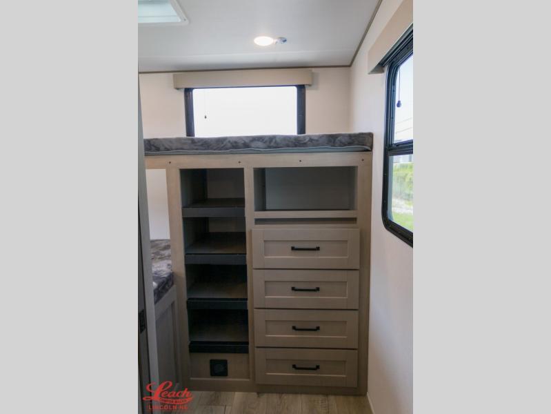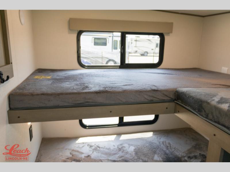 The whole family will enjoy camping in this fifth wheel! The kiddos will love having their own privacy with the rear private bunkhouse that has a 30" top bunk above a set of drawers, a 34" top bunk above a 48" lower bunk, and a TV prep area. You will enjoy having your own private retreat too with a front private bedroom that has a queen bed for a good night's rest and a wardrobe for your hang up clothes. You could even transform the U-shaped dinette and tri-fold sofa into extra sleeping spaces, and the dinette could be switched out for the optional 78" theater seating. The chef will have an easy time preparing their best dishes with the three burner cooktop and flip-up countertop or they can breathe in some fresh air while they cook at the outside kitchen with a griddle and 1.6 cu. ft. refrigerator for a cold beverage!