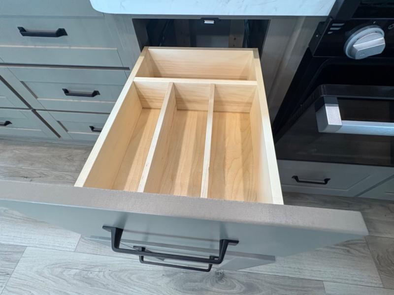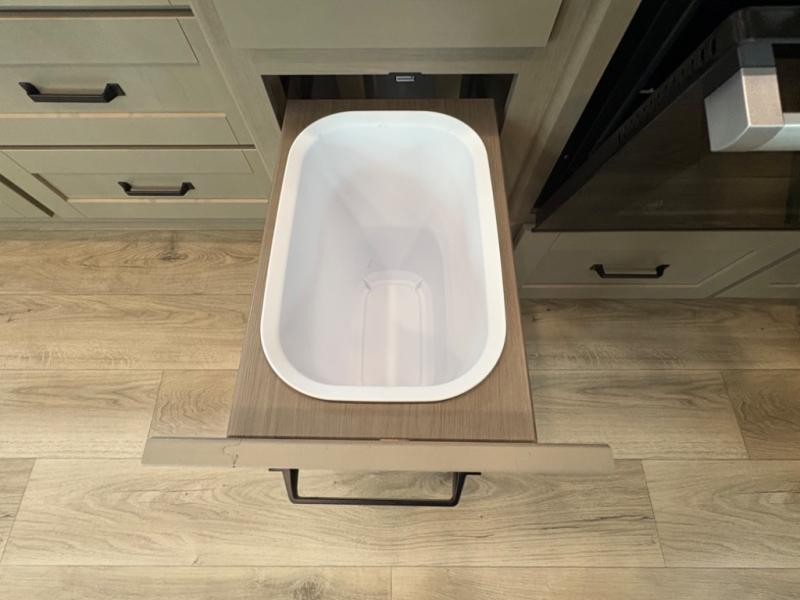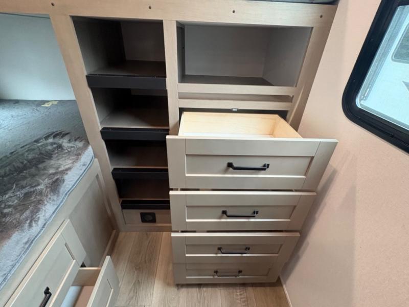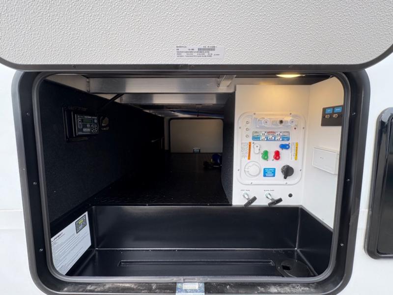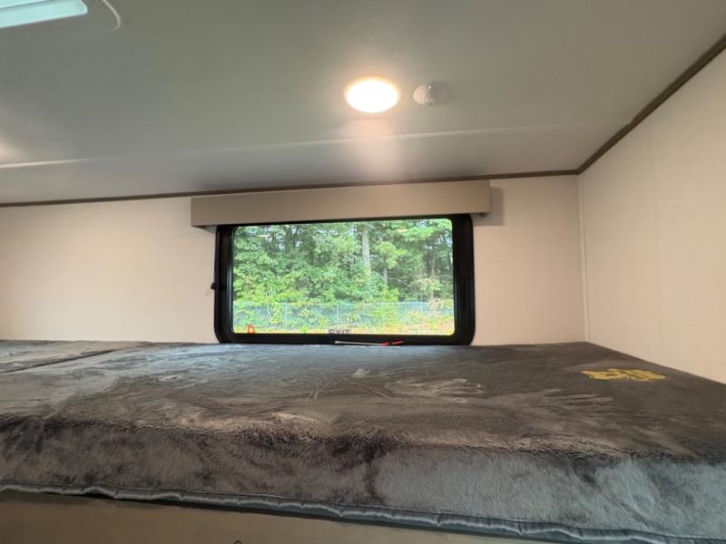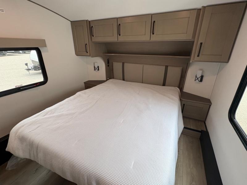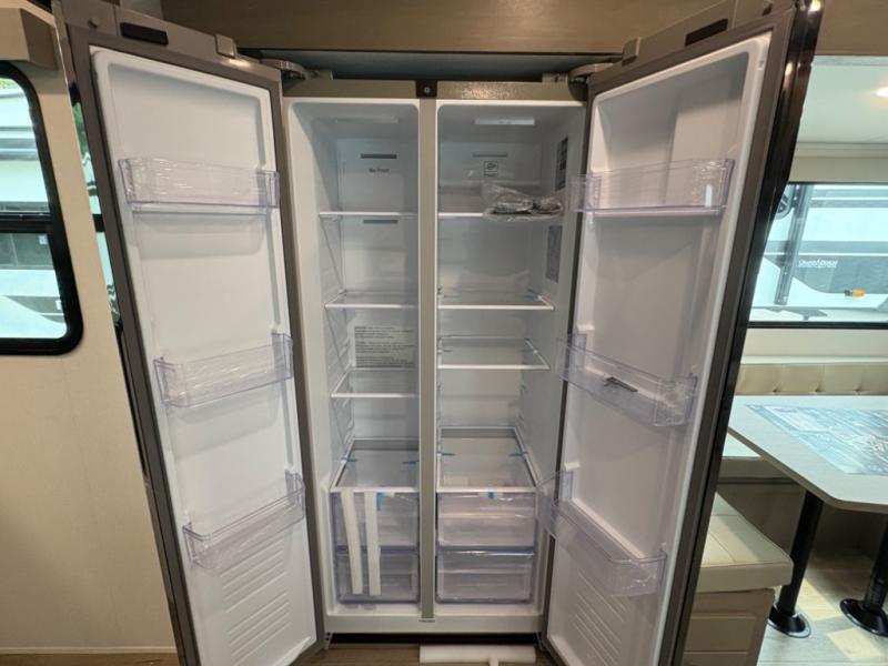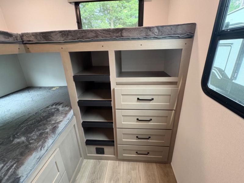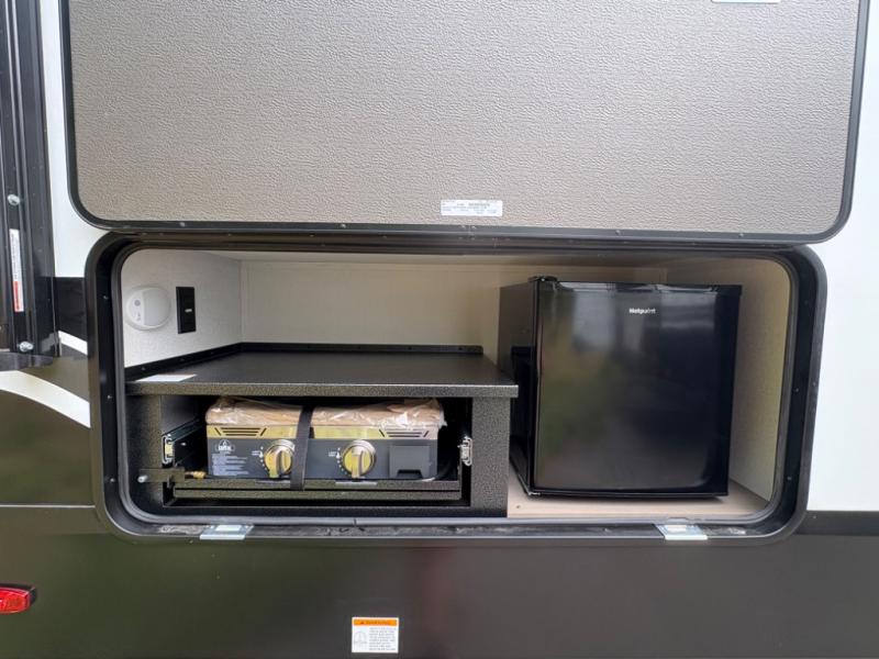 The whole family will enjoy camping in this fifth wheel! The kiddos will love having their own privacy with the rear private bunkhouse that has a 30" top bunk above a set of drawers, a 34" top bunk above a 48" lower bunk, and a TV prep area. You will enjoy having your own private retreat too with a front private bedroom that has a queen bed for a good night's rest and a wardrobe for your hang up clothes. You could even transform the U-shaped dinette and tri-fold sofa into extra sleeping spaces, and the dinette could be switched out for the optional 78" theater seating. The chef will have an easy time preparing their best dishes with the three burner cooktop and flip-up countertop or they can breathe in some fresh air while they cook at the outside kitchen with a griddle and 1.6 cu. ft. refrigerator for a cold beverage!