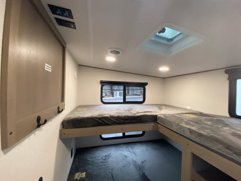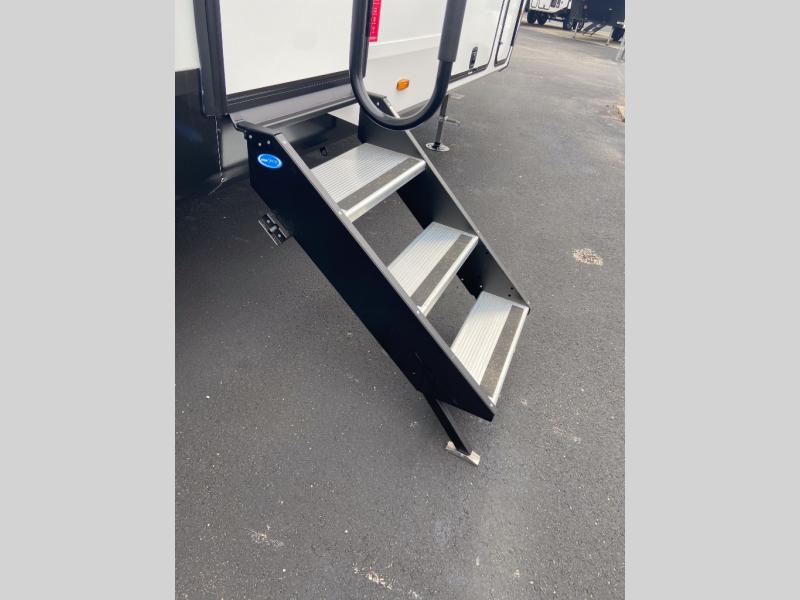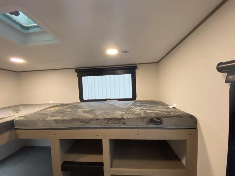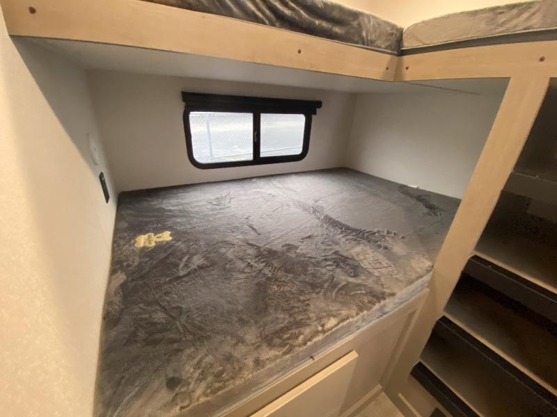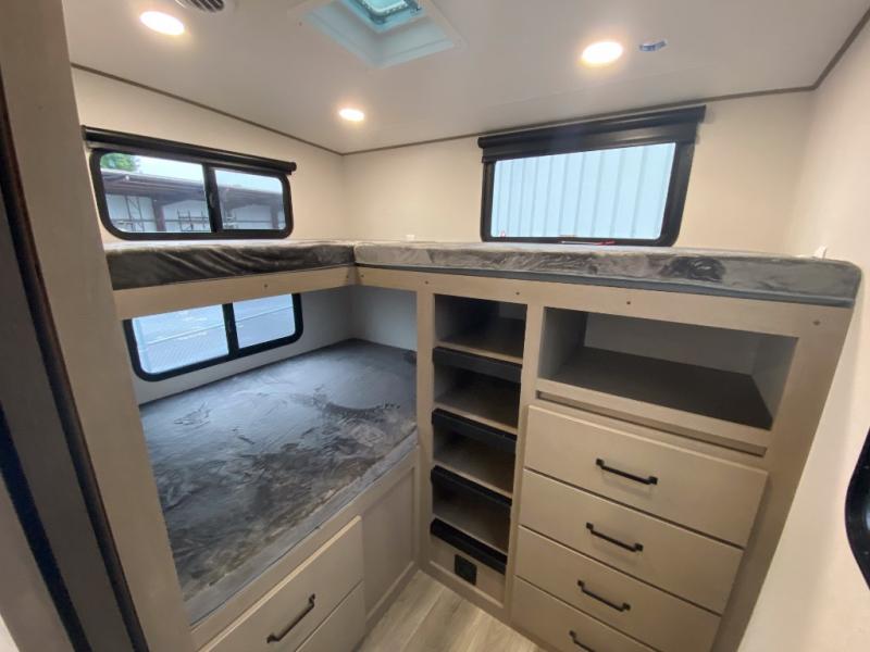 The whole family will enjoy camping in this fifth wheel! The kiddos will love having their own privacy with the rear private bunkhouse that has a 30" top bunk above a set of drawers, a 34" top bunk above a 48" lower bunk, and a TV prep area. You will enjoy having your own private retreat too with a front private bedroom that has a queen bed for a good night's rest and a wardrobe for your hang up clothes. You could even transform the U-shaped dinette and tri-fold sofa into extra sleeping spaces, and the dinette could be switched out for the optional 78" theater seating. The chef will have an easy time preparing their best dishes with the three burner cooktop and flip-up countertop or they can breathe in some fresh air while they cook at the outside kitchen with a griddle and 1.6 cu. ft. refrigerator for a cold beverage!