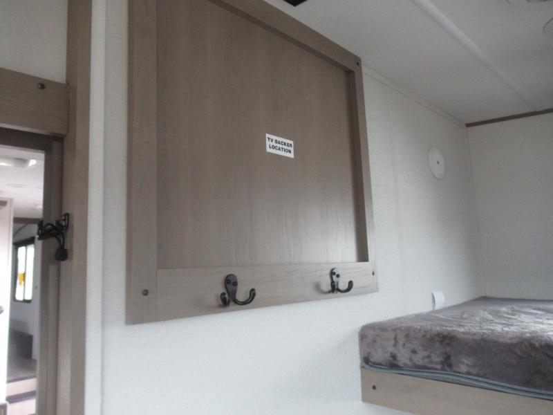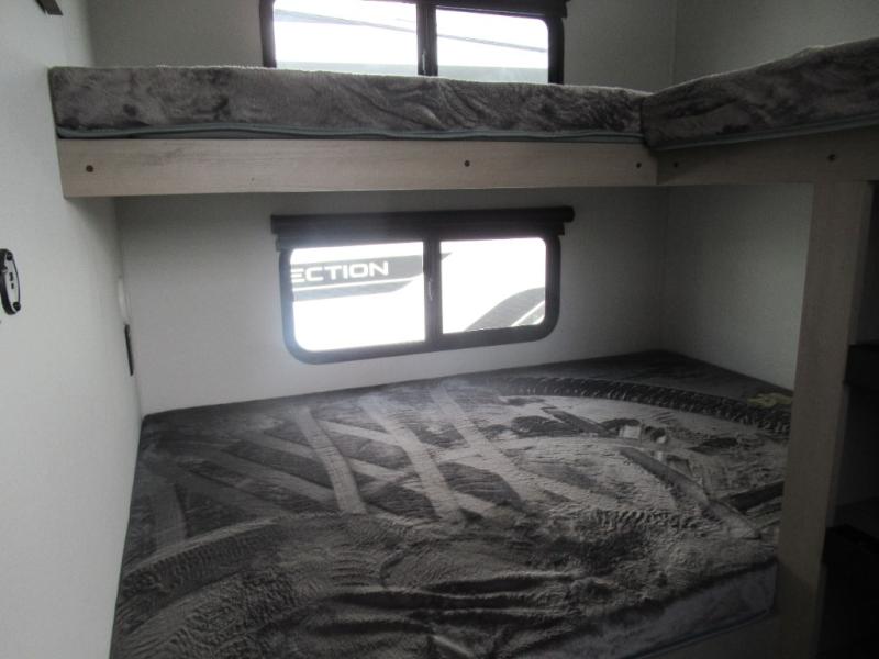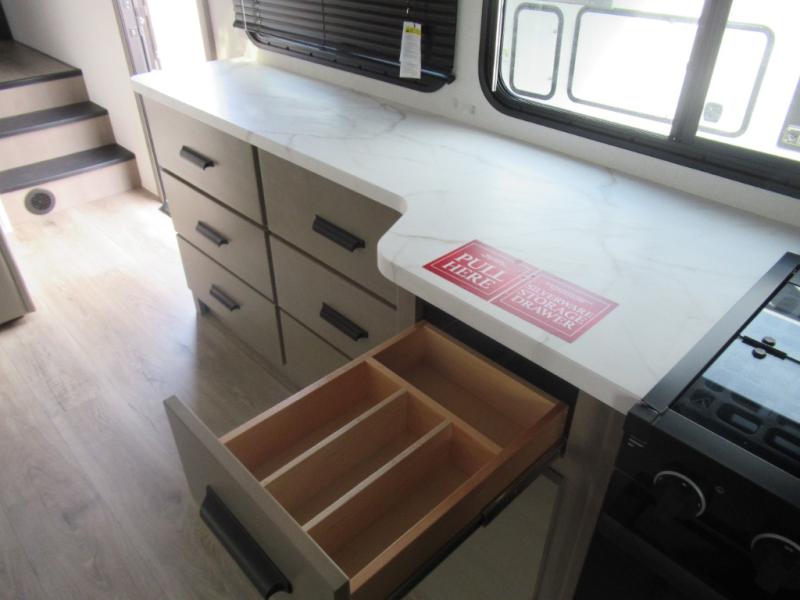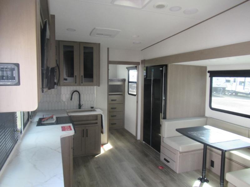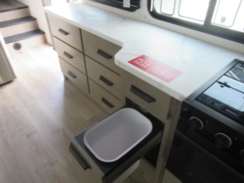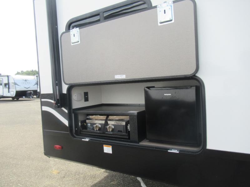 The whole family will enjoy camping in this fifth wheel! The kiddos will love having their own privacy with the rear private bunkhouse that has a 30" top bunk above a set of drawers, a 34" top bunk above a 48" lower bunk, and a TV prep area. You will enjoy having your own private retreat too with a front private bedroom that has a queen bed for a good night's rest and a wardrobe for your hang up clothes. You could even transform the U-shaped dinette and tri-fold sofa into extra sleeping spaces, and the dinette could be switched out for the optional 78" theater seating. The chef will have an easy time preparing their best dishes with the three burner cooktop and flip-up countertop or they can breathe in some fresh air while they cook at the outside kitchen with a griddle and 1.6 cu. ft. refrigerator for a cold beverage!